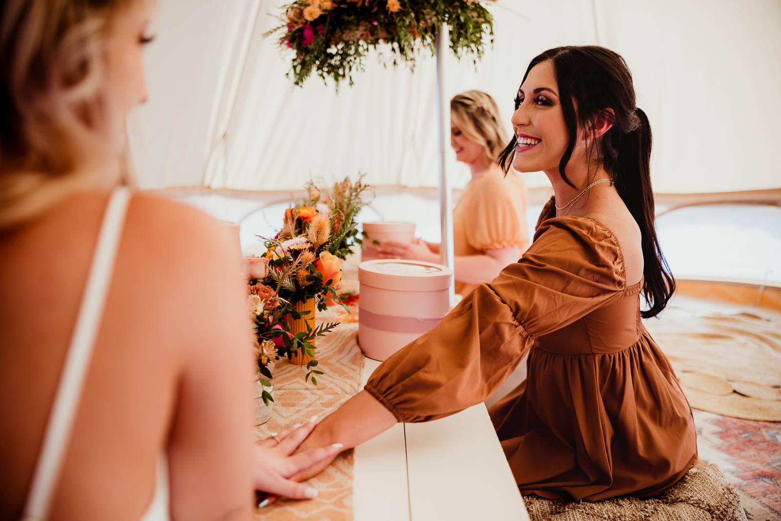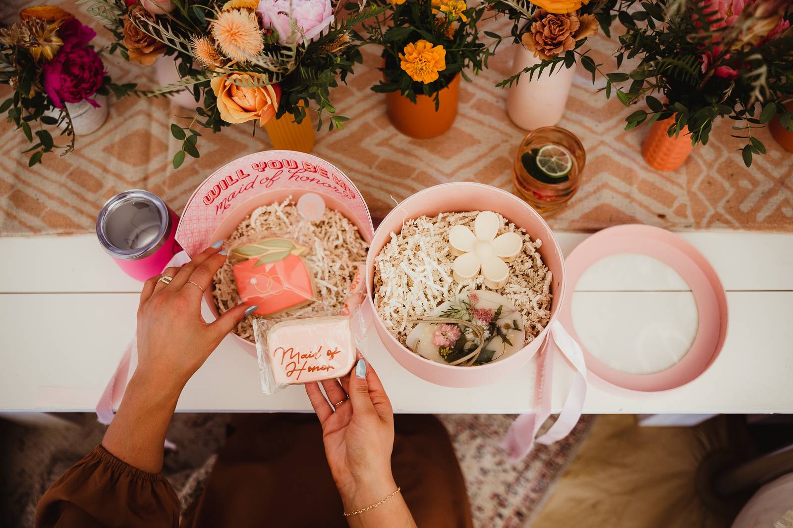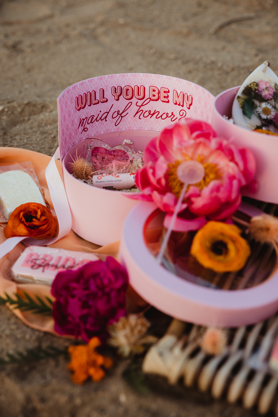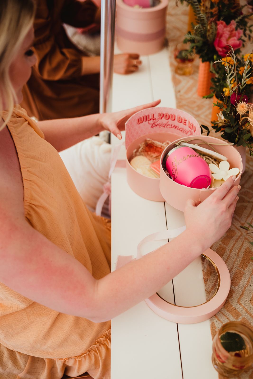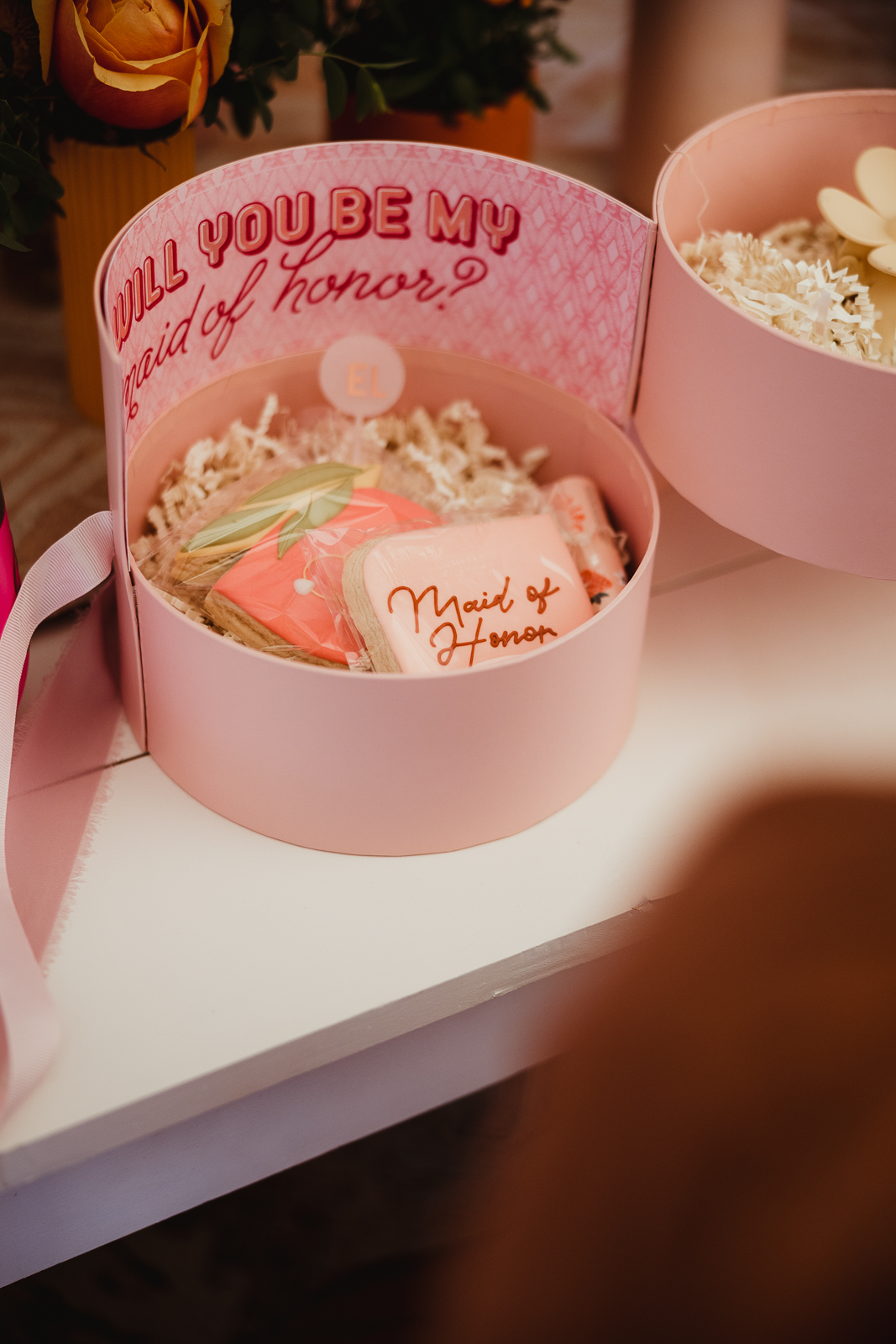 We’re pretty sure it doesn’t get any cuter than this modern spin on custom Ask Boxes to propose to your bridal party! LK Bridal Studio personalized beautiful, round, pink, two-tier boxes with a clear top for your soon-to-be bridesmaids to peek at all the gifted goodies inside! Once open, the box reveals a second tier, which opens to ask the important question, “Will you be my bridesmaid?” Playful bubble lettering and lovely script font in a vibrant, bold shade of pink perfectly match the palette and feel of the celebration.