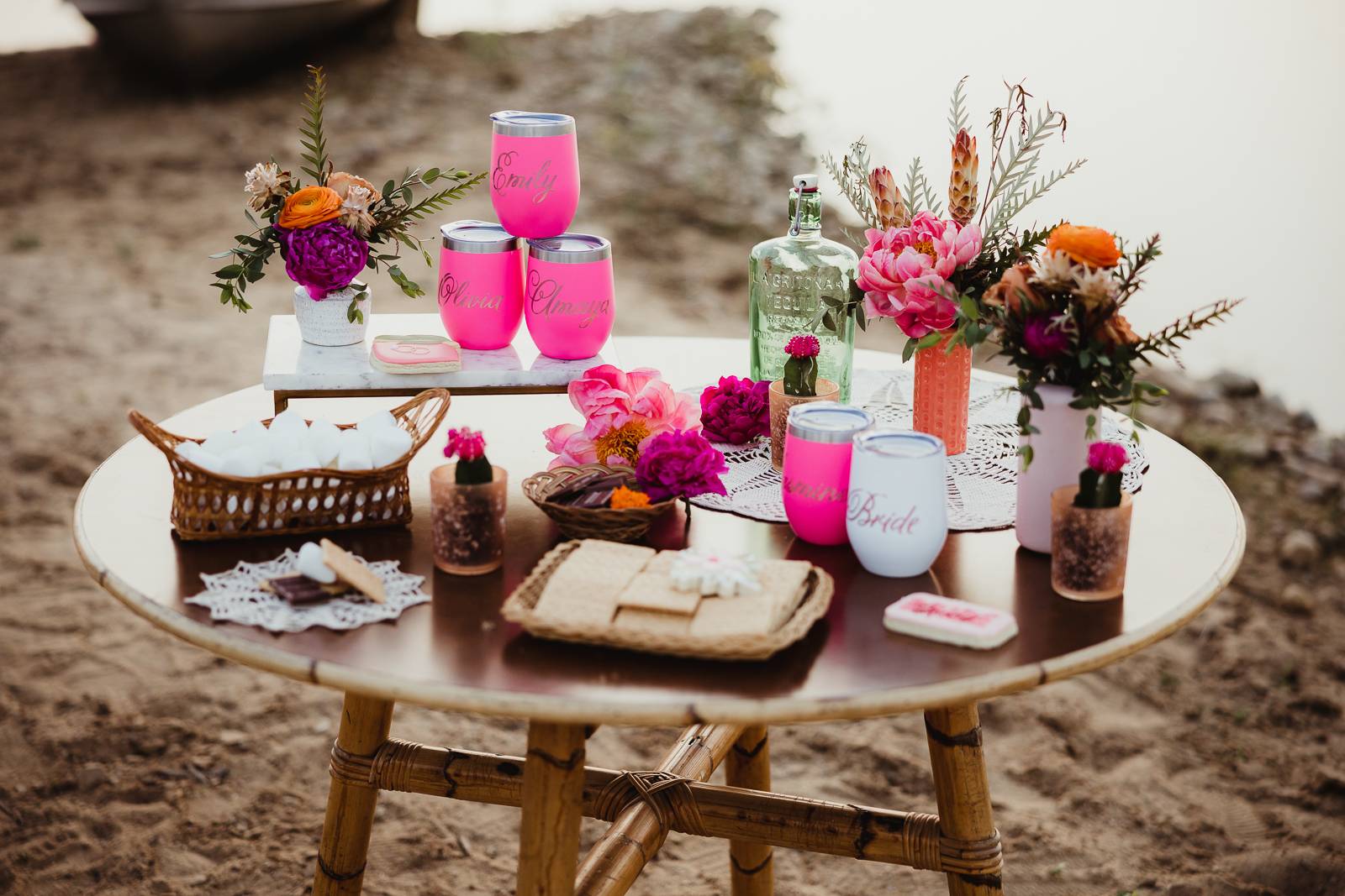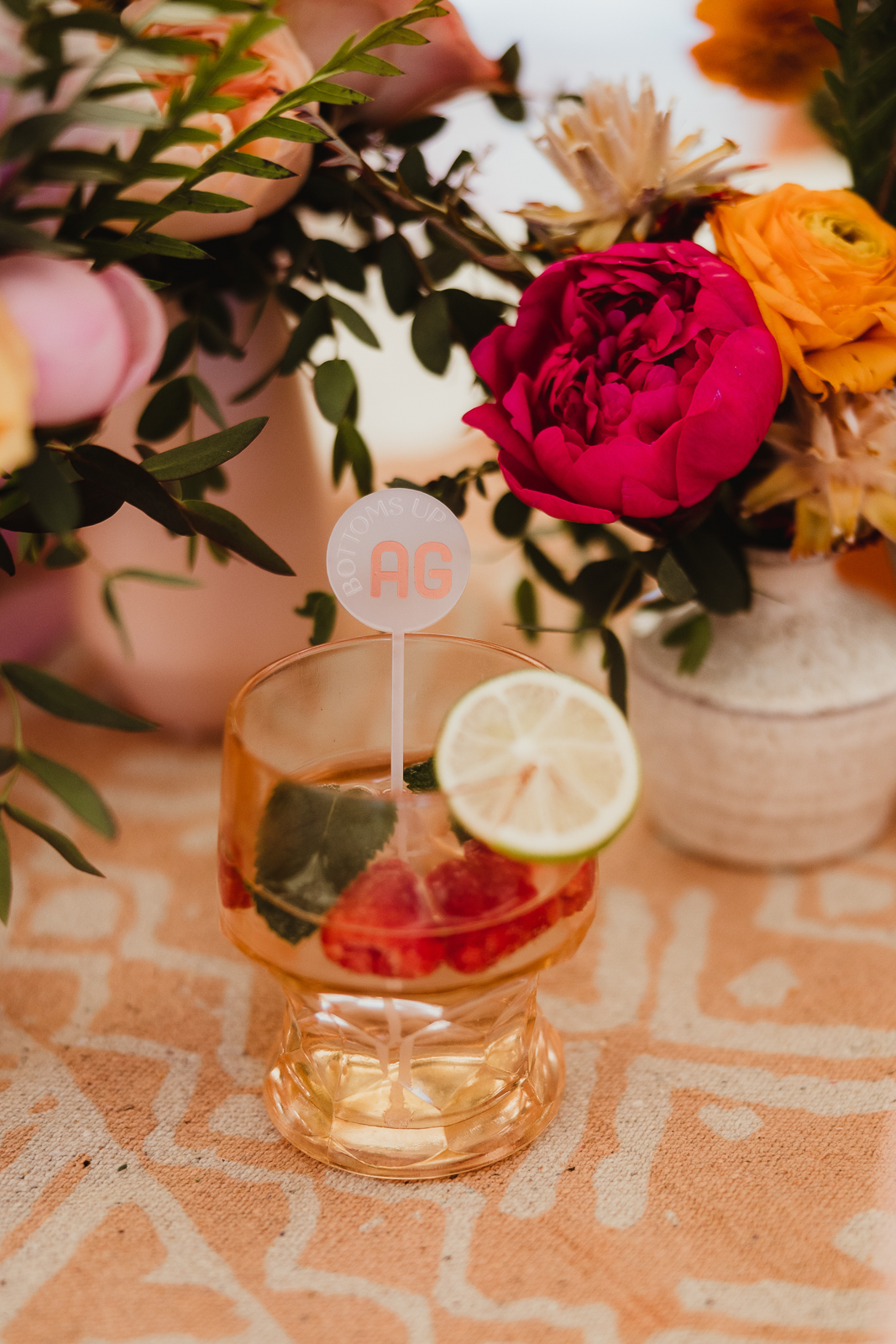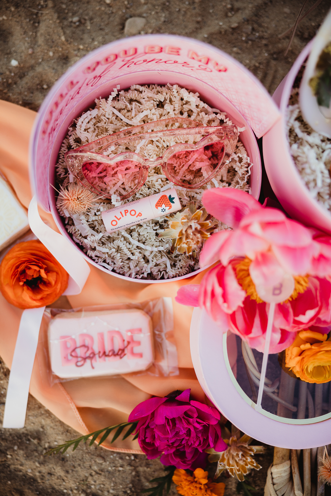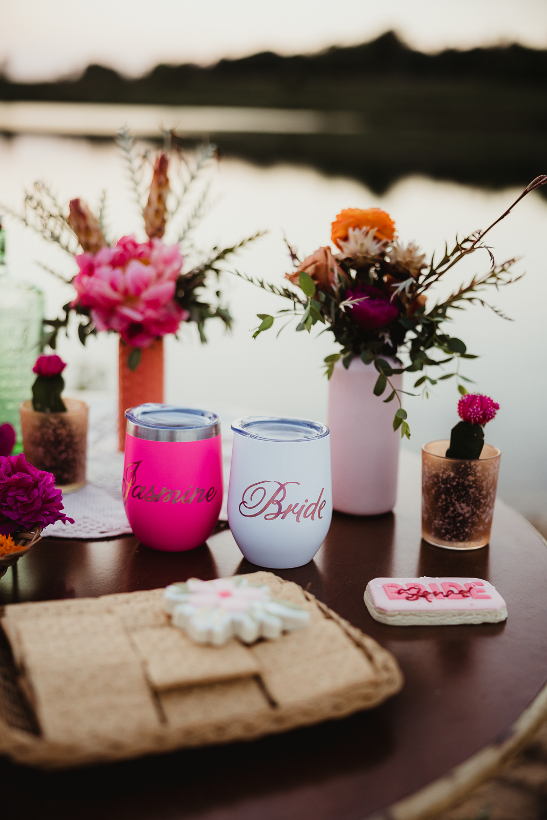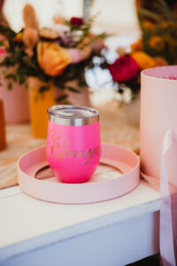 And the customization doesn’t stop there! Each bridesmaid was given a pink wine tumbler adorned with their name, personalized laser-engraved stir sticks, as well as custom heart-shaped sunglasses including their initials.