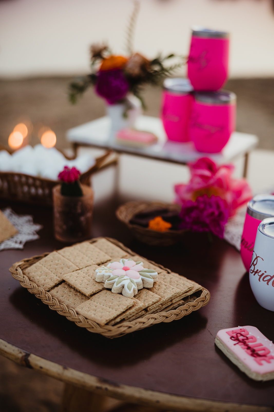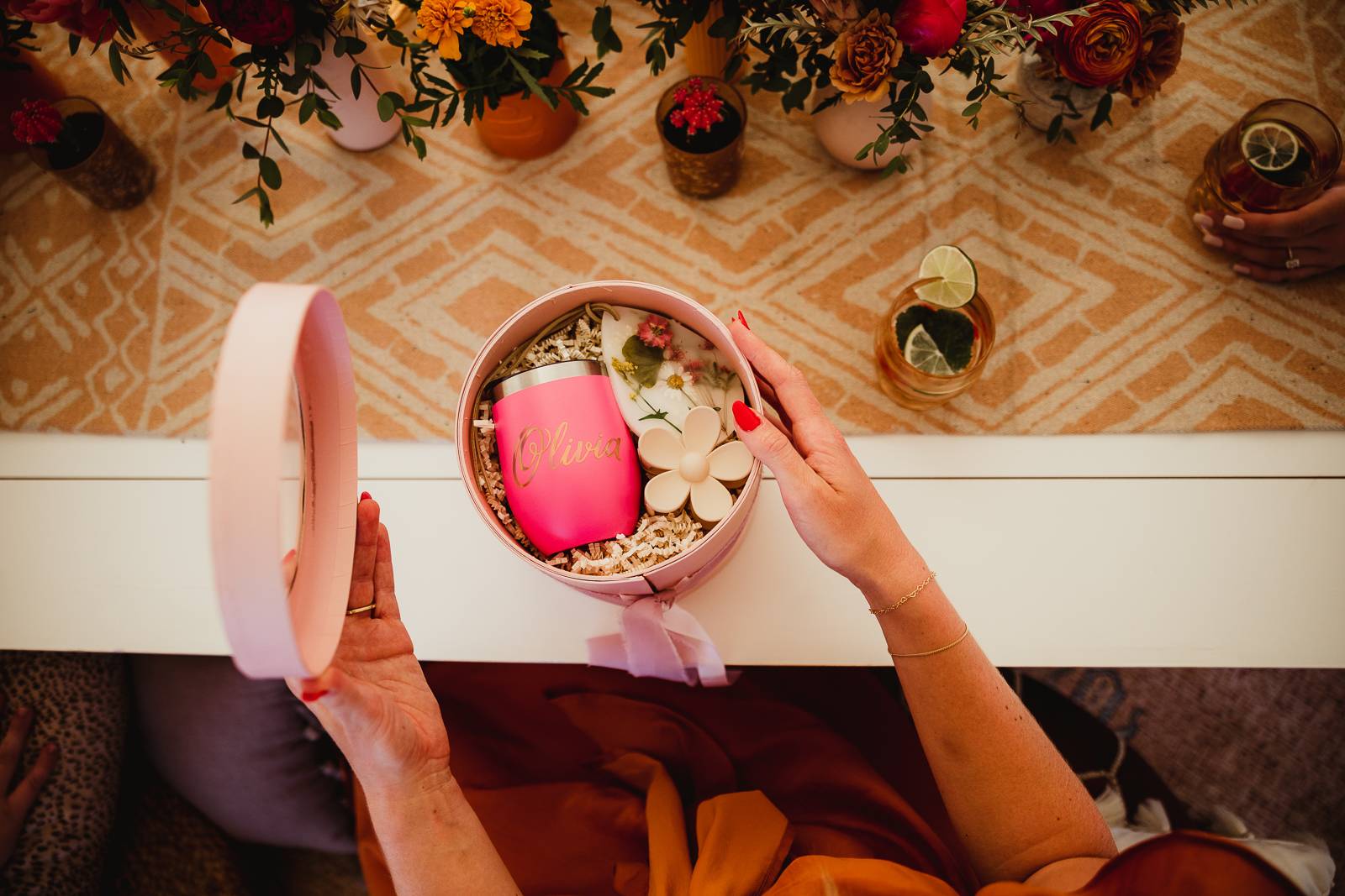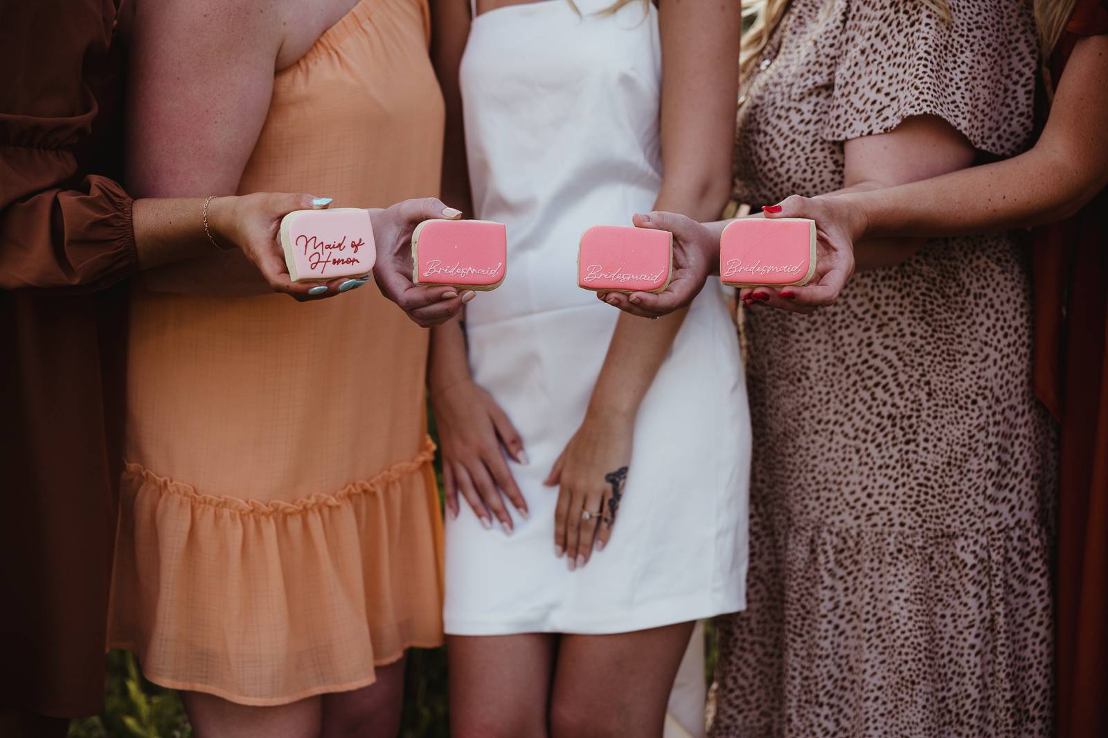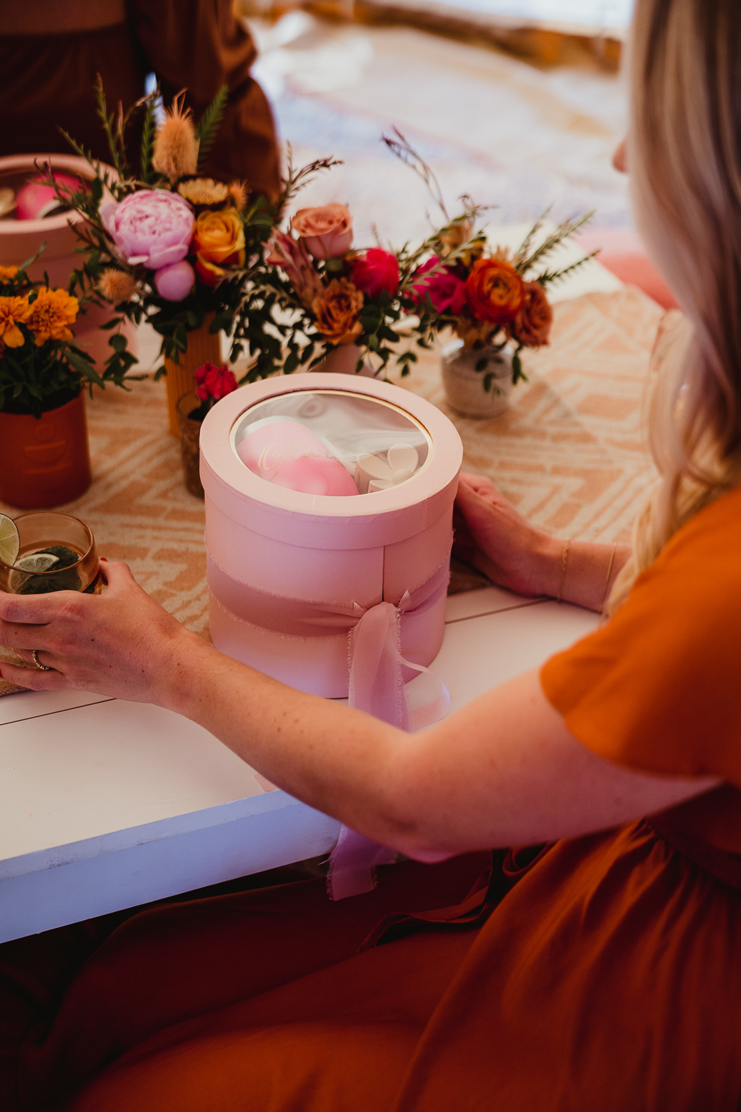 And the customization doesn’t stop there! Each bridesmaid was given a pink wine tumbler adorned with their name, personalized laser-engraved stir sticks, as well as custom heart-shaped sunglasses including their initials.