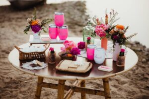 Designed and coordinated by Copper Feather Events, this vibrant, pretty-in-pink proposal party was inspired by the warm glow and tones of a summer sunset and the good vibes that only an evening on the beach with your gal pals can bring.