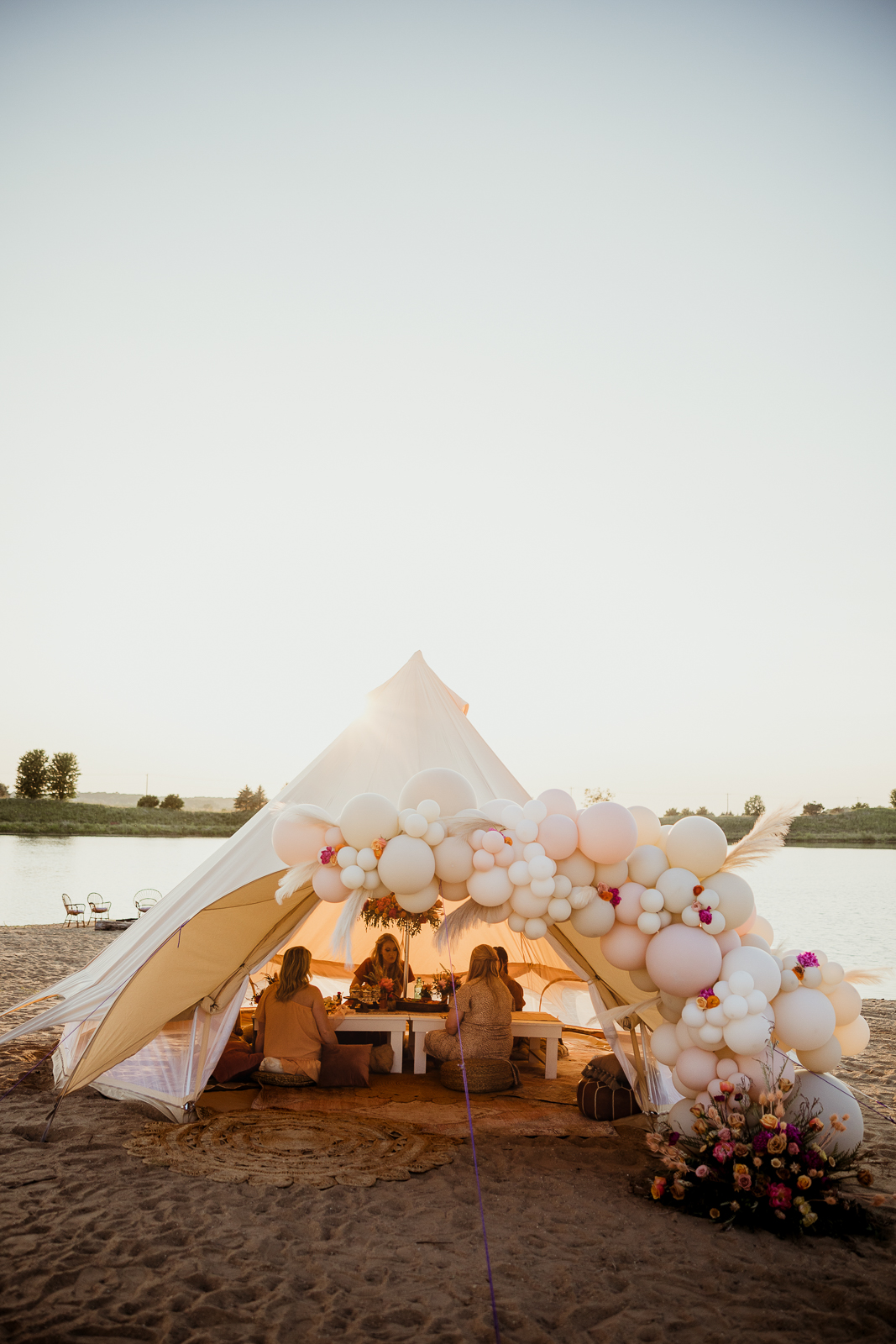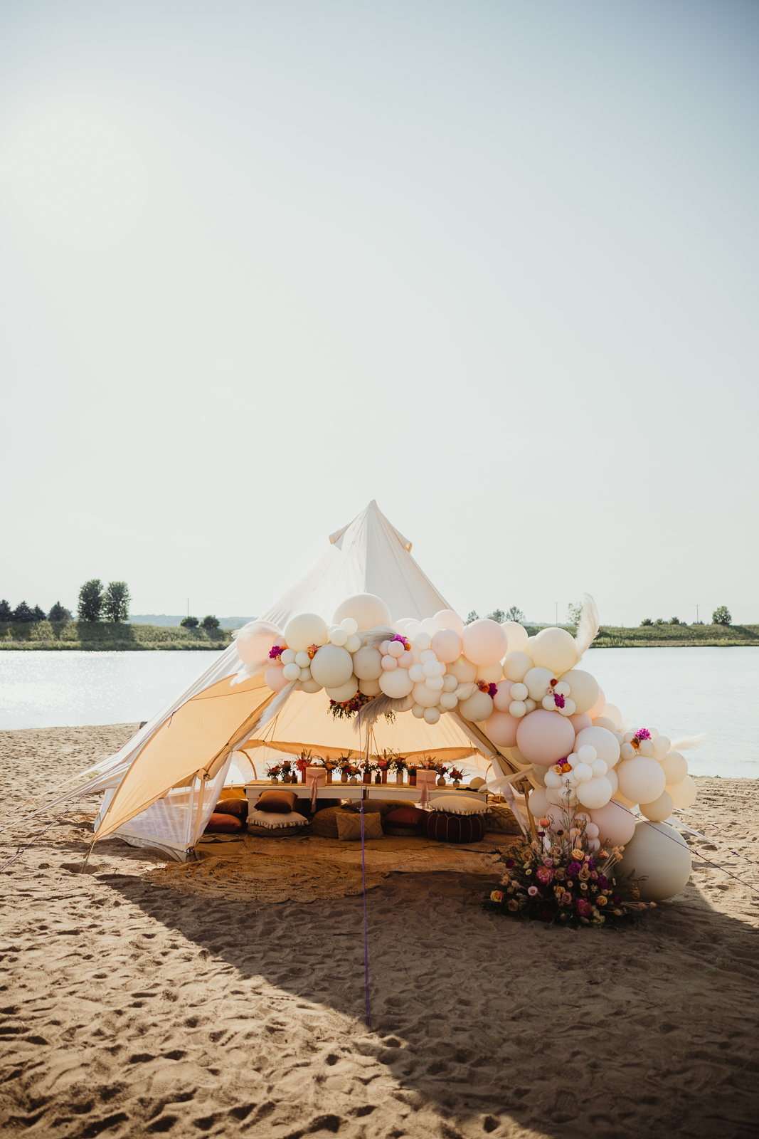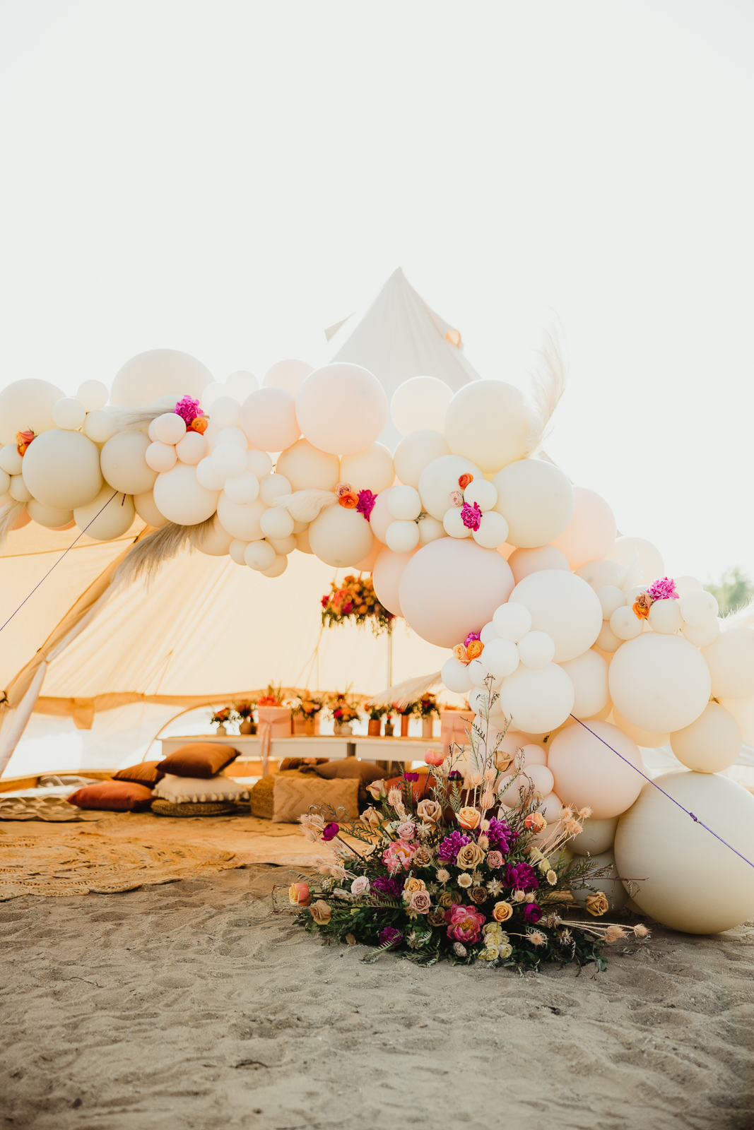 Nothing sets the scene for a boho desert-inspired beach picnic more than a canvas glamping tent from Ash + Arrow Event Collective with a statement organic balloon garland installation made from 100% biodegradable natural latex – stunning and sustainable!