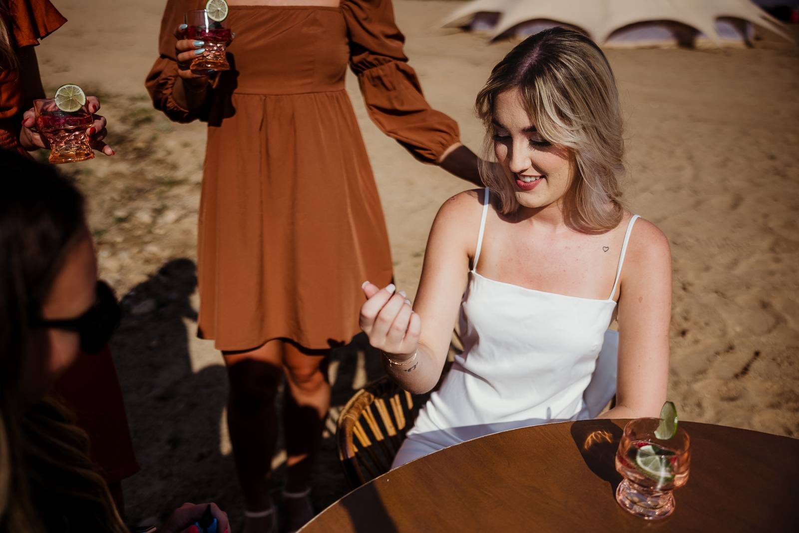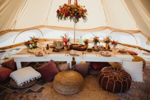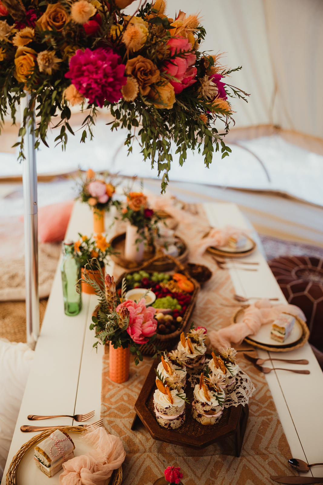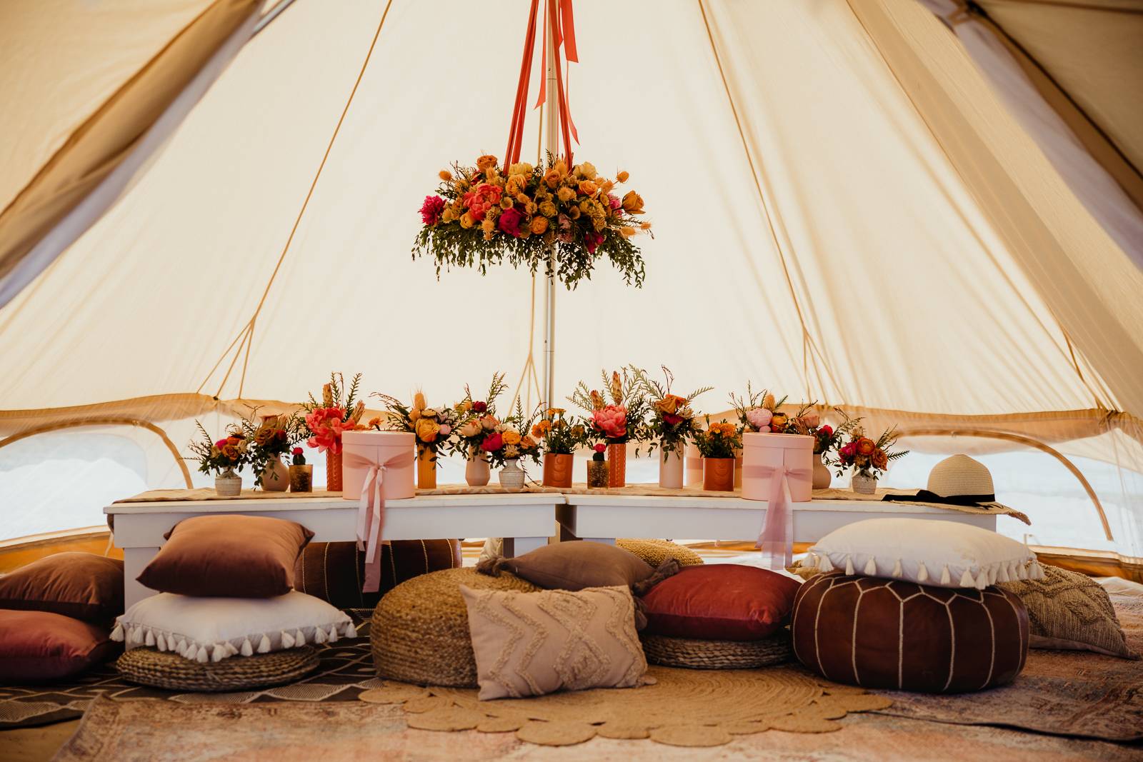 Nothing sets the scene for a boho desert-inspired beach picnic more than a canvas glamping tent from Ash + Arrow Event Collective with a statement organic balloon garland installation made from 100% biodegradable natural latex – stunning and sustainable!