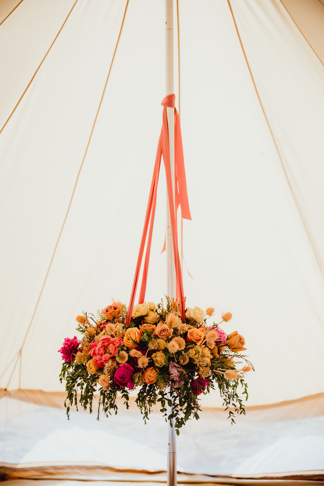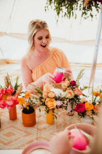 Melody Rose Designs creatively crafted beautiful arrangements of peonies, spray roses, ranunculus, greenery, and dried flowers in a vivid tan, peach, coral, blush, and fuschia color palette inspired by the summer sunset. From adorable baby cacti and bud vases filled with vibrant blooms to statement ground florals, a chandelier-like hanging display, and the dreamiest accent for a golden-hour boat ride, Melody Rose Designs placed every stem with intention.