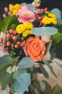 wedding table floral centerpieces yellow pink blush orange peach flowers floral blooms