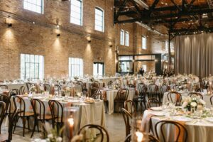 The outside of the building features curved gothic windows and exposed natural brick. Inside, guests are treated to vaulted ceilings, abundant natural light, industrial beams across the ceilings (perfect for string lights!), and no shortage of brick backdrops. With multiple spaces and menu options to choose from, every event will feel right at home in an open and welcoming environment.