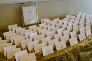 DID YOU USE ANY SPECIAL CHAIRS, LINENS, CHARGERS, GLASSWARE, OR DINNERWARE? We used gold chargers for under the plates, and Jeffrey and I both had special matching champagne flutes with an art deco script Mrs. and Mr. on them!