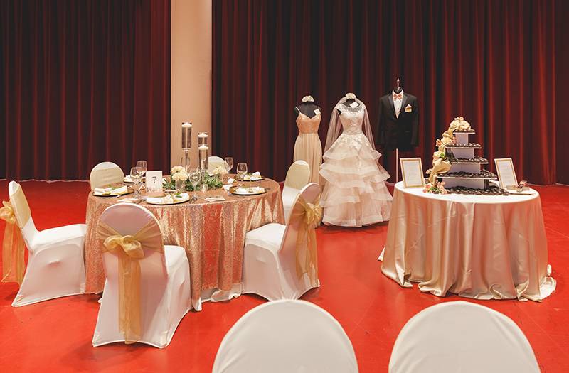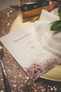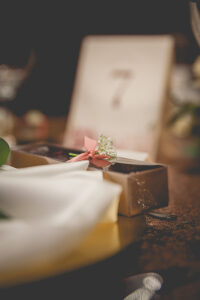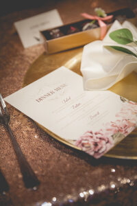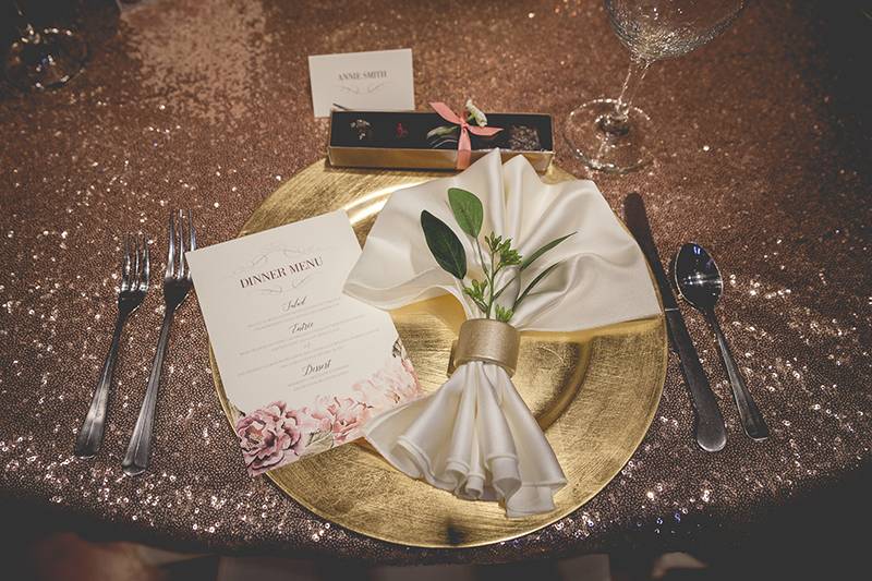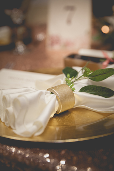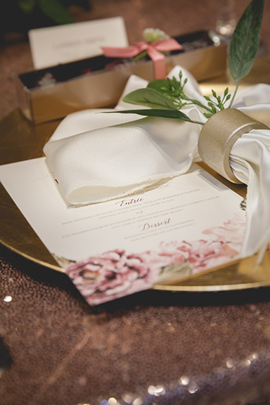 Rose gold never goes out of style and it looks like this hot trending chic shade is here to stay for a while and we’re perfectly okay with that. This wedding scape shot by The Wedding Flashers and designed by “I Do” A Decorating & Rental Services accented the table with a rose gold sequin linen paired with gold chargers and napkin rings with beautiful plum and blush paper goods from Sarah B. And those delish chocolate truffles from Gail Ambrosius Chocolatier just top it all off.