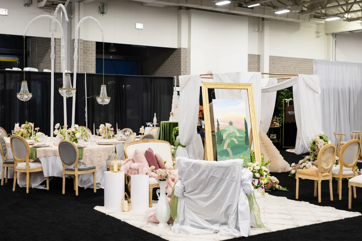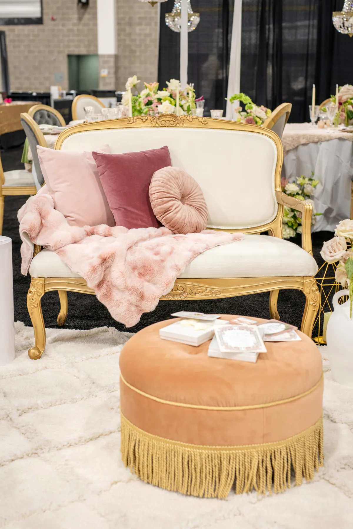Additional elements in the lounge showcased furniture and décor pieces from Velvet Rentals, including their Phillip Settee, Marie Antoinette Ottoman, and velvet pillows.