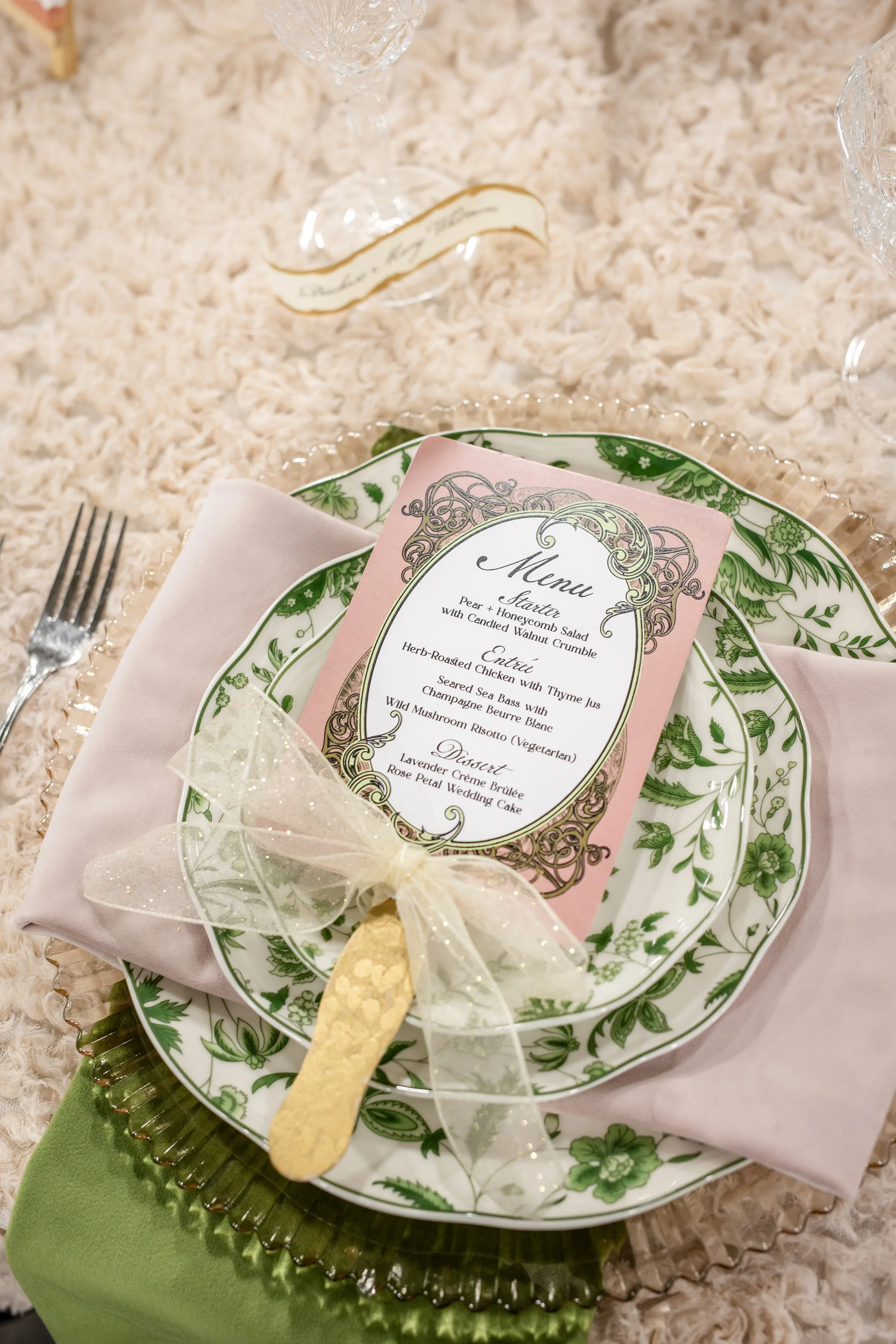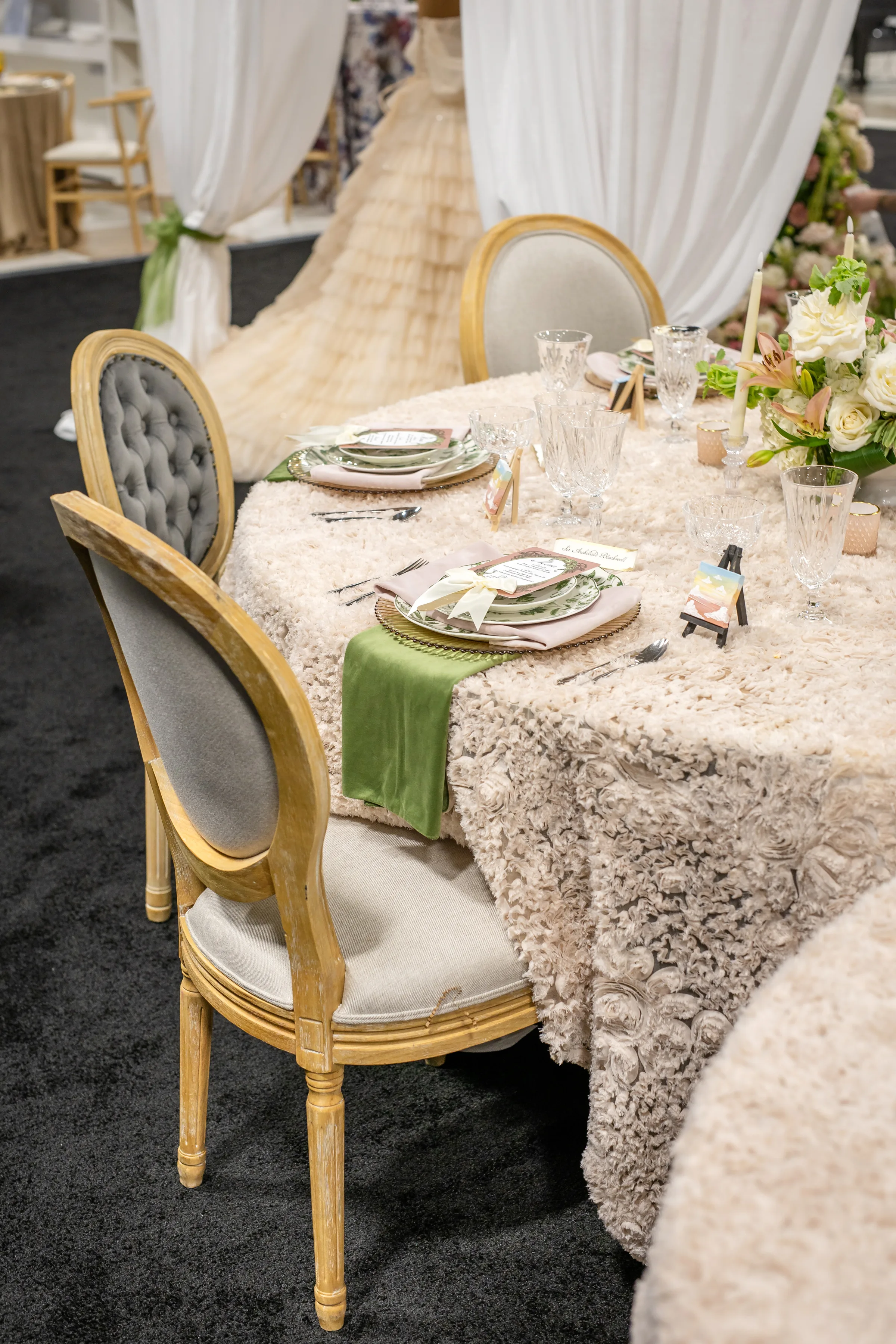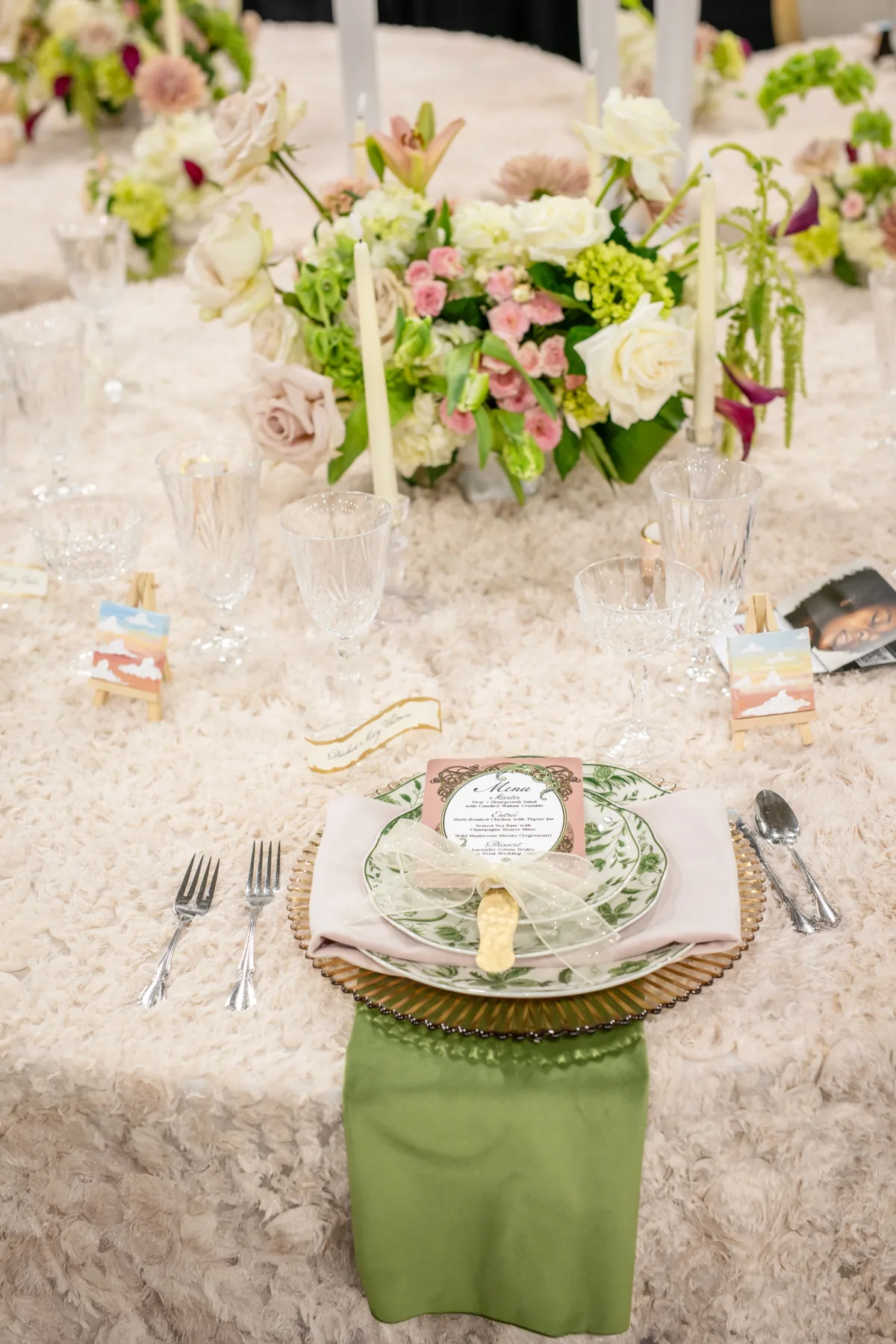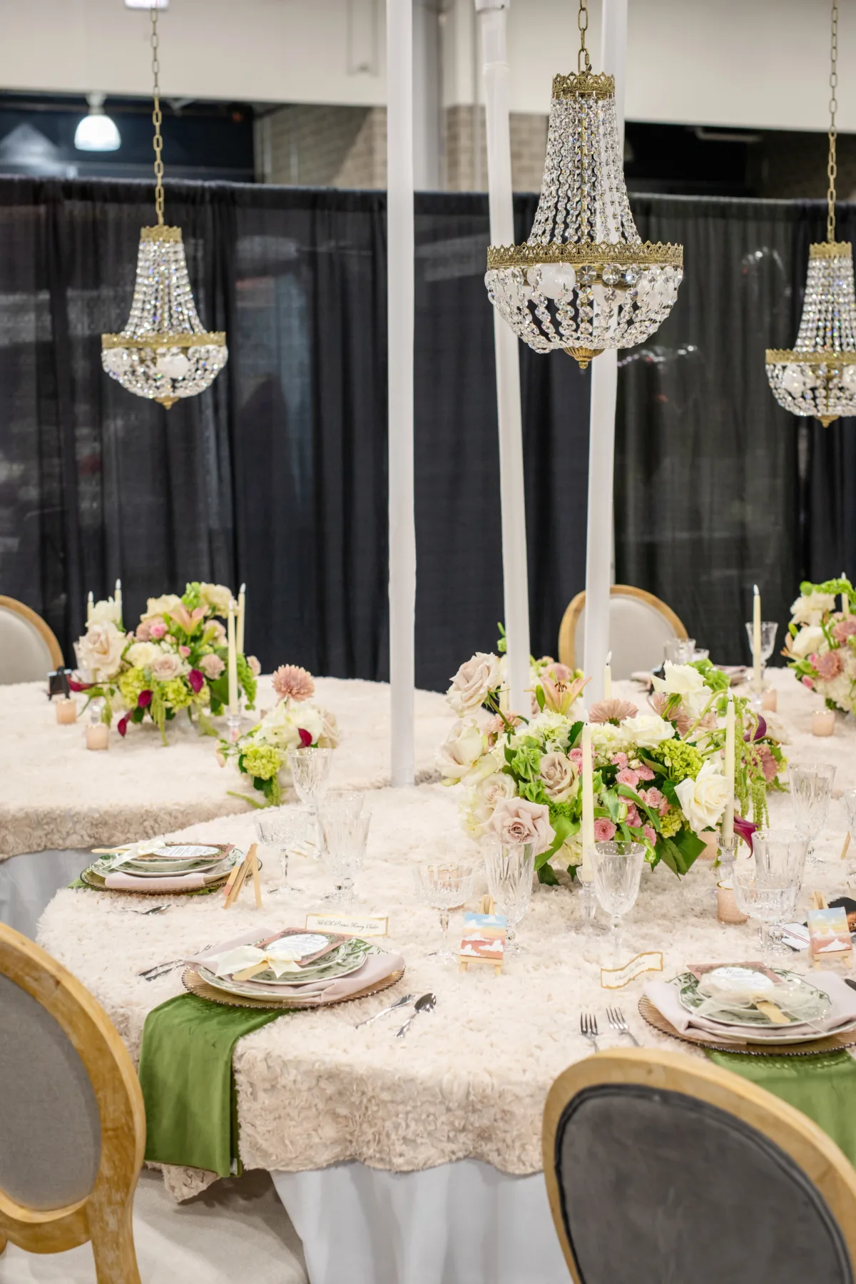 The tablescape, illuminated by twinkling chandeliers from Velvet Rentals, was straight out of a fairytale. The design featured three circular tables, each topped with a plush, faux-fur tablecloth and surrounded by mismatched chairs from Event Essentials. Each place setting had a crimped, tinted glass charger, a set of green and white patterned plates, crystal glassware, and a green and a blush linen.