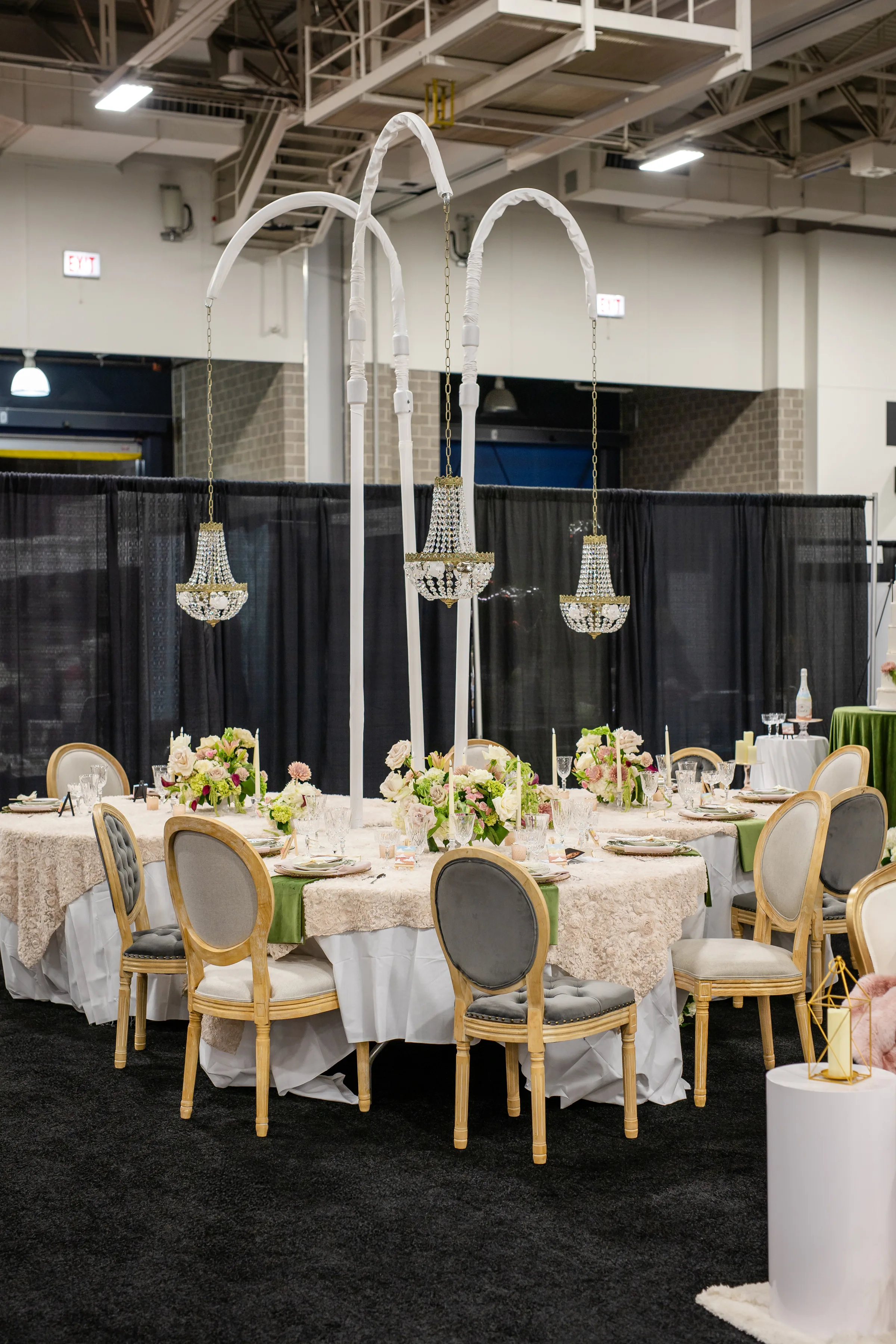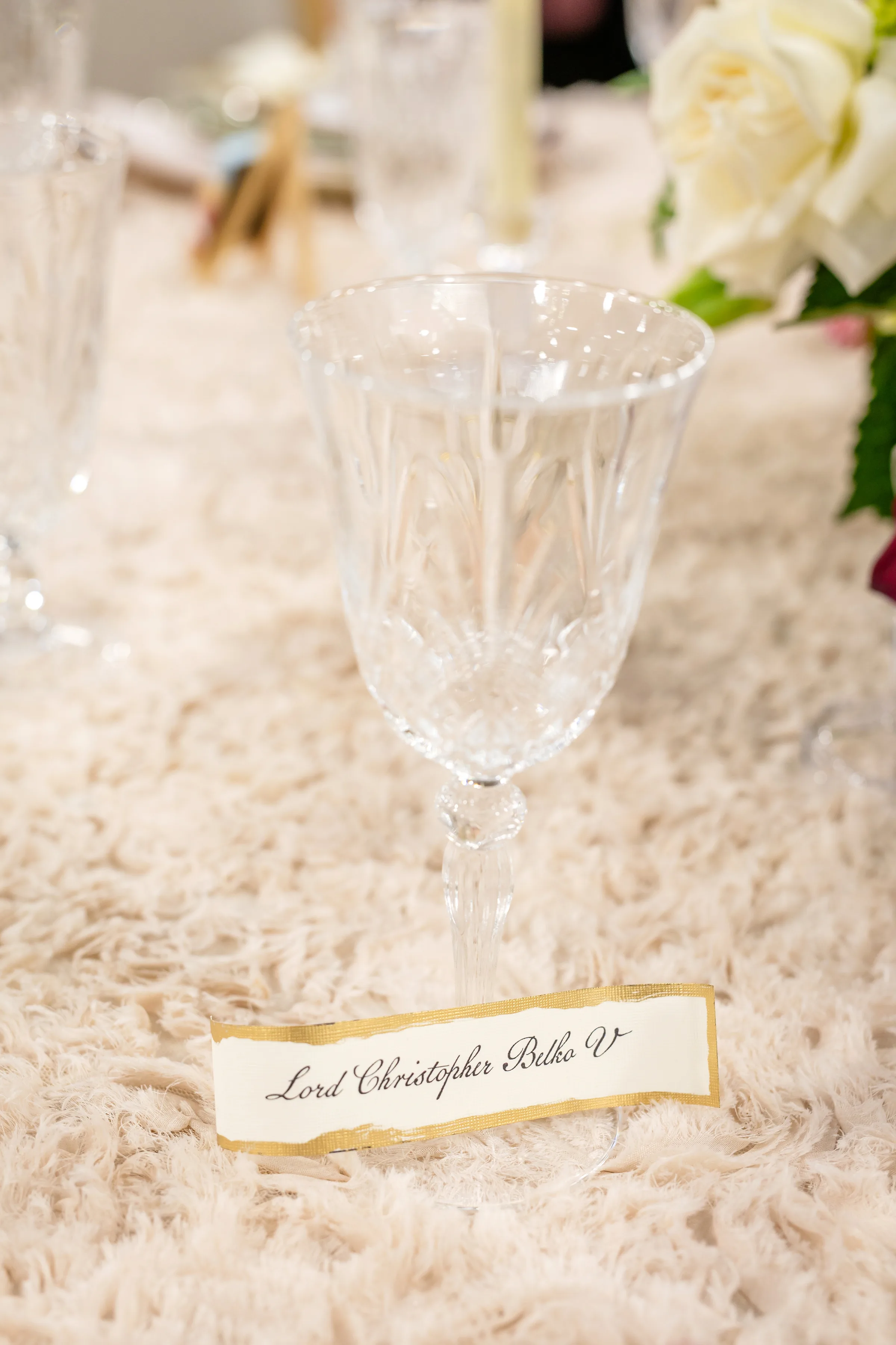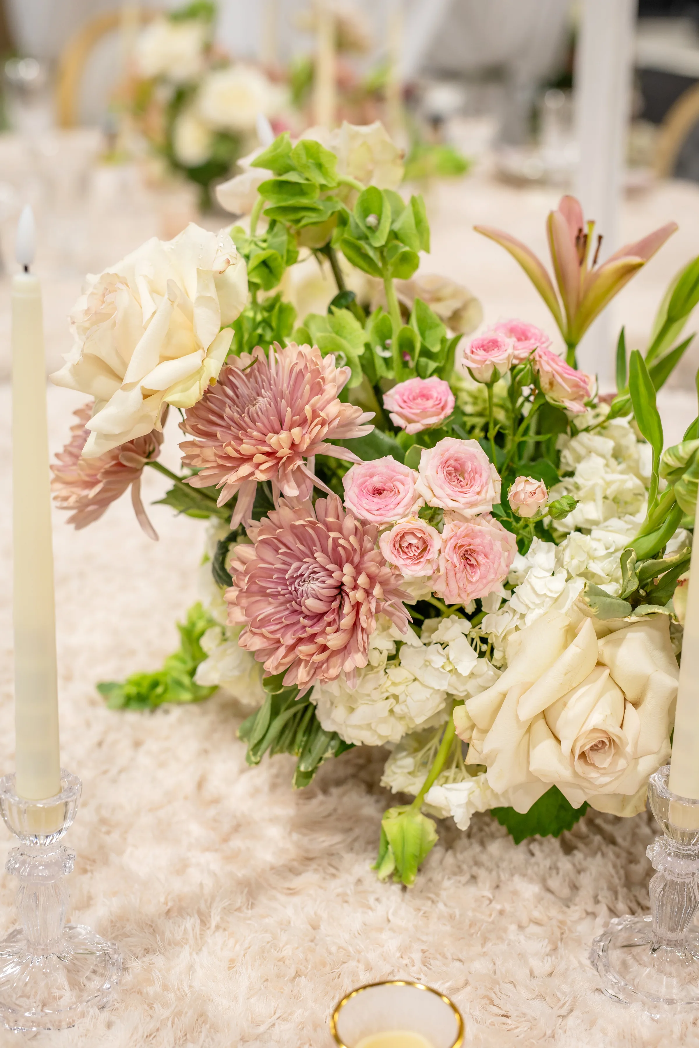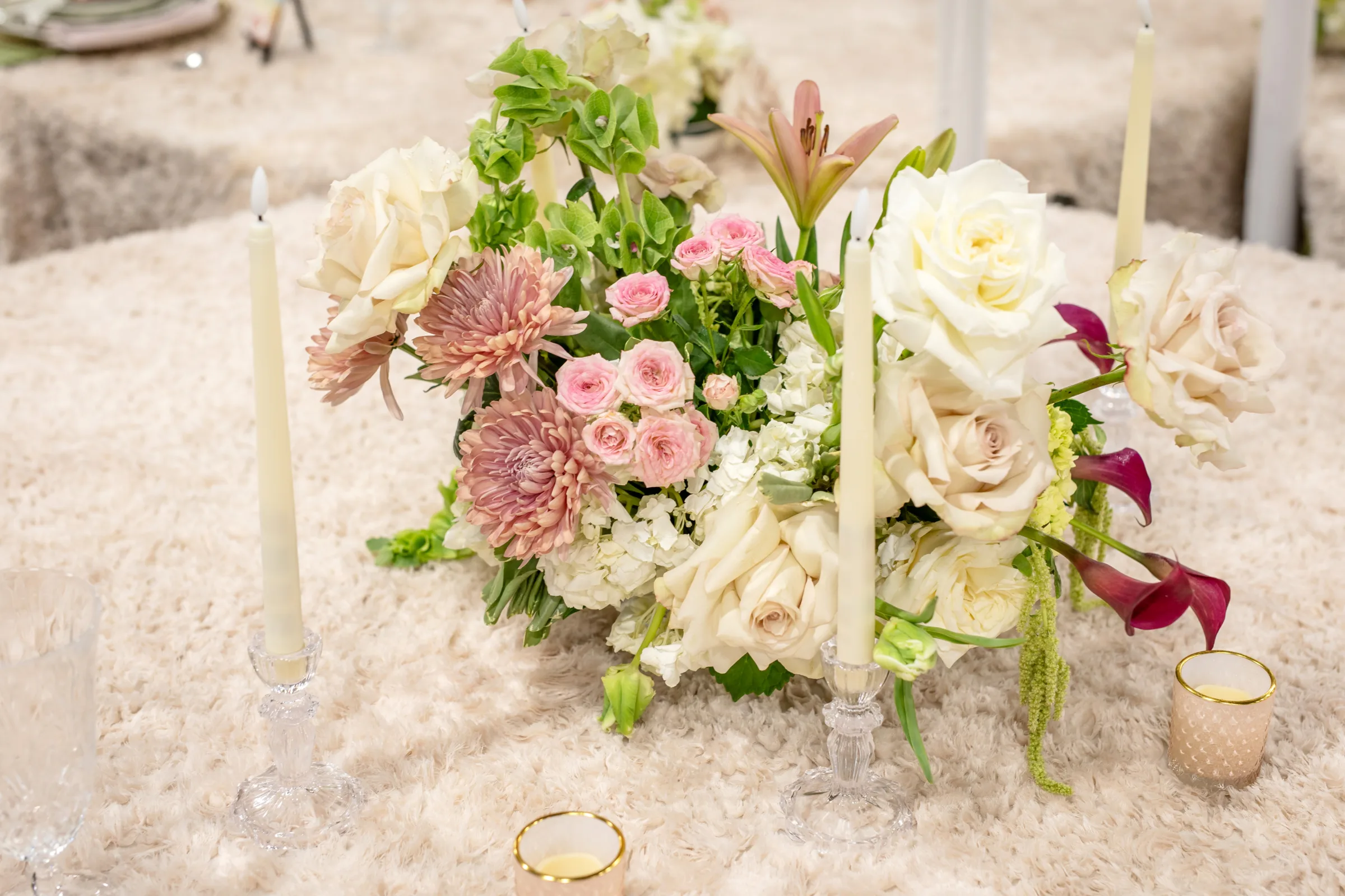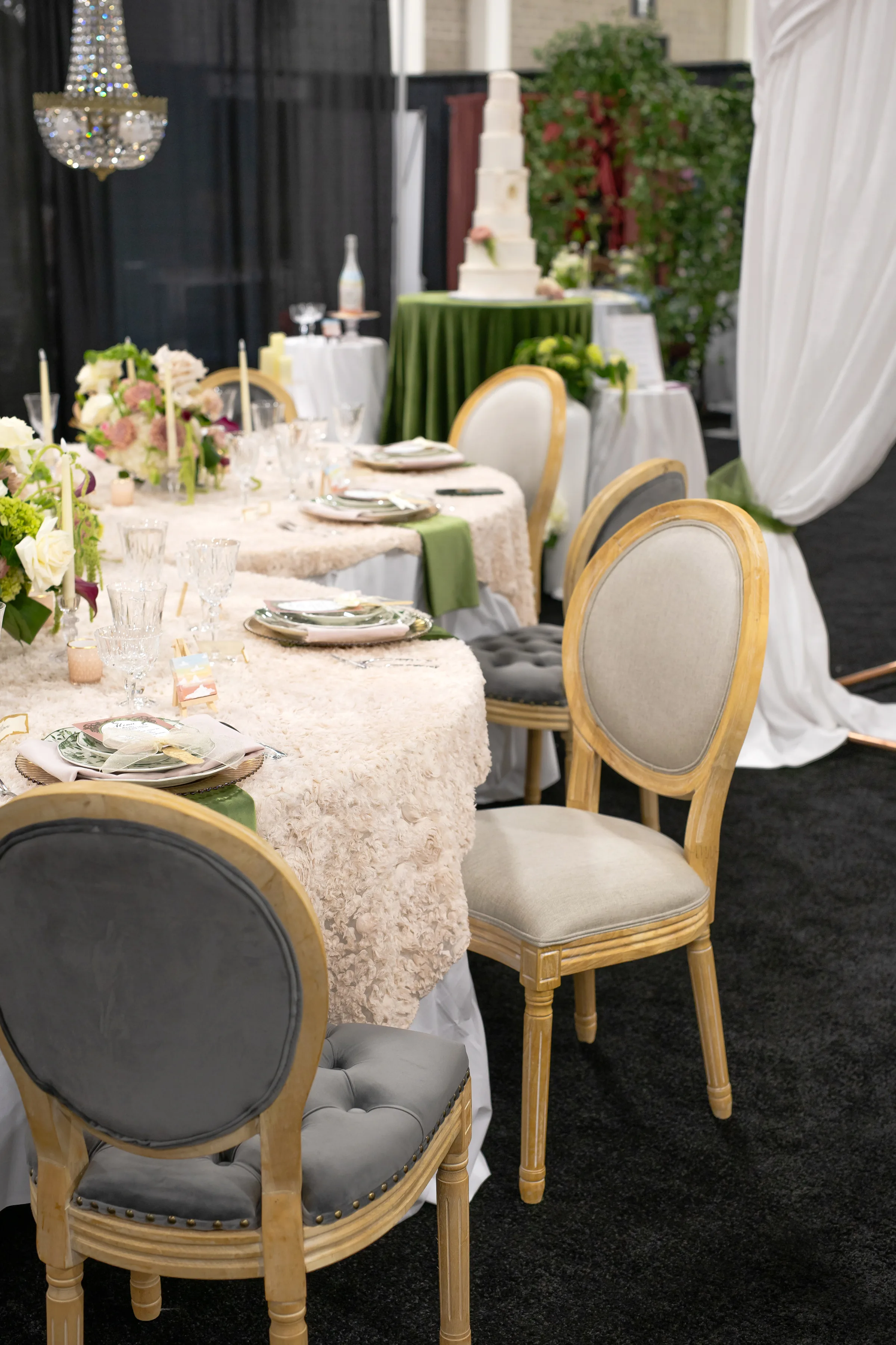 The tablescape, illuminated by twinkling chandeliers from Velvet Rentals, was straight out of a fairytale. The design featured three circular tables, each topped with a plush, faux-fur tablecloth and surrounded by mismatched chairs from Event Essentials. Each place setting had a crimped, tinted glass charger, a set of green and white patterned plates, crystal glassware, and a green and a blush linen.