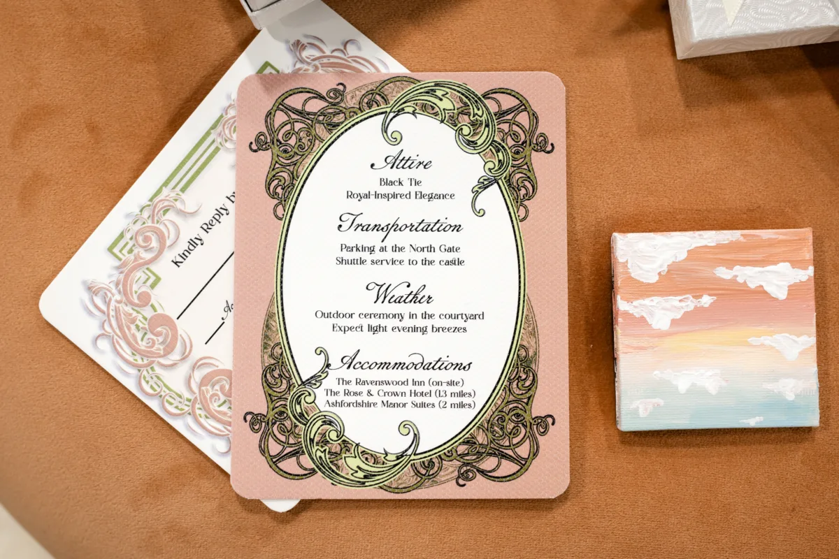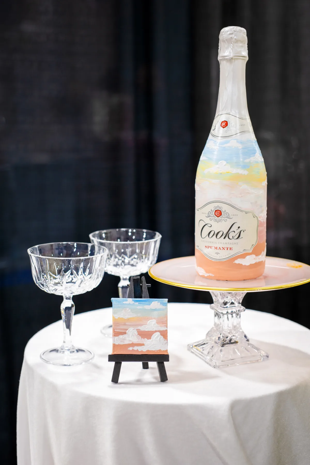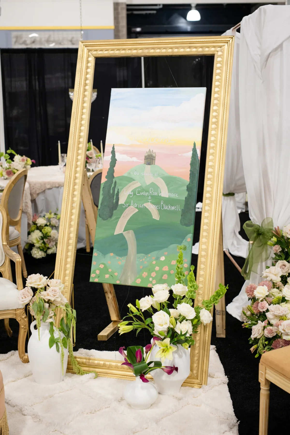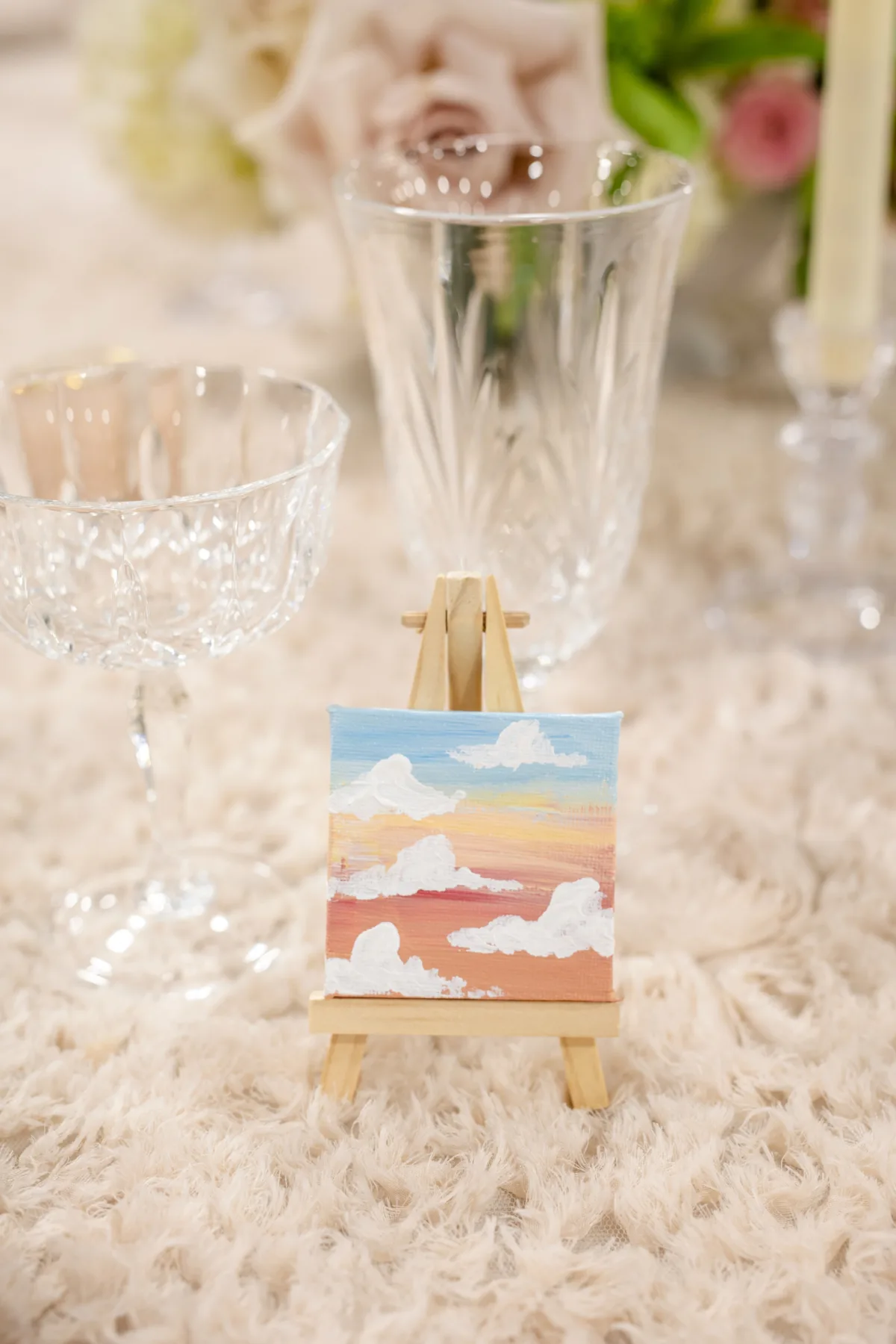 Cayla the Painter brought her signature artistic style to the design, beginning with a dreamy hand-painted welcome sign in the lounge. The painting featured a road along cascading hills leading to a castle set against a colorful sunset with fluffy clouds. The cloud and sunsets continued across small canvas favors and a painted champagne class.