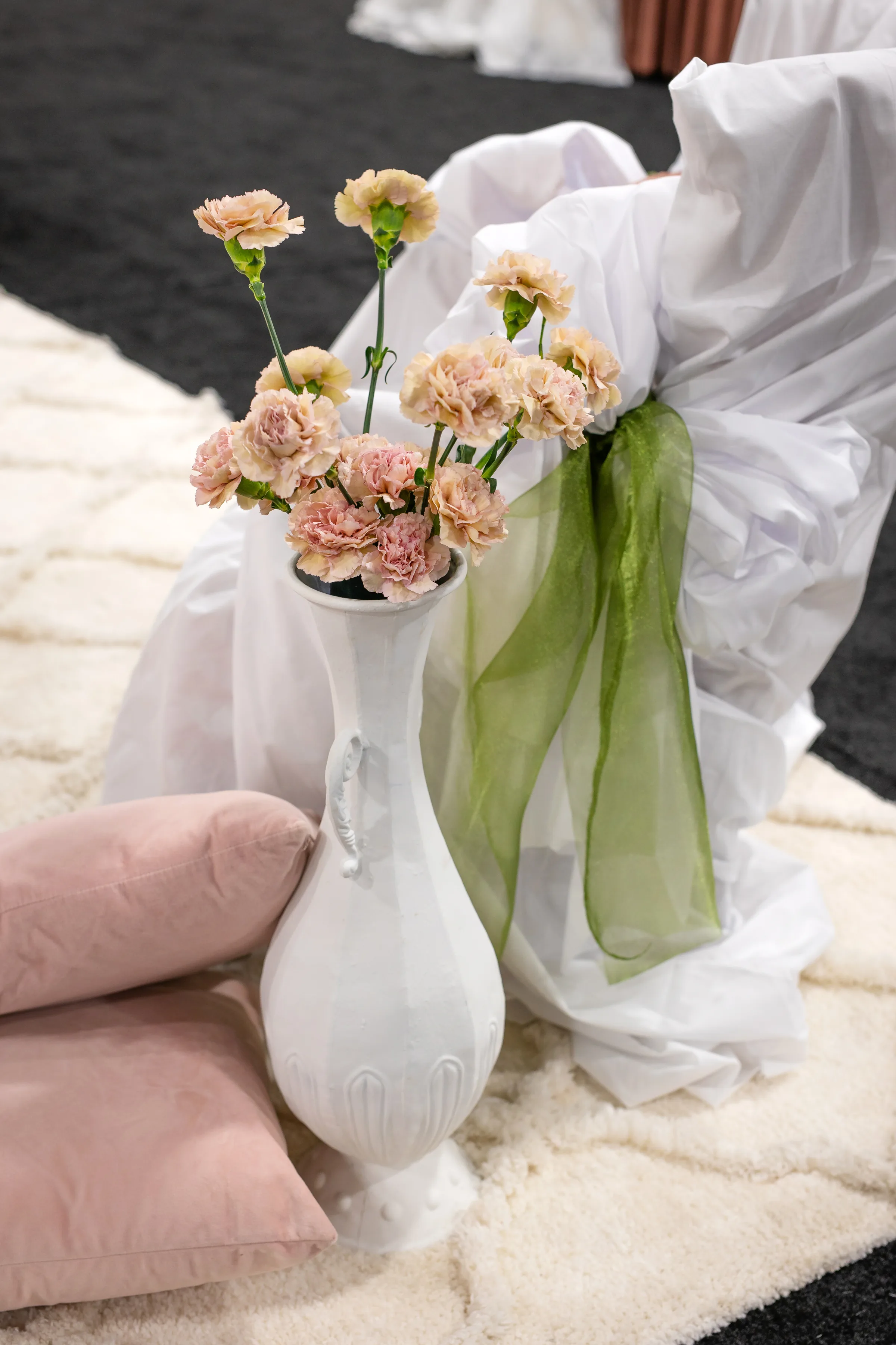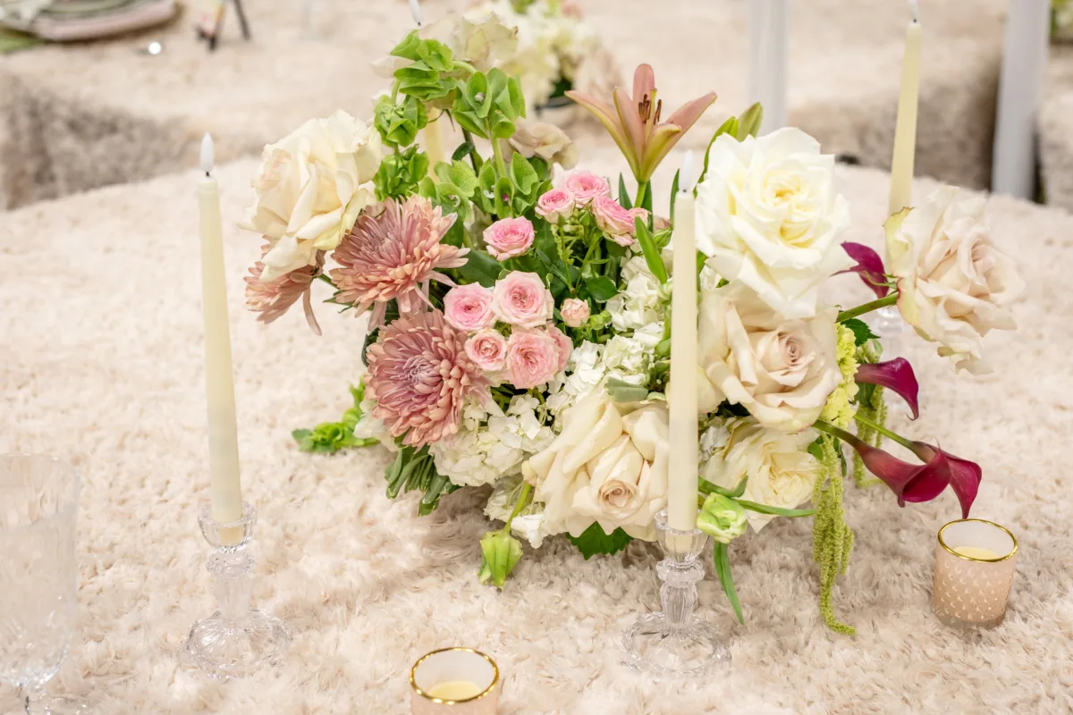 In addition to coordination and design, B-Style crafted lush floral arrangements throughout every scene. They alternated between filling white vases in the lounge and on the tables, to framing ground florals at the ceremony setup. Flowers included white and blush roses, carnations, pink lilies, hydrangea, chrysanthemums, and green amaranthus.
