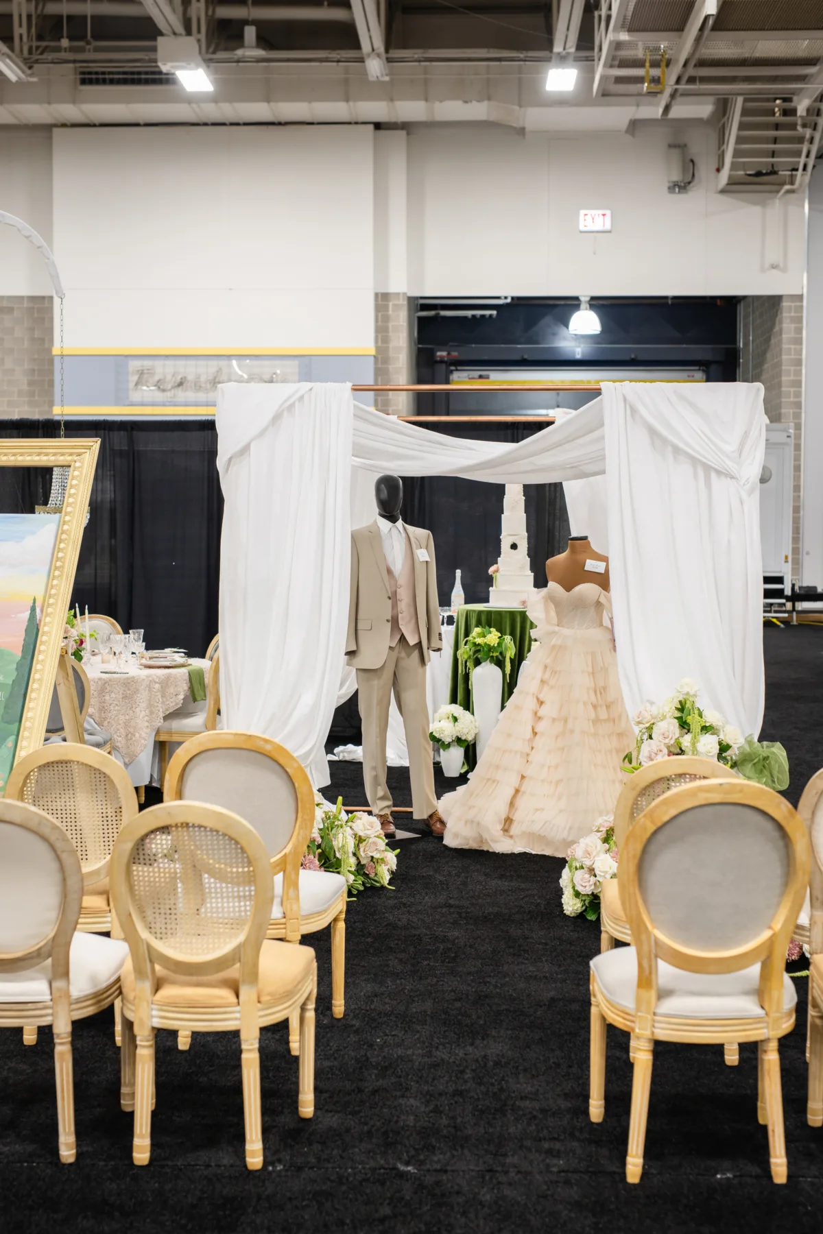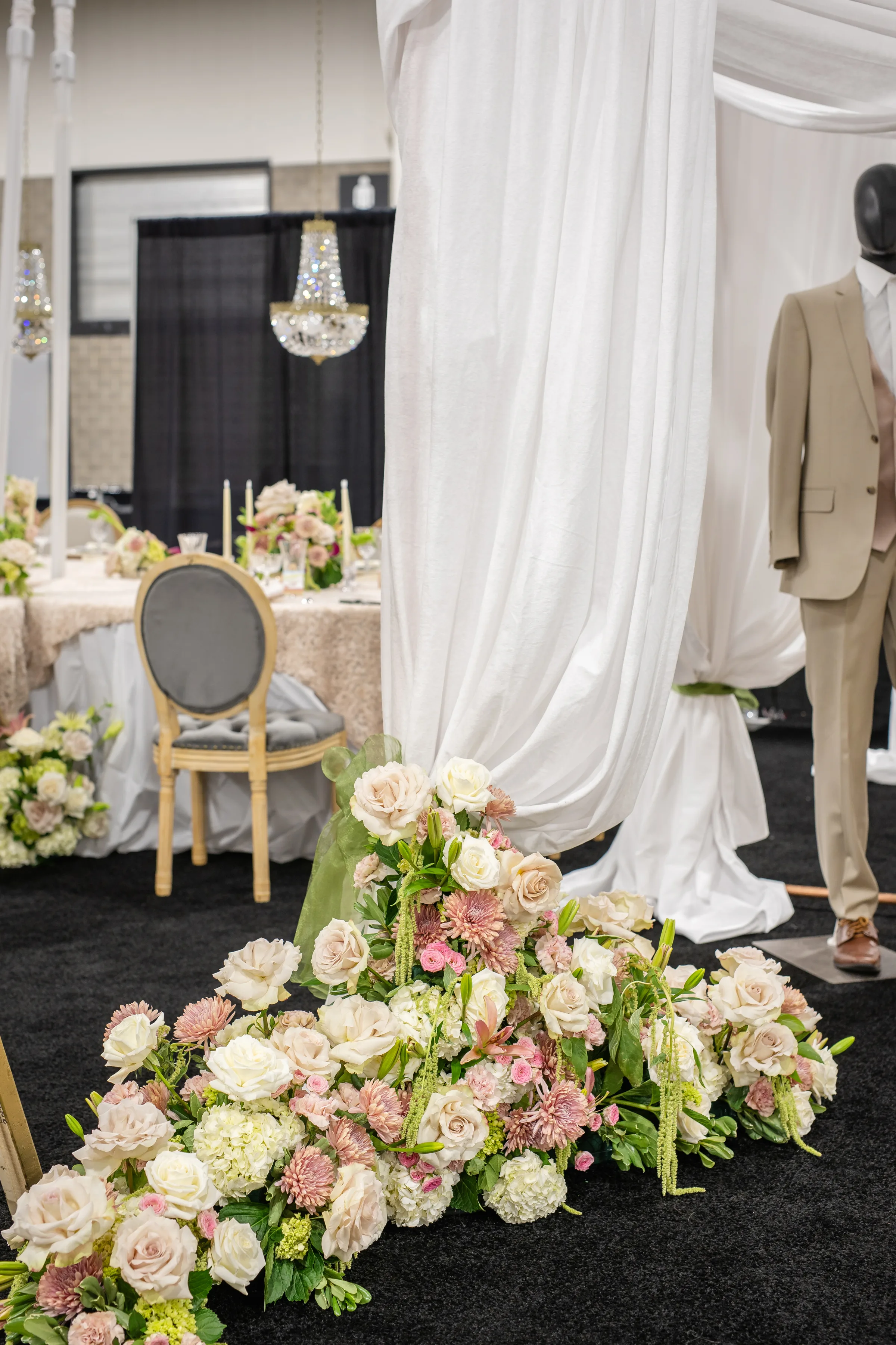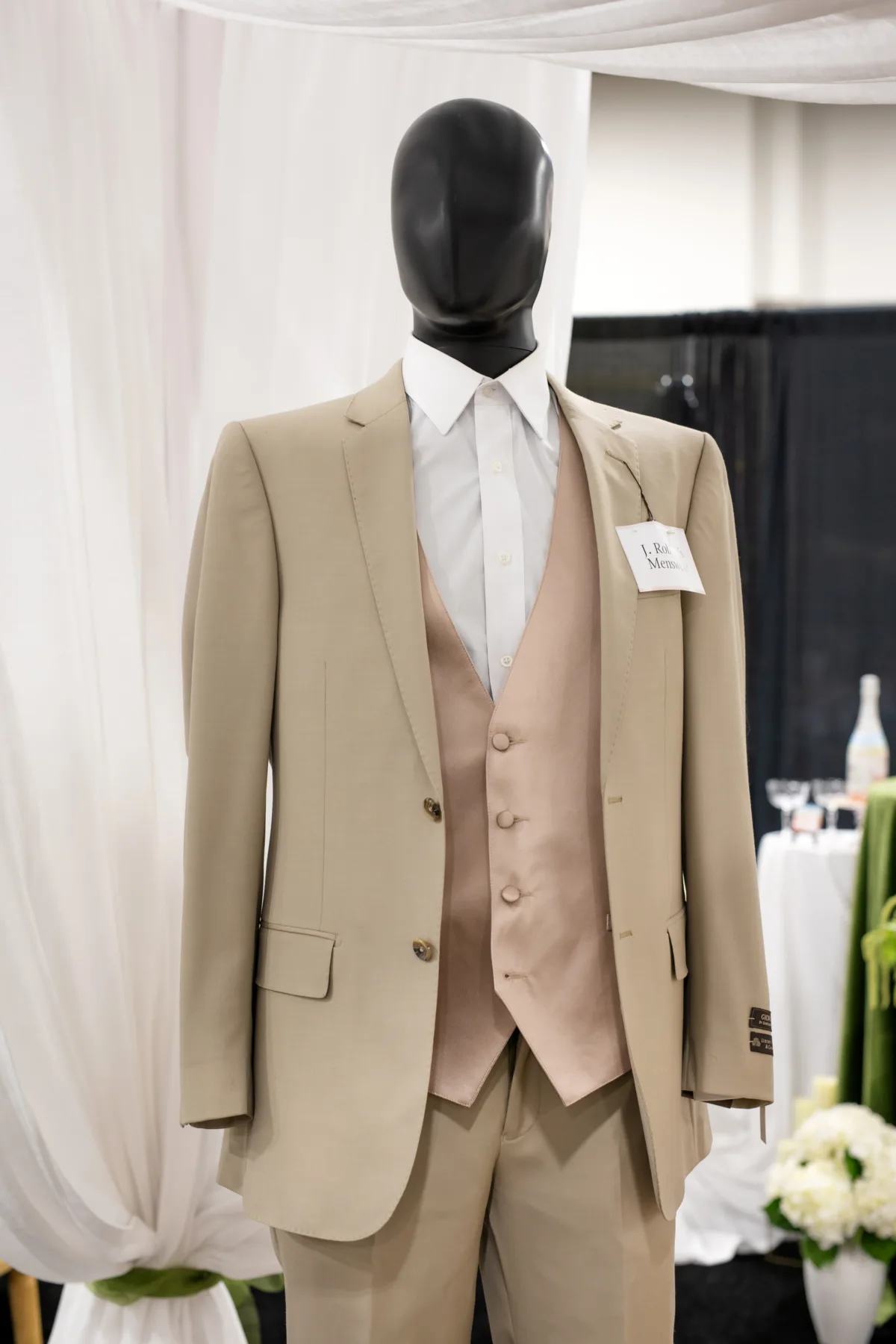 J. Robert’s Menswear chose a taupe suit with a blush vest, white undershirt, and brown dress shoes. The mannequins were set beneath a white canopy of fabric, draped from above and on all sides.