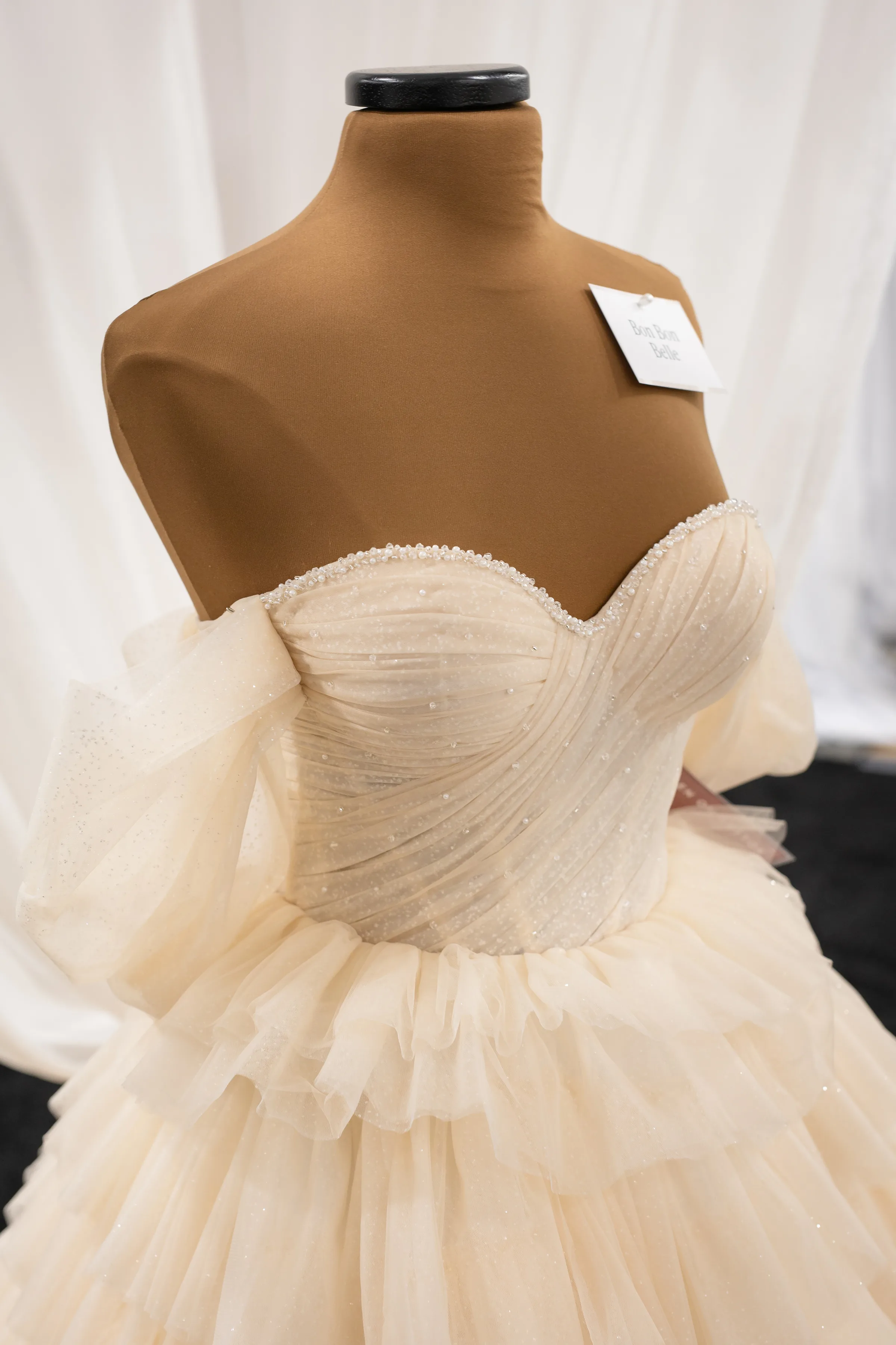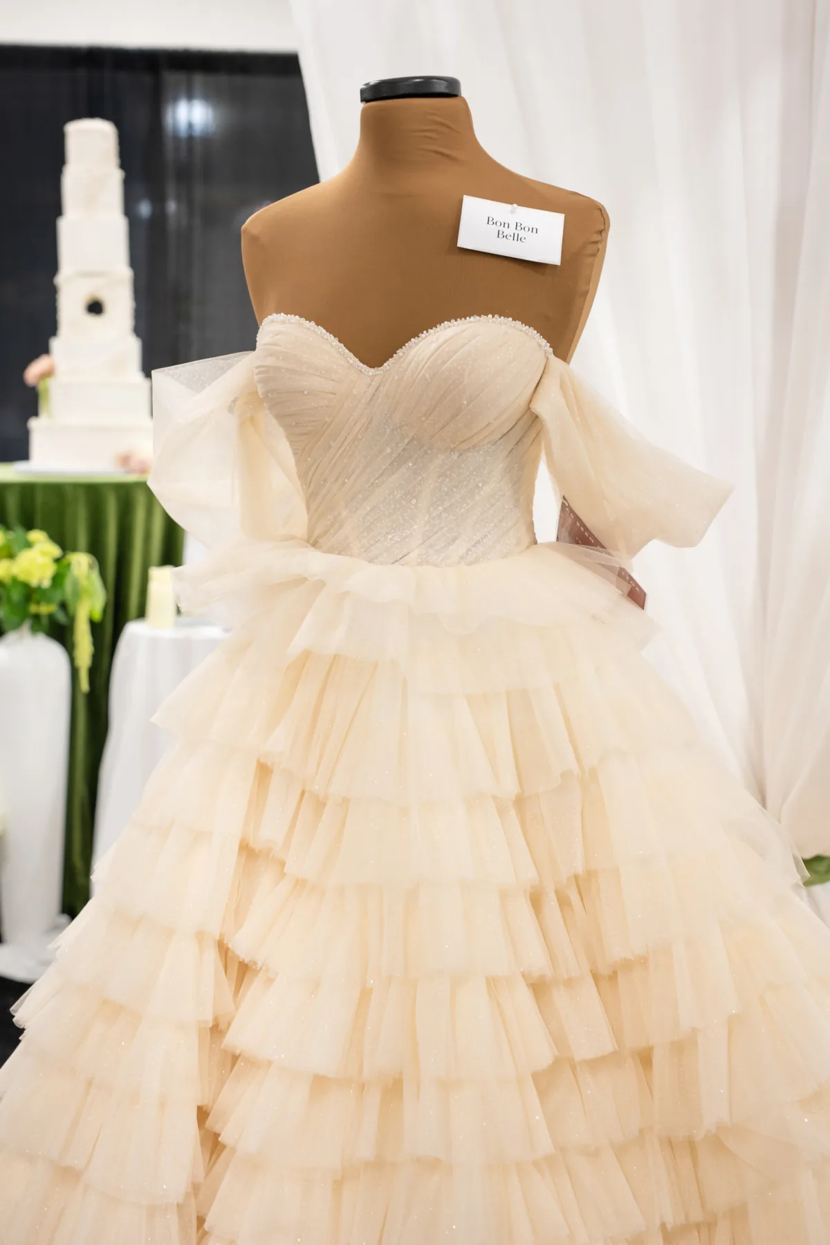 Bon Bon Belle selected a blush princess gown befitting the fairytale theme. The dress had a structured bodice, a beaded sweetheart neckline, a full, layered tulle skirt, off-the-shoulder sleeves, and subtle, shimmery details sewn into every inch of the fabric.