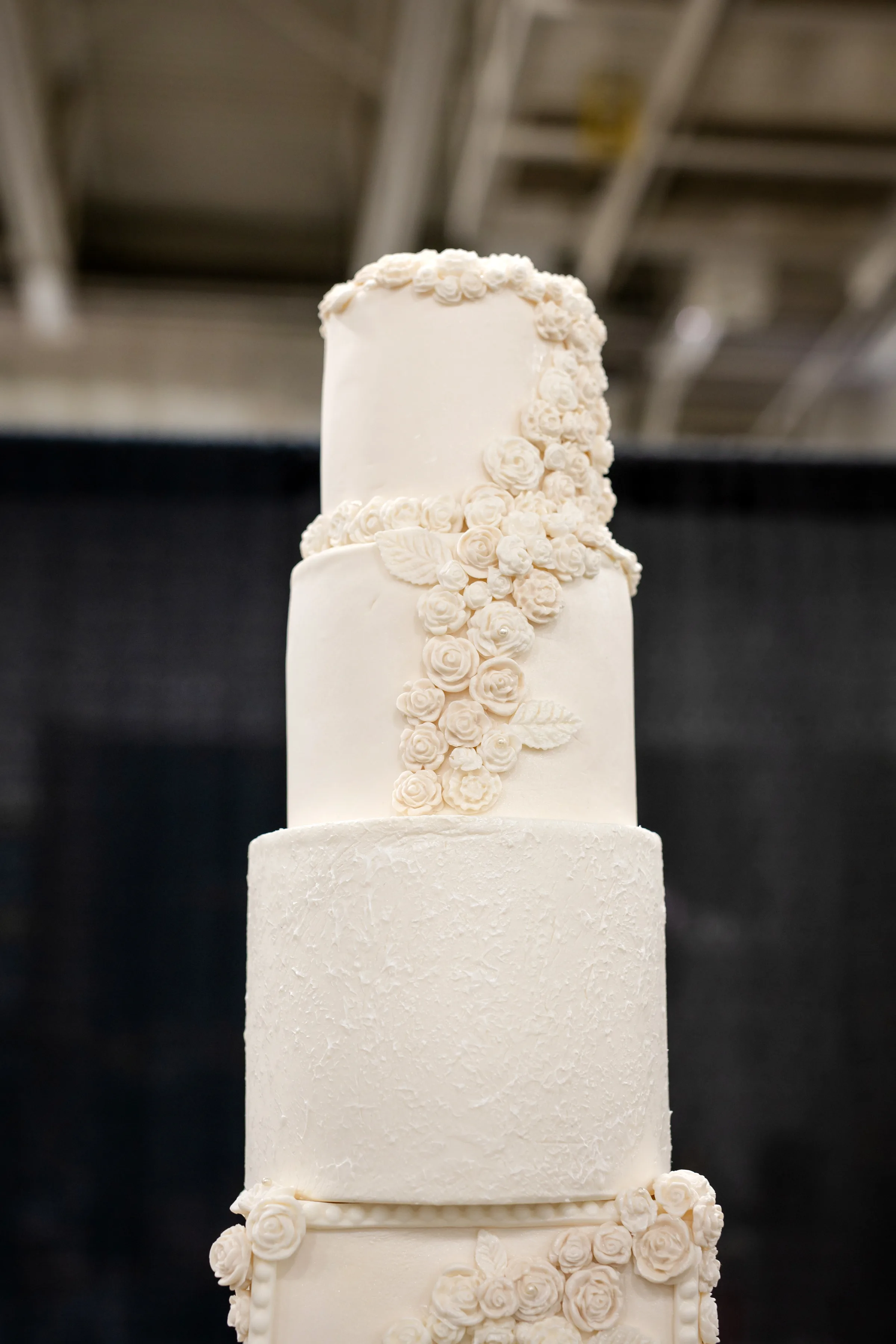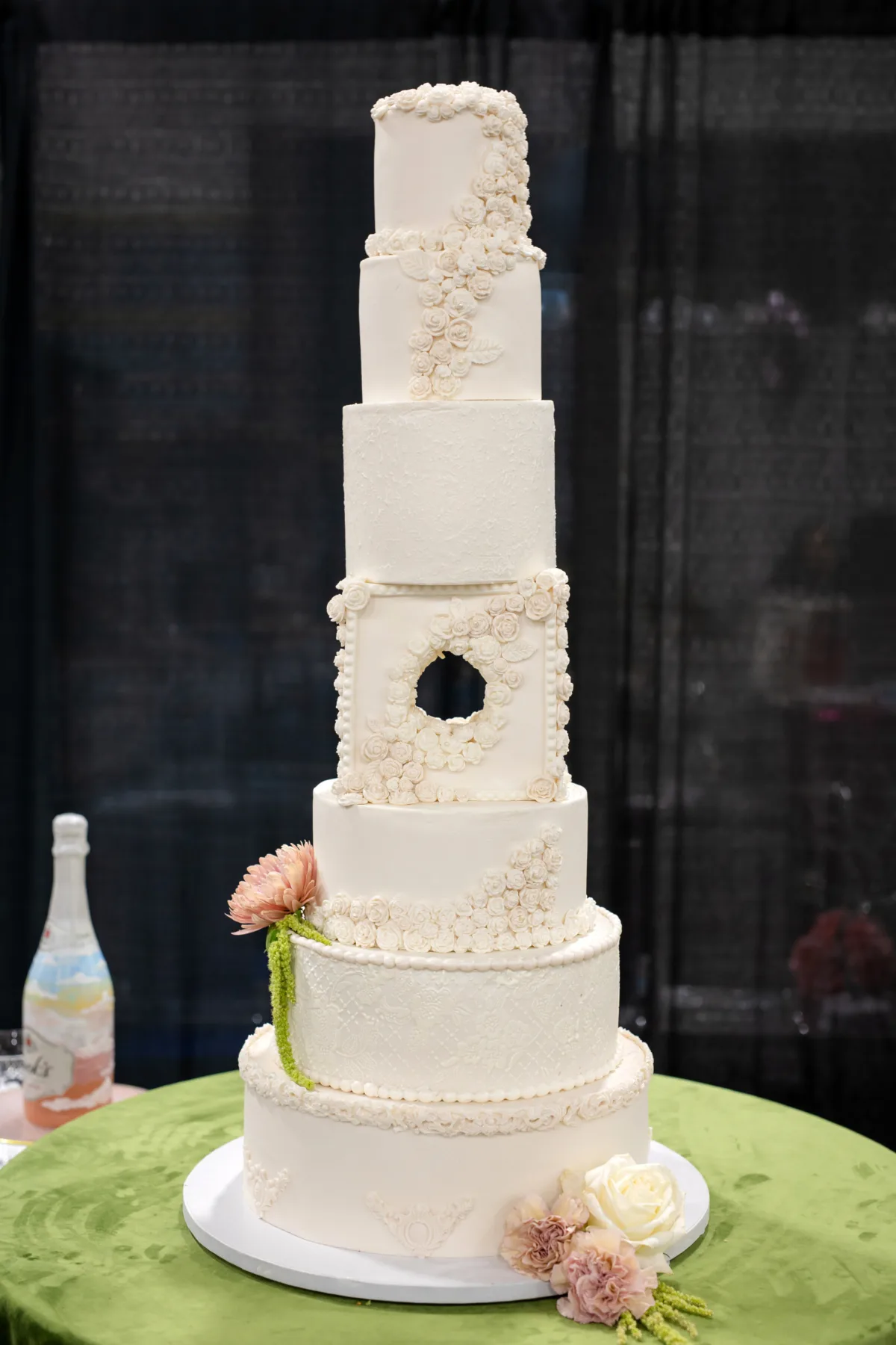 The dessert table offered a showstopping finale in the form of a seven-layer cake by Mai Lara’s Bouqcakes. The artistic layers stood at varying heights, with the central layer being square rather than round—and, just as notably, with a decorative hole in its center. Frosted flowers and textures also varied by layer, creating a sculptural, asymmetric design.