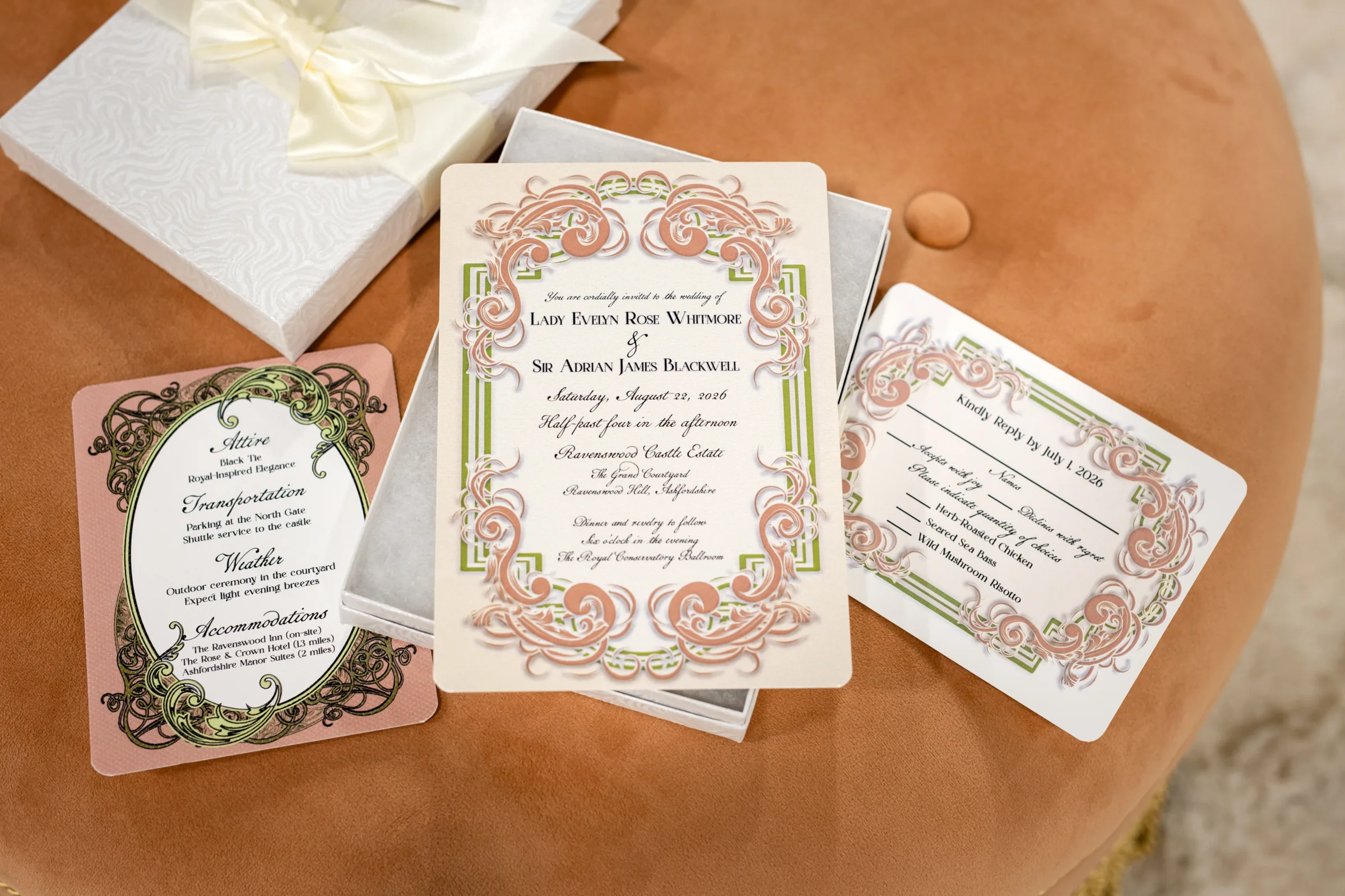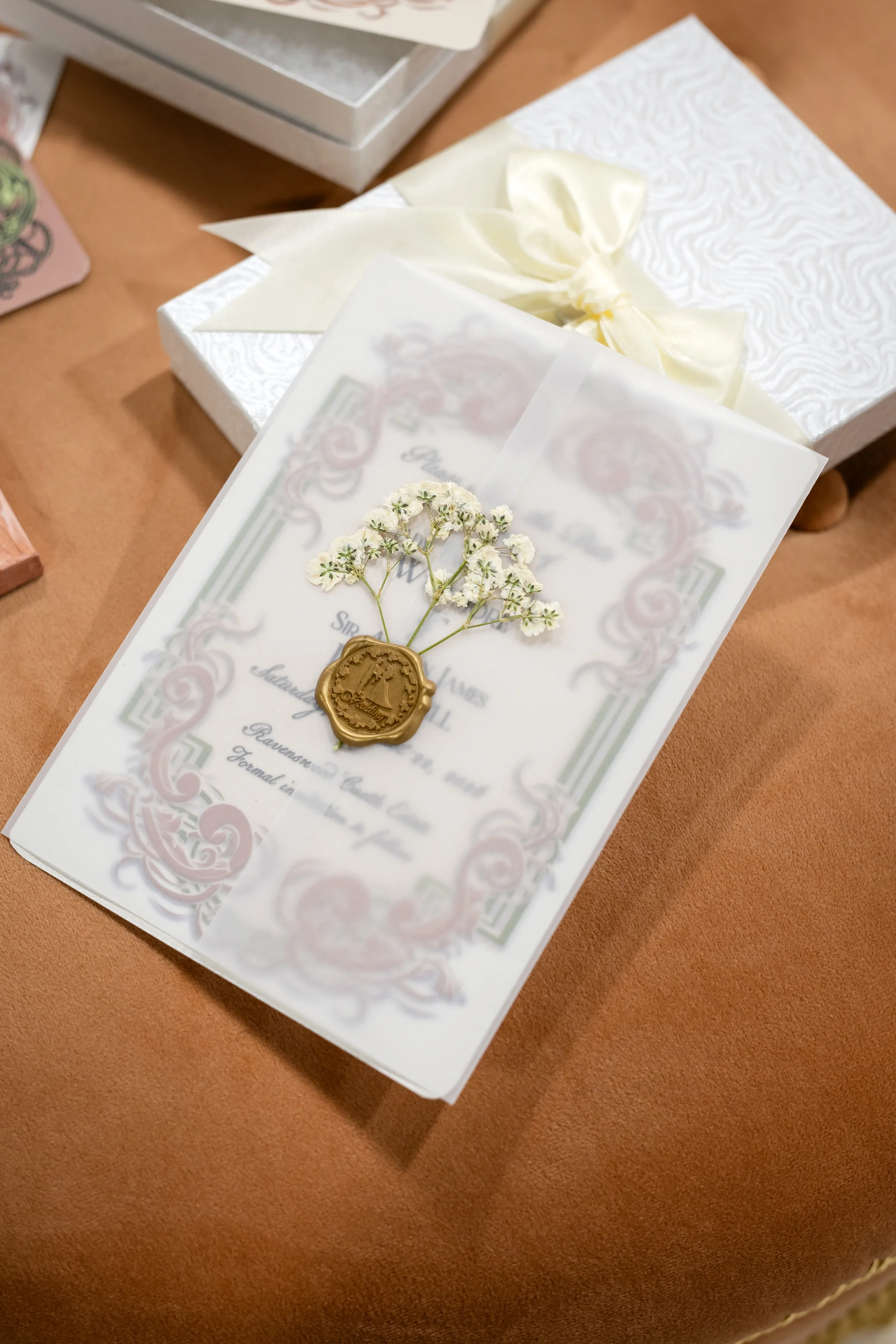 The Bride’s Secretary brought a royal-worthy stationery and printed pieces, embracing the color palette of green, pink, white, and gold. The invitation suite included an invitation and a details card wrapped in vellum, then secured with a gold wax seal, complete with dried florals, and placed in a decorative white box.