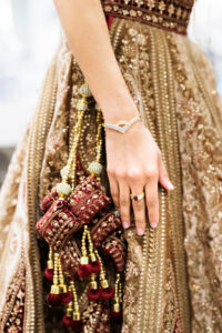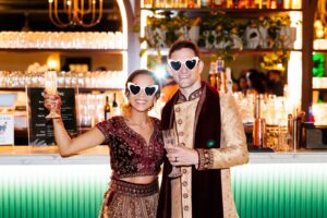 The couple chose a classic black-and-white color palette for the day, beginning with a white dress and black tuxedo. Since Bethany is half Indian and half American, it was important for her to include her heritage. She wore detailed henna on her hands for the occasion, and both she and Tristan changed into Indian clothing (lehenga and sherwani) for dancing at the end of the night.