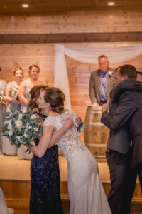 TELL US ABOUT THE FOOD, DESSERT AND ANY SPECIALTY BEVERAGES ON THE MENU: With a winter wedding, we went with chicken breast and Karley’s favorite meal, beef stroganoff. Karley’s Step-Dad made a large board to hold bagged donuts for all the guests to enjoy for dessert.