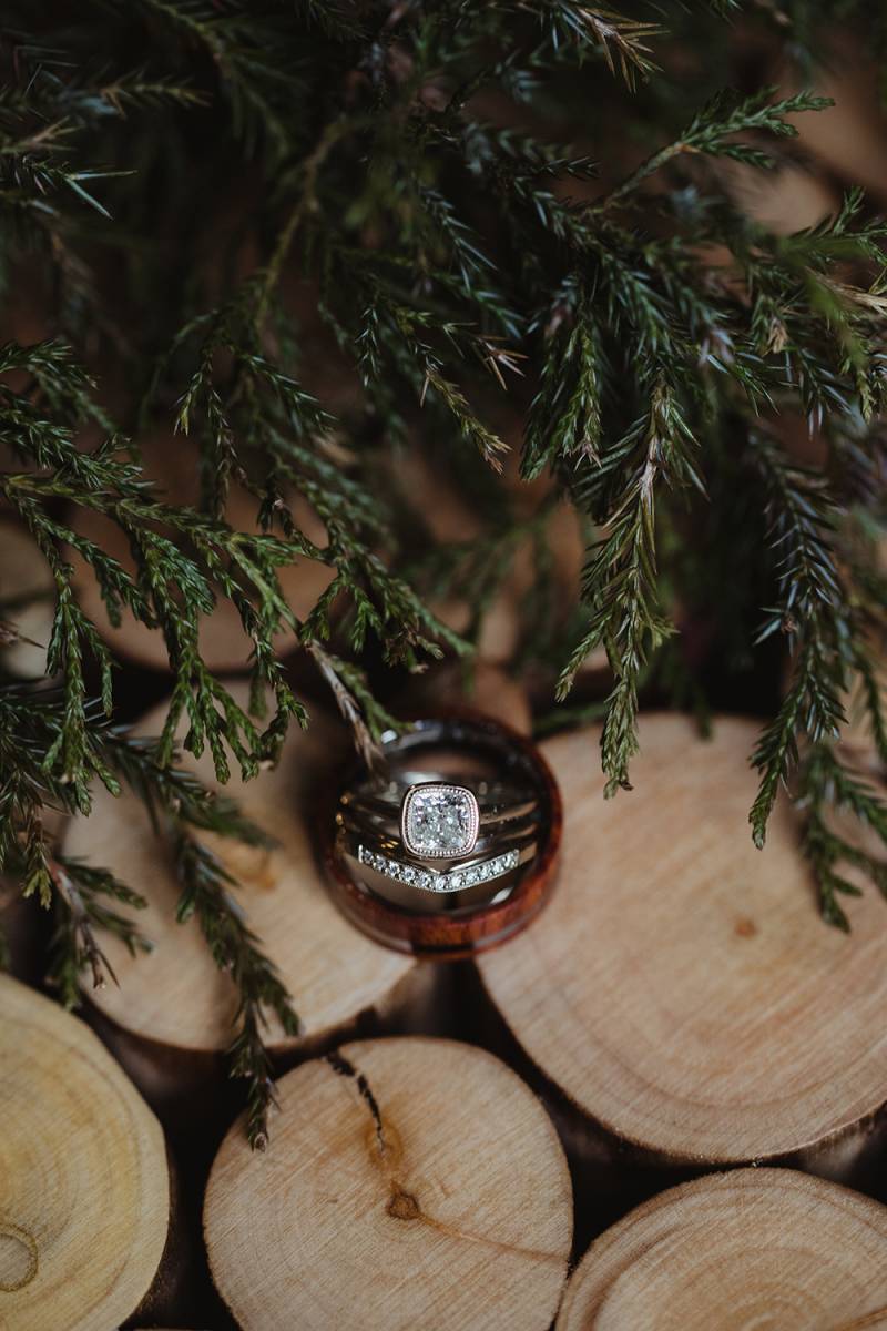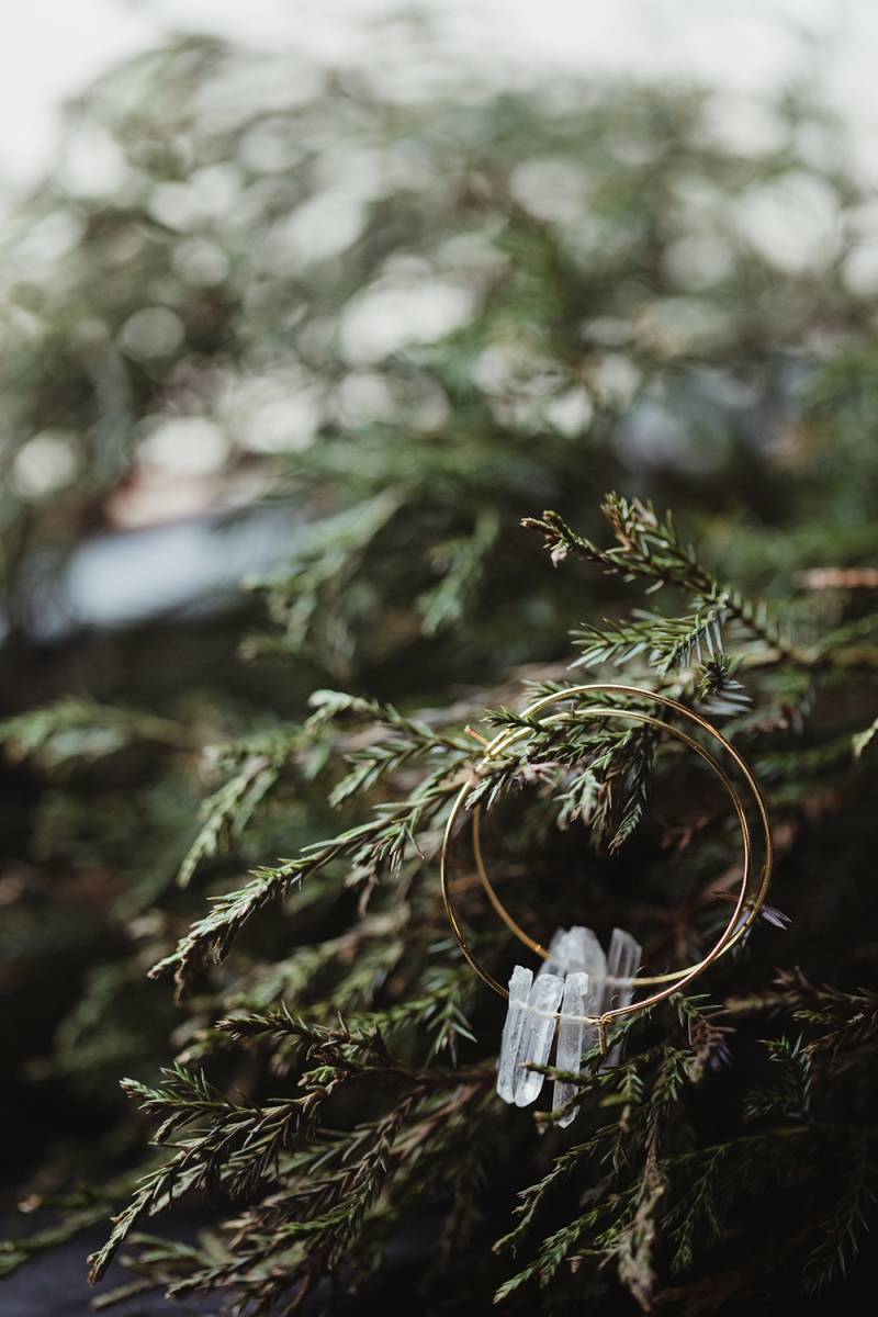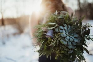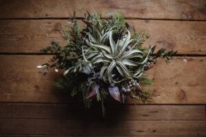 DESCRIBE YOUR WEDDING FLOWERS: Lots of different green textures, including air plants, succulents, and evergreens; with hints of lavender, winter berries and gold dipped feathers.