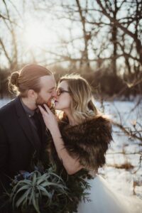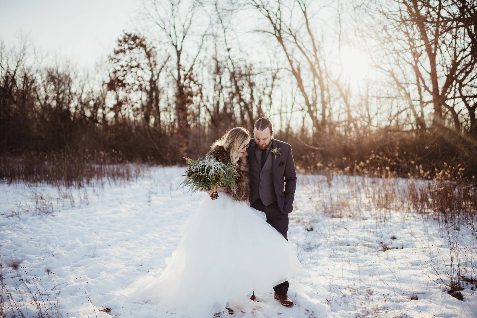 TELL US ABOUT YOUR DRESS: I decided to go with two dresses. Well, kind of three. The first dress I picked out was from a store near Wausau. I went shopping with my mother-in-law and sister-in-law exactly one week after Matt and I got engaged. I tried on several dresses, but the one I chose fit like a glove and we bought it off the rack. It literally needed zero alterations! My second dress was slightly more complicated. It started out as me looking for a reception dress since we were getting married on New Year’s Eve, I definitely wanted a dress change as our wedding transitioned into a NYE party. I found a cute short dress at Mes Amies boutique in Hilldale Mall. Shortly after I purchased the dress I thought about how great it would be if I bought a bridal skirt to wear over my reception dress, that way it would look like a full-length wedding dress and I could wear it for photos before the ceremony. In doing so my ceremony dress wouldn’t get trashed from the snow and I would get to wear something that was unique to my style.