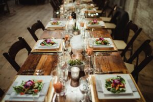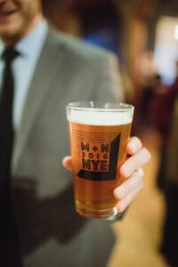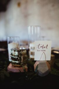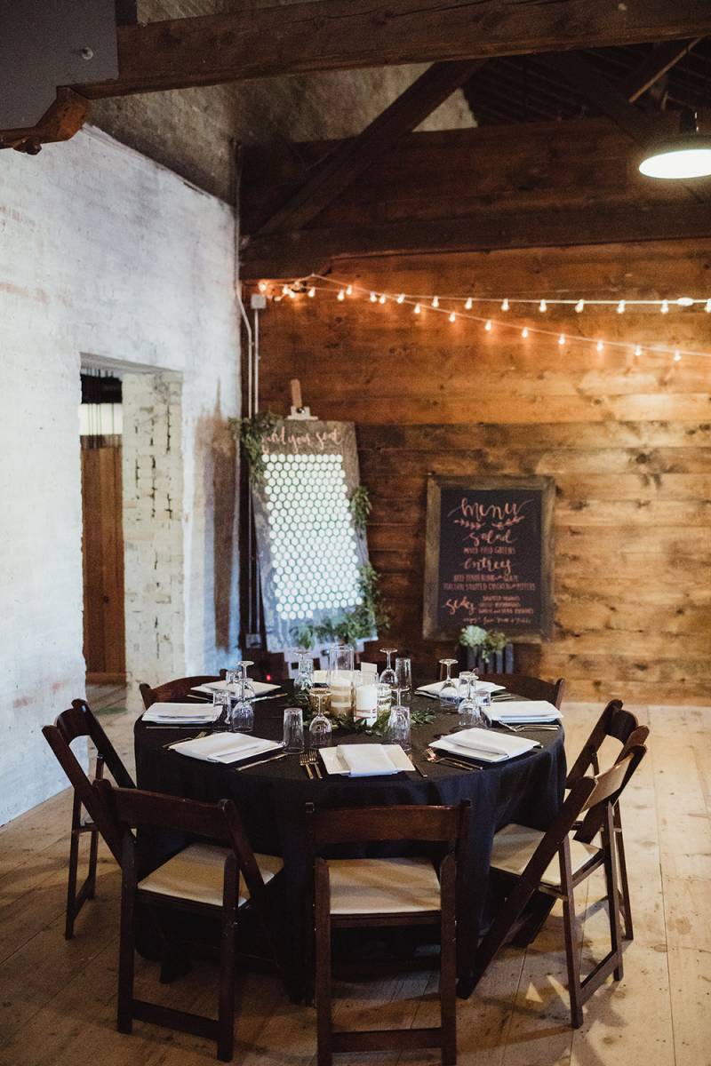 DID YOU USE ANY SPECIALTY CHAIRS, TABLES, LINENS OR DINNERWARE? We decided to use black linens so the metallic centerpieces would pop. Our chairs were from the Lagaret, we rented our head tables from A La Crate, and we also had custom pint glasses made.