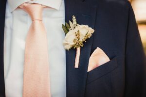 DESCRIBE YOUR WEDDING ATTIRE: Our wedding attire was true to our personalities – comfortable yet stylish, and my dress was flowy and romantic. Myles loves blue, so of course, he had to wear a blue suit, and I wanted to ensure my look was timeless, organic, and soft.