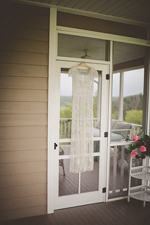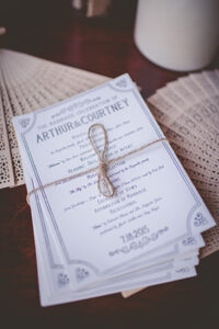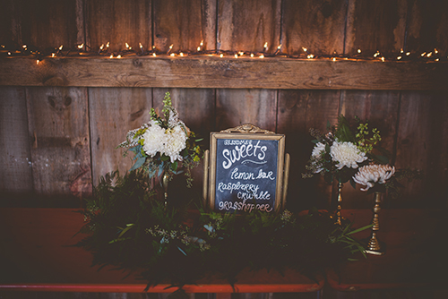 From custom made paper goods, signs and wood centerpieces to farm tables, lush greenery, white blooms and dessert table recipes from Courtney’s grandma, this made for an intimate and relaxing affair at Century Barn Events in Mt. Horeb. Courtney explains, “We used a vintage lace tablecloth from my grandma’ s house on our family photo table. Arthur’ s mom illustrated our place cards. We used champagne flutes from my grandparent’ s 50th wedding anniversary. My dad and uncles made a lot of the wood centerpiece elements, and then we used vases and bottles from A La Crate for the flowers.”