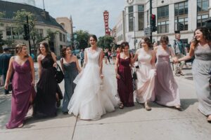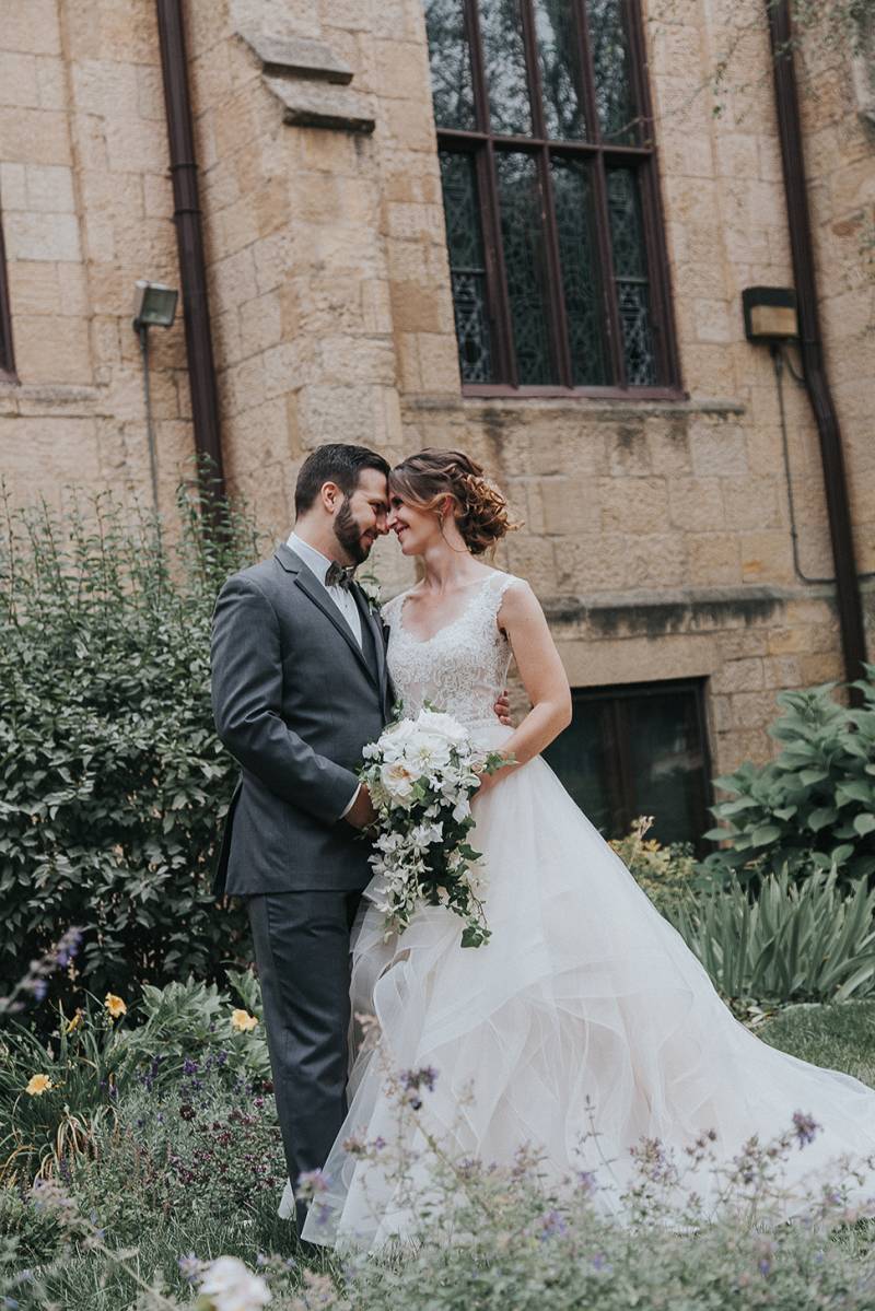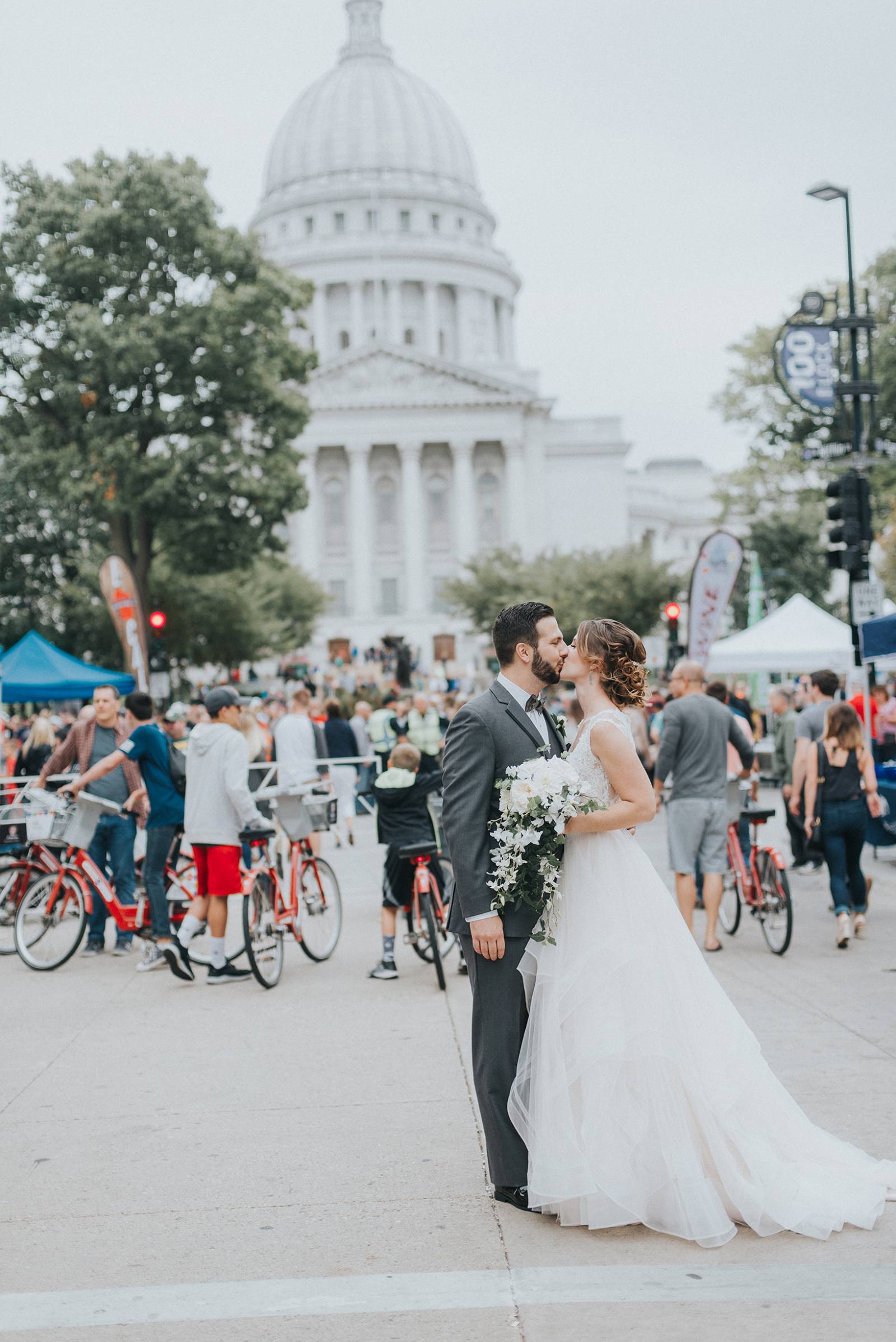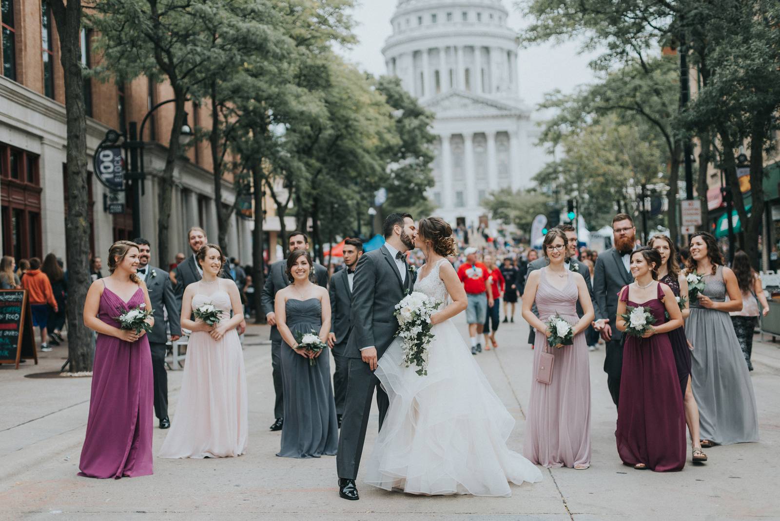 This couple met while attending UW-Madison, so it was only fitting for them to tie the knot right where it all began. The lush all-white florals from Blooms by Brandi served as the perfect accent to a rich jewel-toned bridal party and their authentic Madison photo session…not to mention the Memorial Union chairs cake topper. With Karly Jo Photography behind the lens, take a stroll with us downtown Madison from the church, State Street to campus and the Terrace with a few cold brews in between.