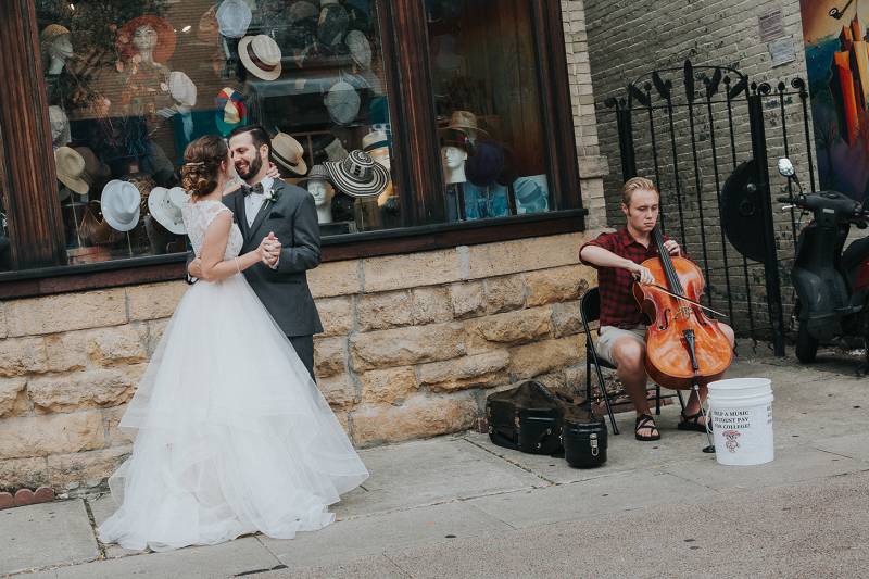 WHAT WAS YOUR FAVORITE MOMENT FROM YOUR WEDDING? That’s impossible to pick, the whole day was incredible and full of love but here are a few highlights! Standing on the alter being totally in the moment with my handsome groom, sharing our handwritten vows, and seeing our guests give us two standing ovations; glueing a penny to my shoe with the help of my bridesmaids right before walking down the aisle (an Irish tradition!); when our photographer paid a street musician to play Ave Maria, the song I walked down the aisle to, so we could have our unofficial first dance right on State Street; getting rained on- it’s good luck!; crying so many happy tears that my fake eyelashes fell off halfway through the evening, and dancing the night away to live jazz with everyone we love so dearly.