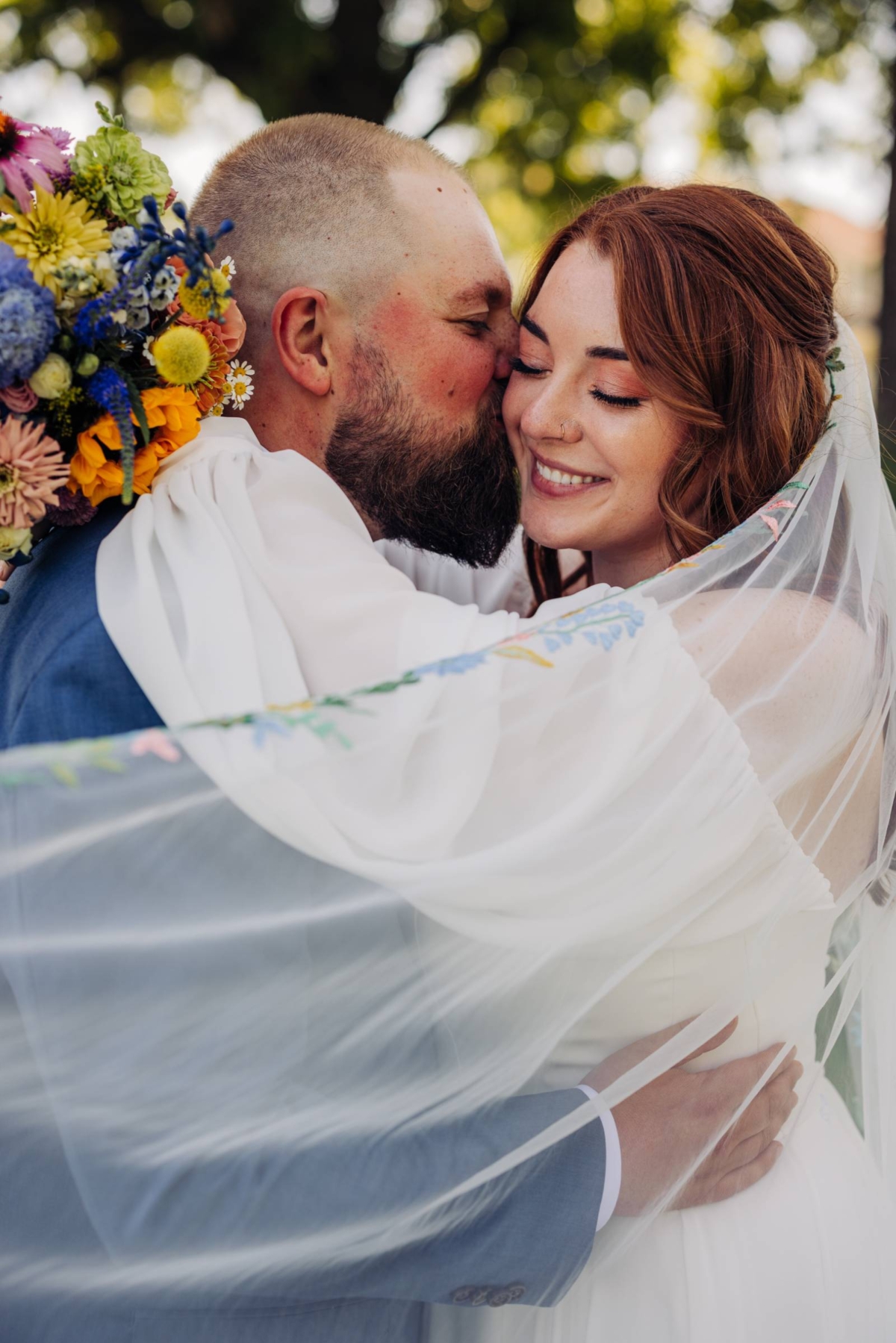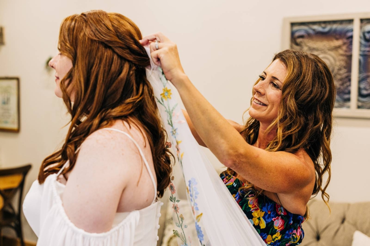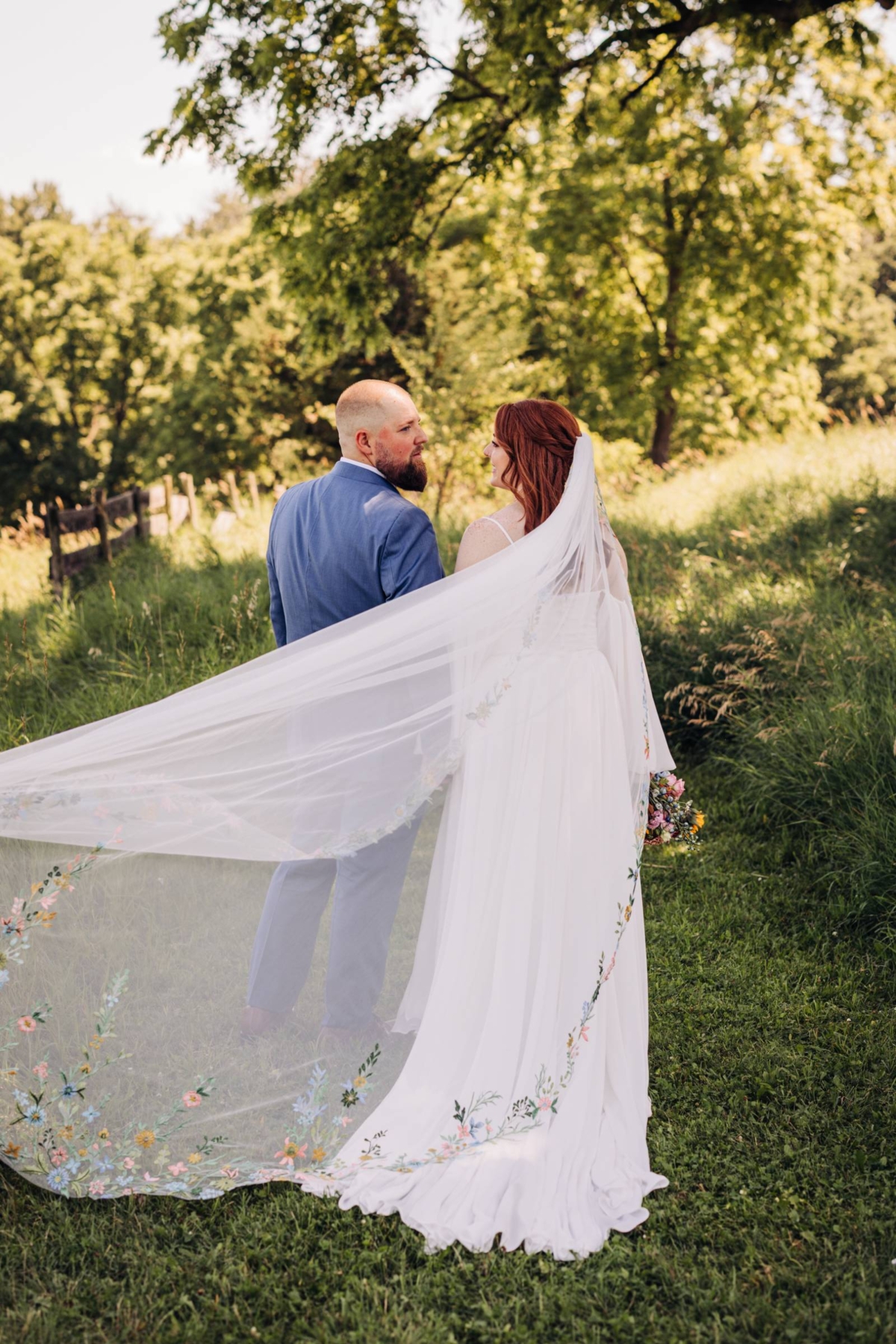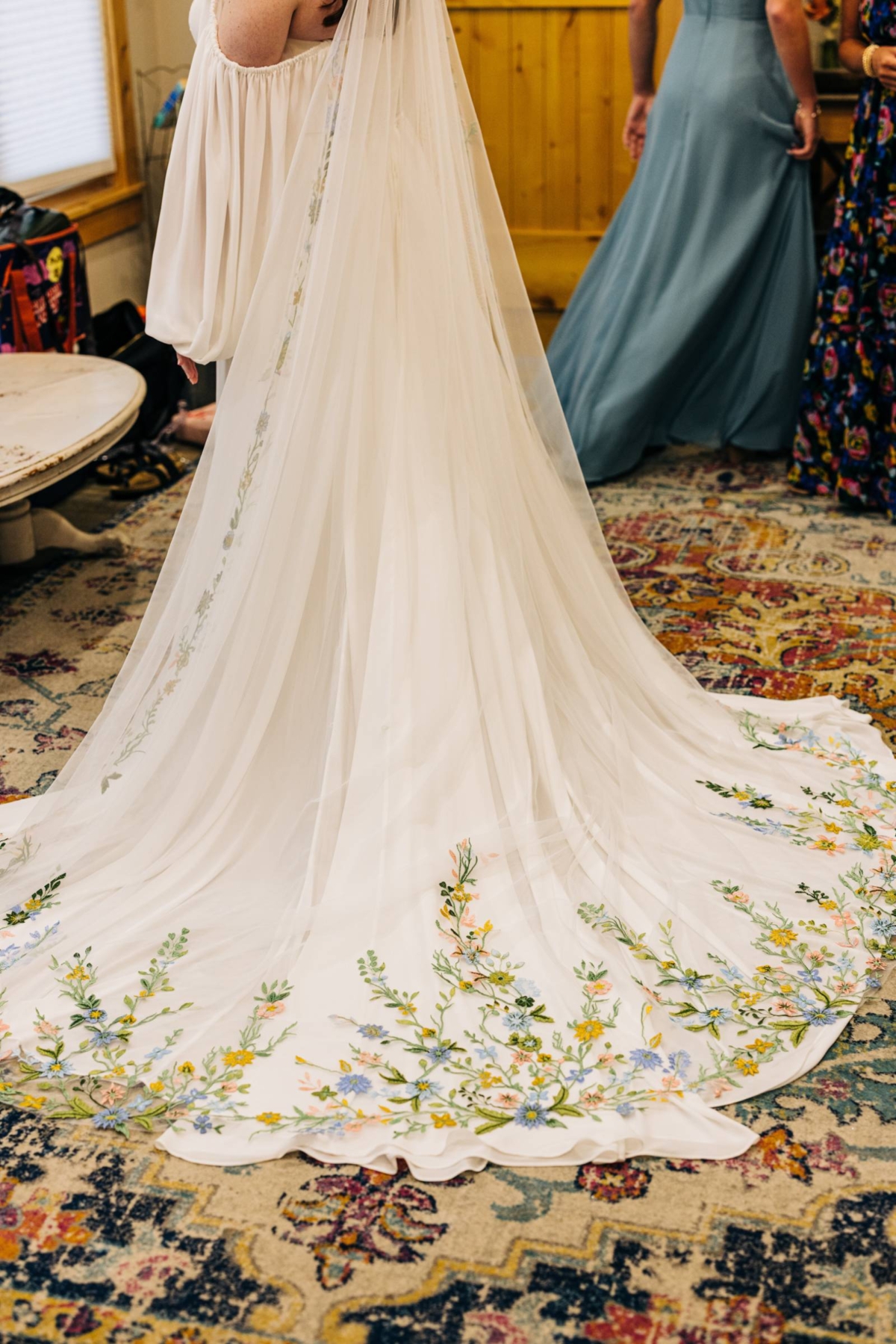 Kiley wore an off-the-shoulder, long-sleeve, boho gown from Bon Bon Belle. The fabric was sleek and simple, with graceful, draping fabric. She accessorized the gown with a pop of color on her veil, featuring colorful lace detailing along the edges.