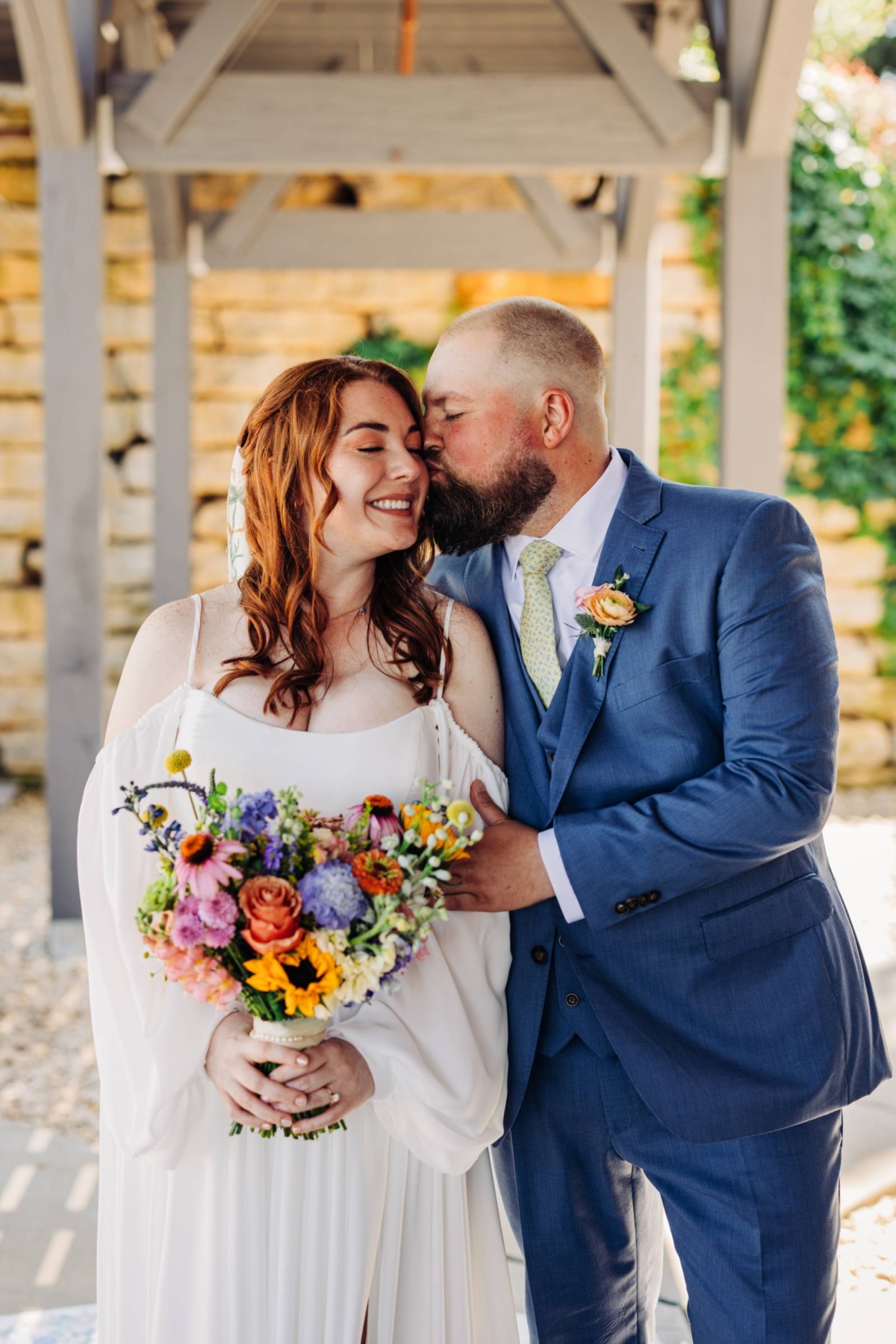 For the occasion, Platinum Bond Salon styled Kiley’s hair into a softly waved, half-updo, showcasing her red hair and perfect for her veil. True to You Artistry used warm, peachy tones for Kiley’s eyeshadow, cheeks, and lips, bringing out her natural beauty.