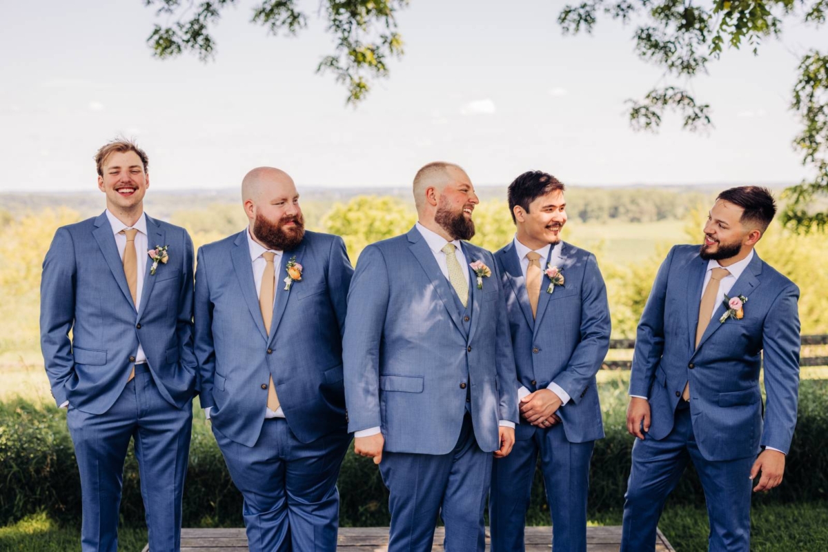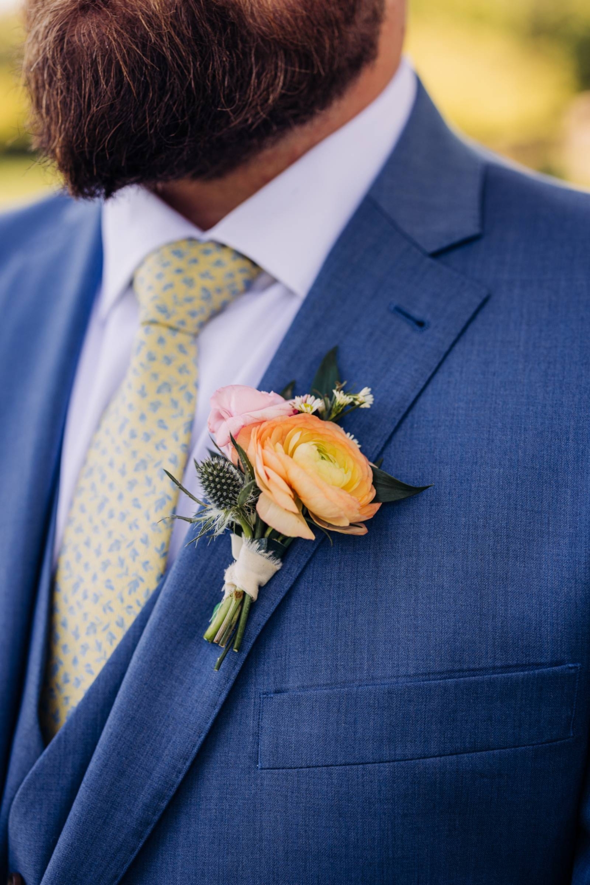 Nathan and his groomsmen wore blue suits from Indochino, paired with white undershirts, floral lapels, brown shoes, and pastel-colored ties.