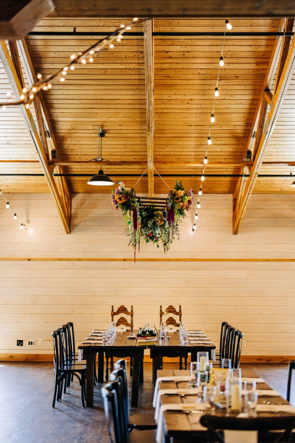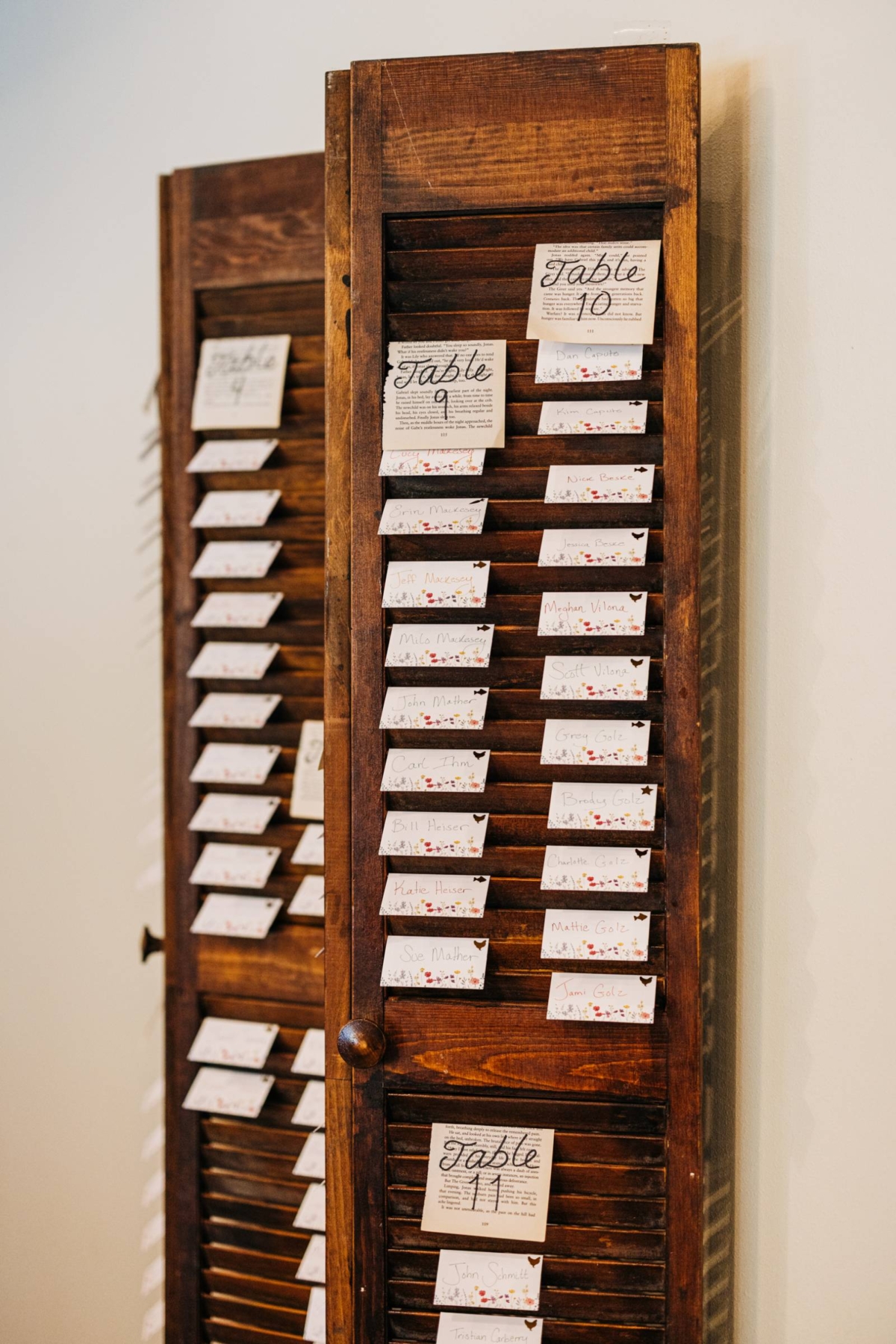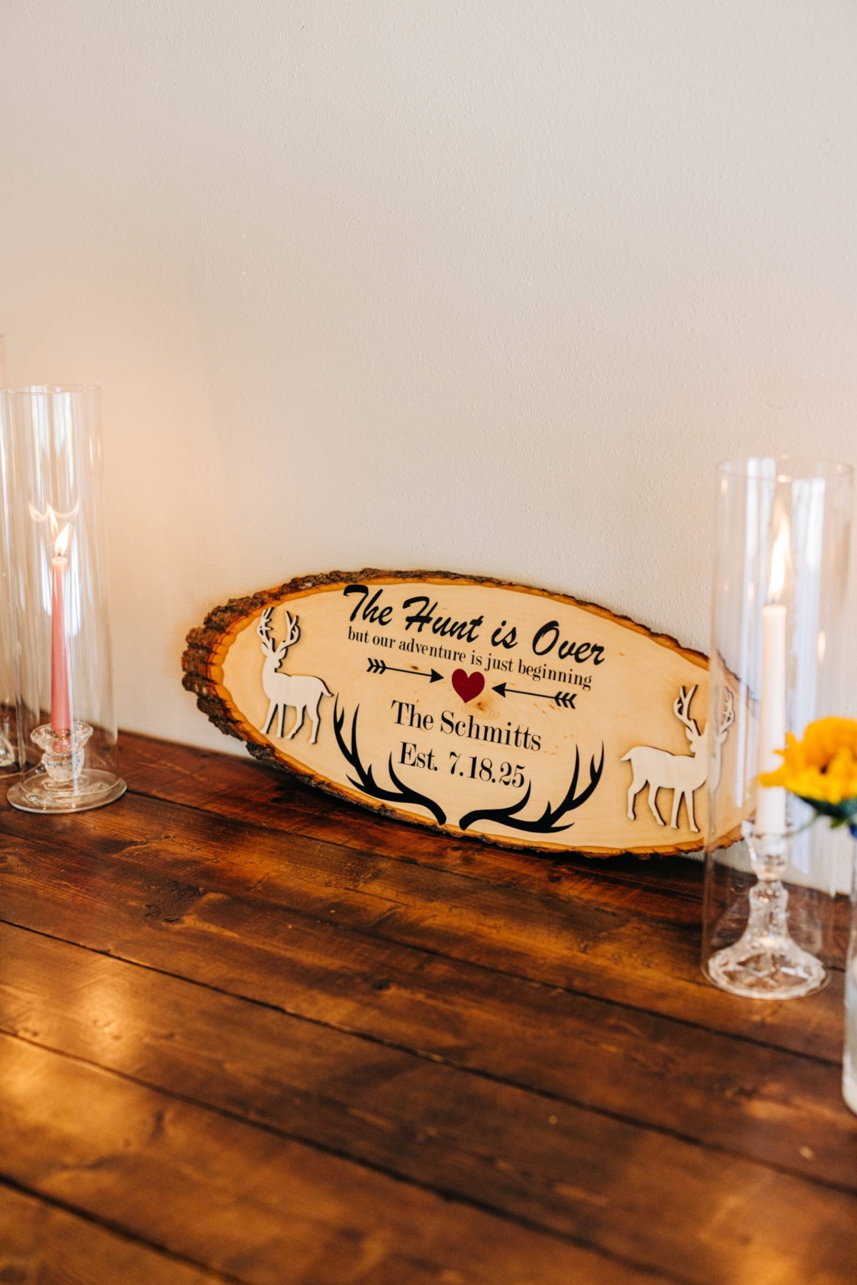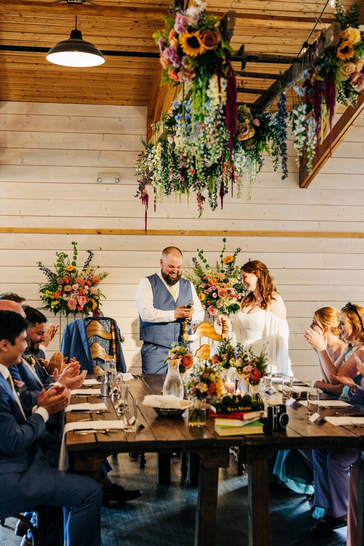 The whimsical wildflower theme continued at the reception, with florals dripping from the ceiling and adorning the tables. Kiley and Nathan created most of their own signage for the day–with some help from Kiley’s mom, including centerpieces made from thrifted books and handwritten table numbers. Other personal details included a custom bar menu honoring the couple’s two cats and seed favors. A custom, hunting-themed wooden sign also included deer details, as a nod to the couple’s proposal.