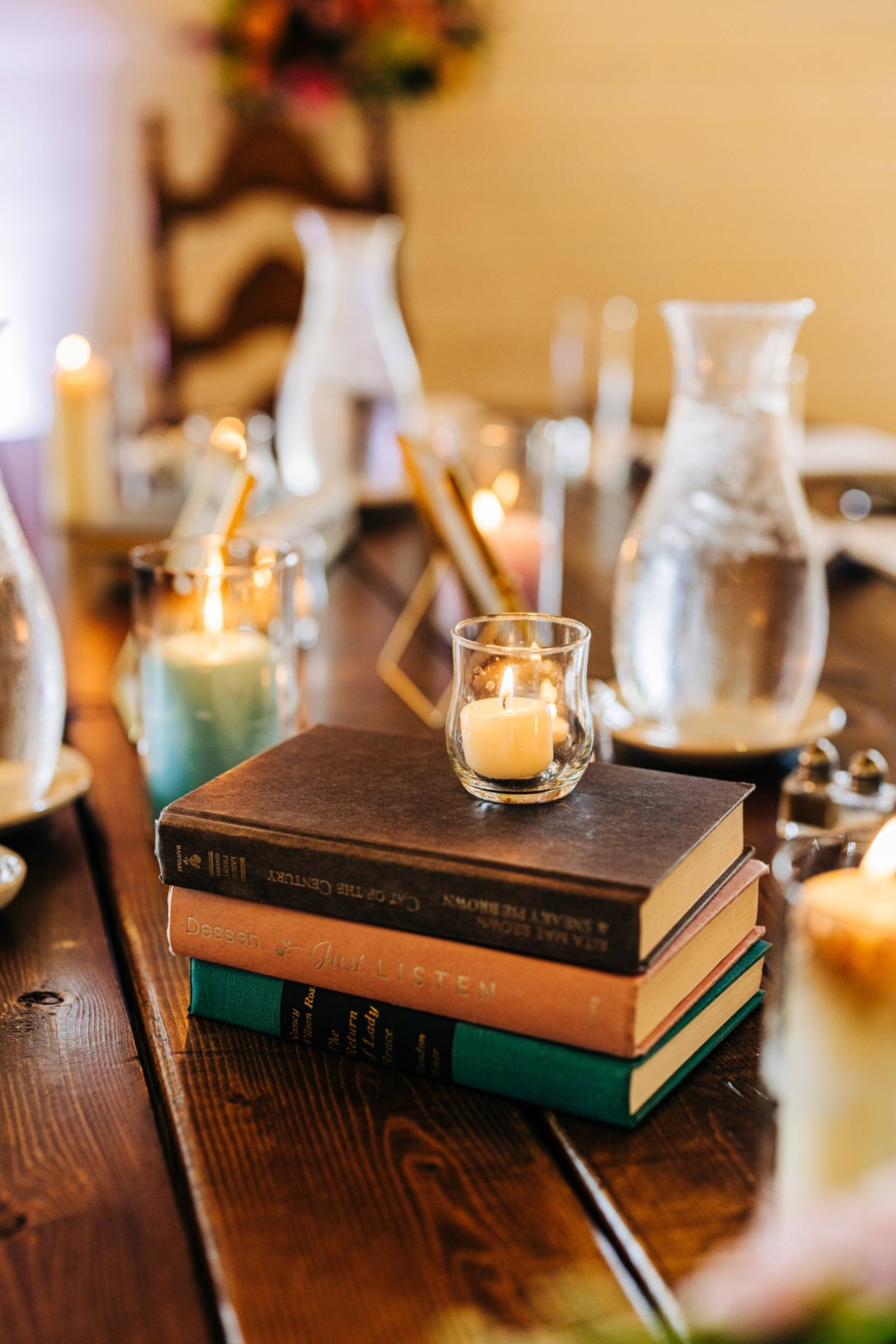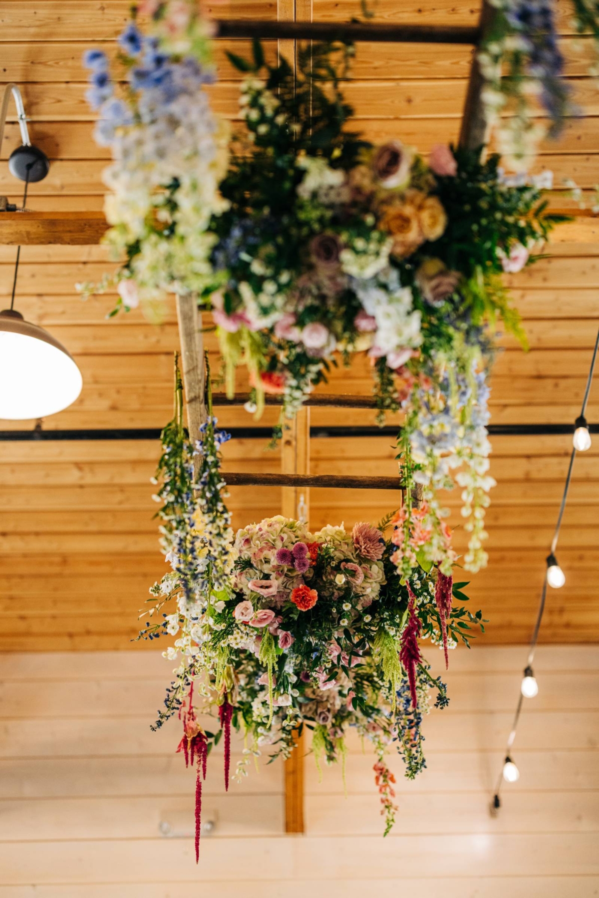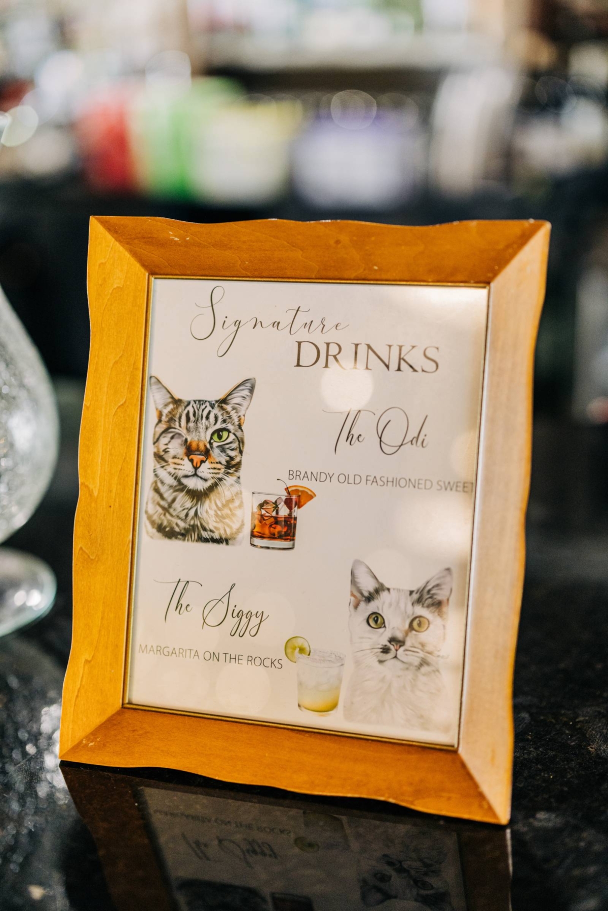 The whimsical wildflower theme continued at the reception, with florals dripping from the ceiling and adorning the tables. Kiley and Nathan created most of their own signage for the day–with some help from Kiley’s mom, including centerpieces made from thrifted books and handwritten table numbers. Other personal details included a custom bar menu honoring the couple’s two cats and seed favors. A custom, hunting-themed wooden sign also included deer details, as a nod to the couple’s proposal.