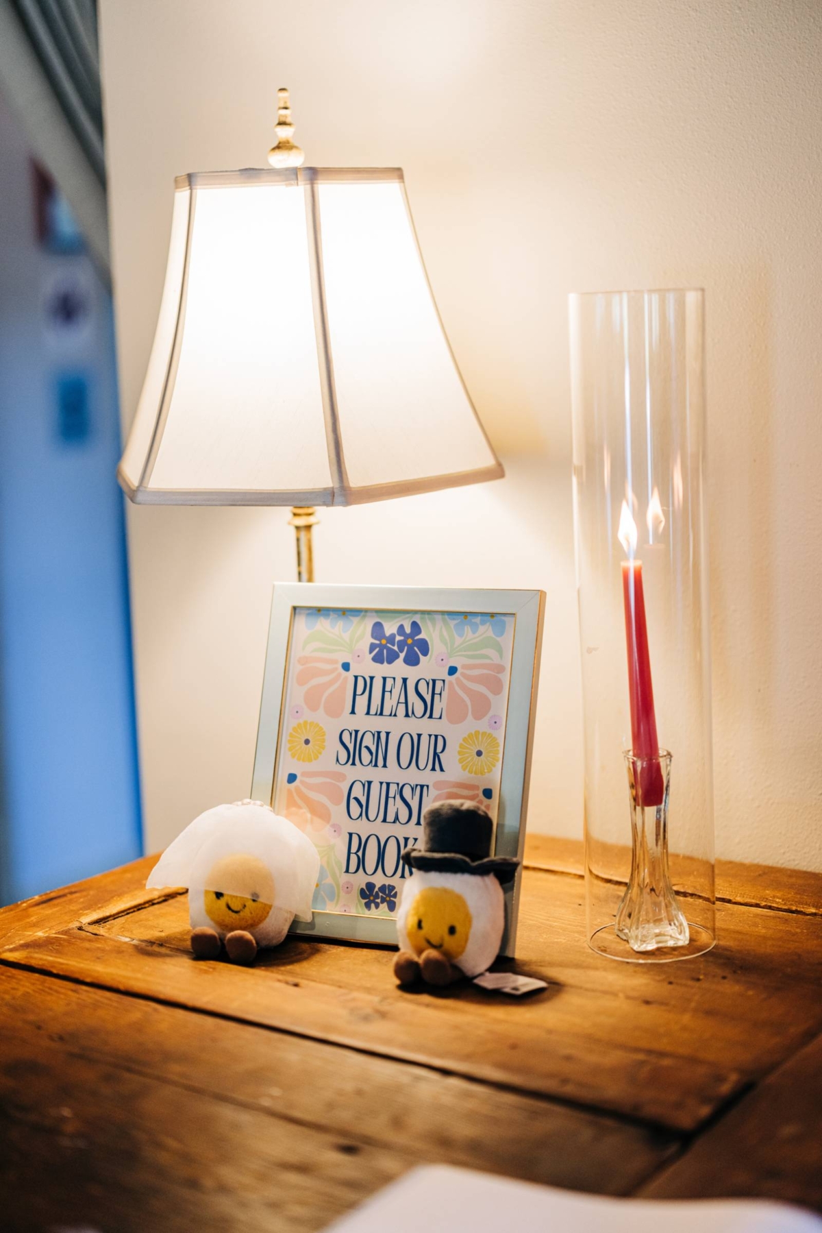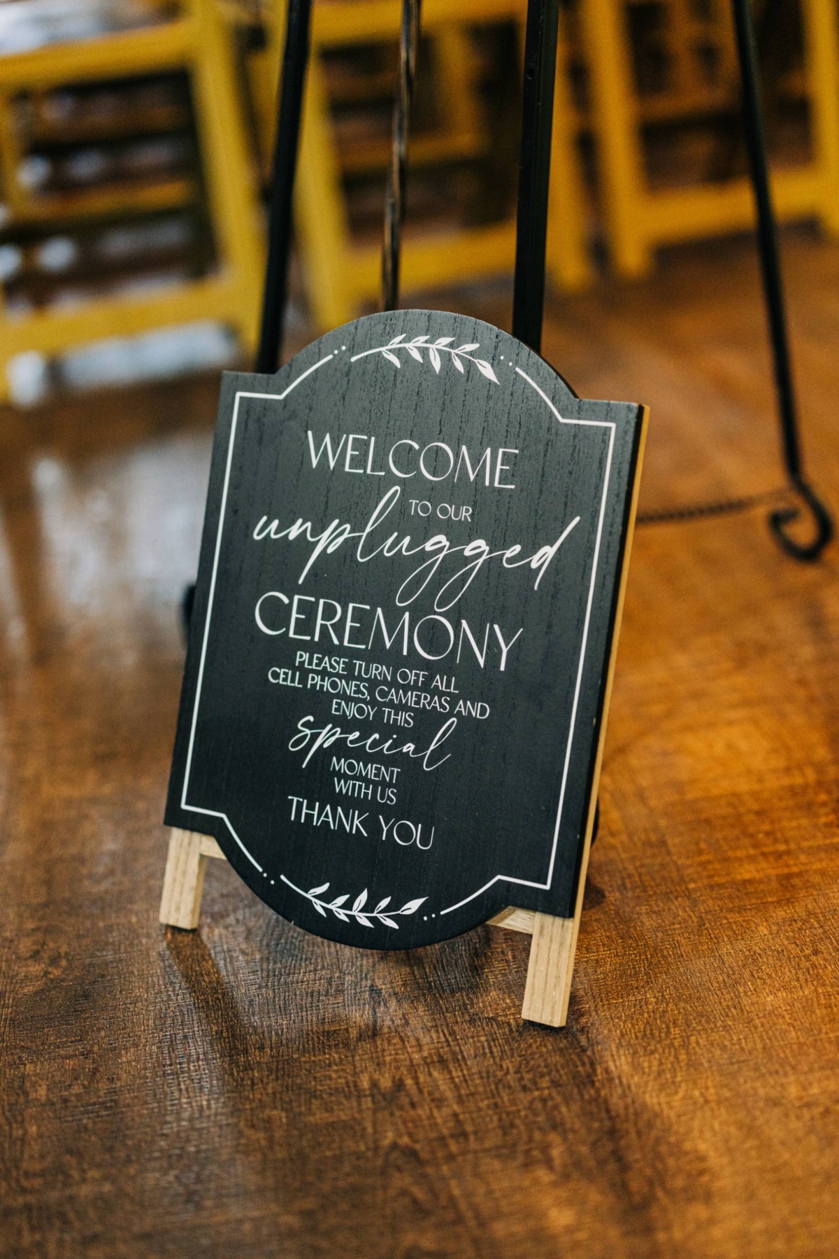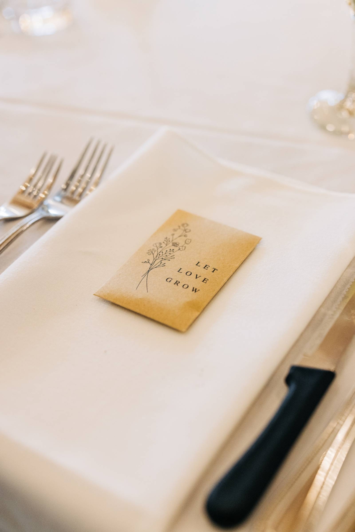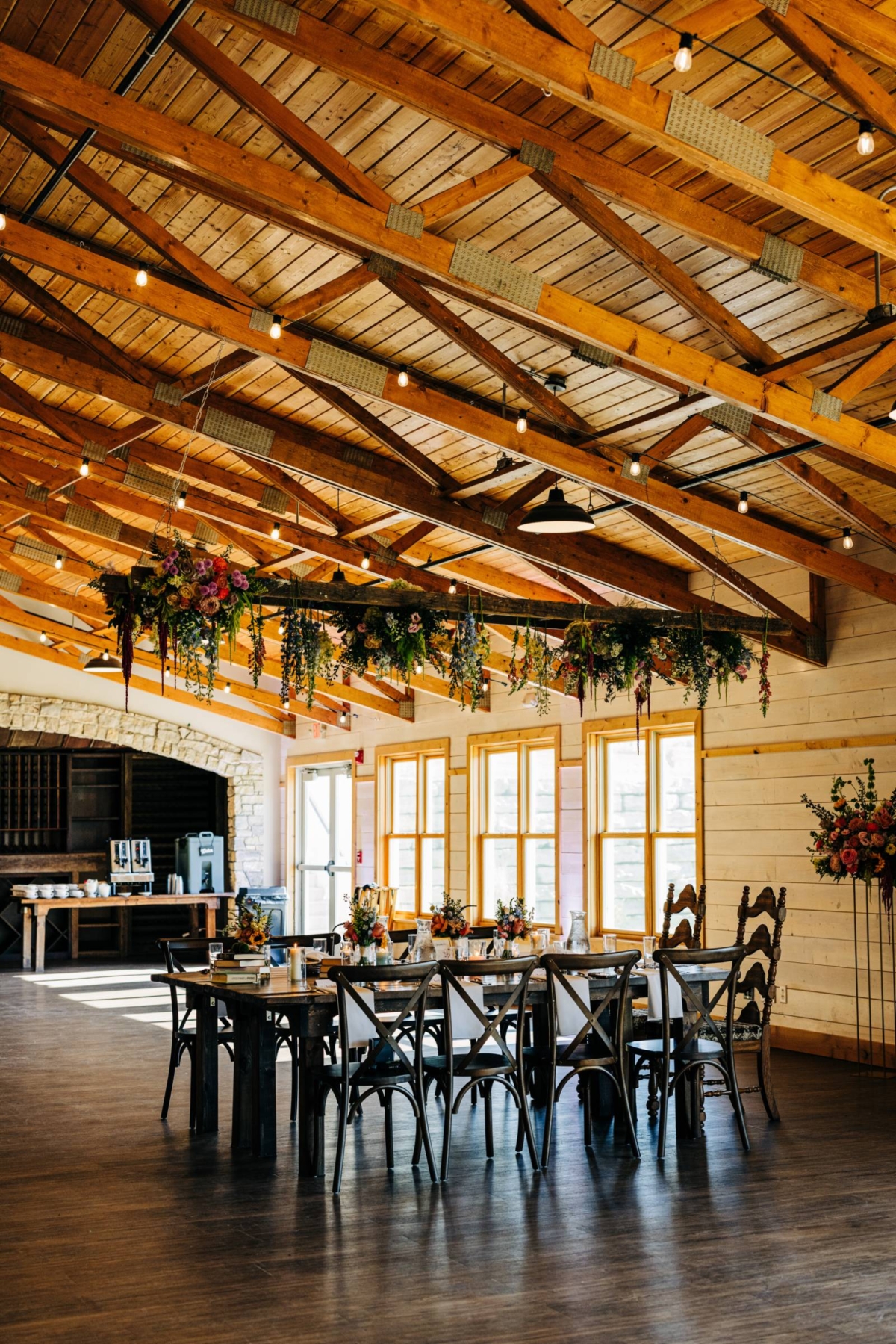 The whimsical wildflower theme continued at the reception, with florals dripping from the ceiling and adorning the tables. Kiley and Nathan created most of their own signage for the day–with some help from Kiley’s mom, including centerpieces made from thrifted books and handwritten table numbers. Other personal details included a custom bar menu honoring the couple’s two cats and seed favors. A custom, hunting-themed wooden sign also included deer details, as a nod to the couple’s proposal.