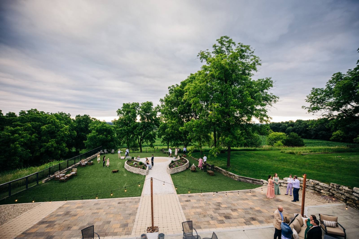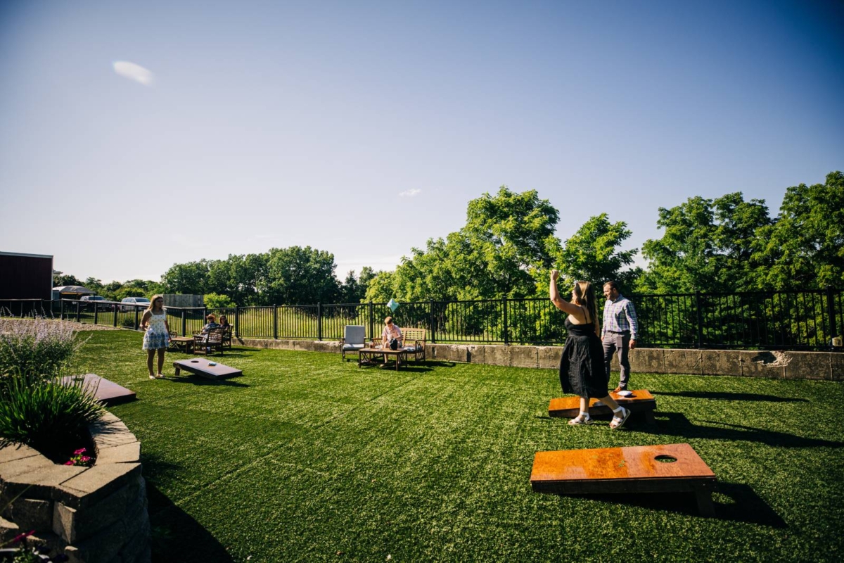 Before and after dinner and speeches, guests enjoyed the venue’s outdoor spaces, sipping on drinks and playing lawn games on the patio and lawn. Nathan made custom cornhole boards, and he and Kiley enjoyed watching their families and friends come together in friendly competition.