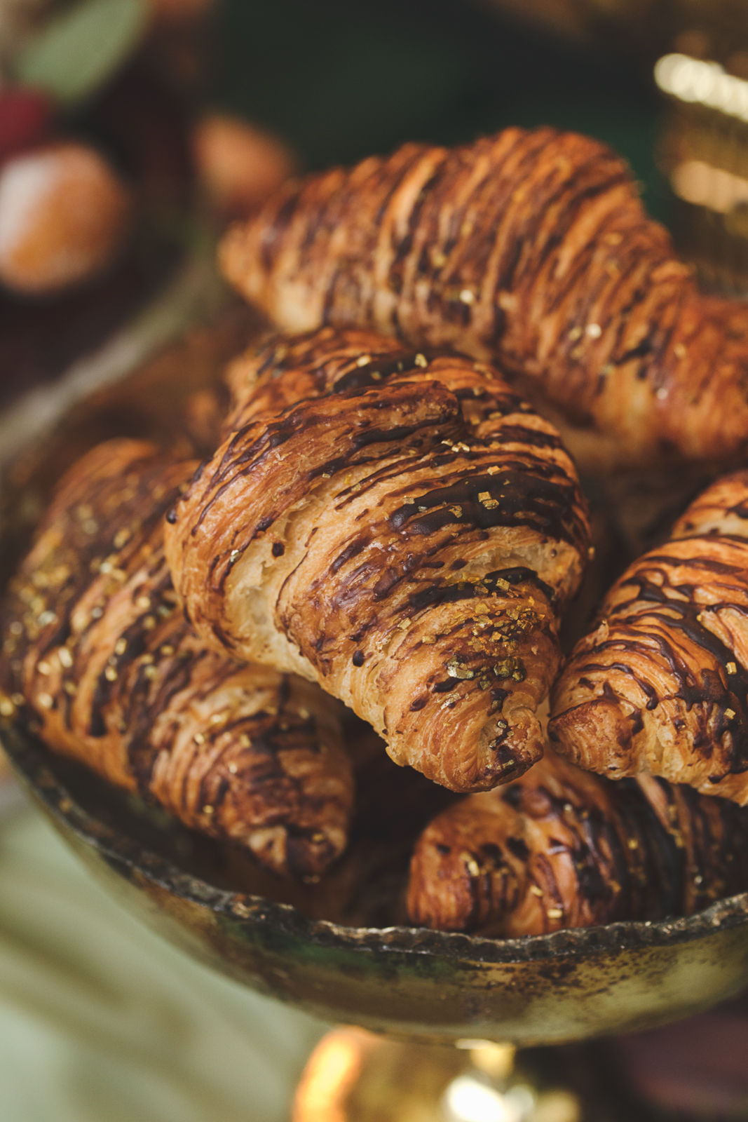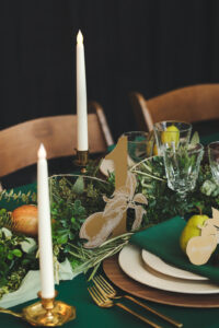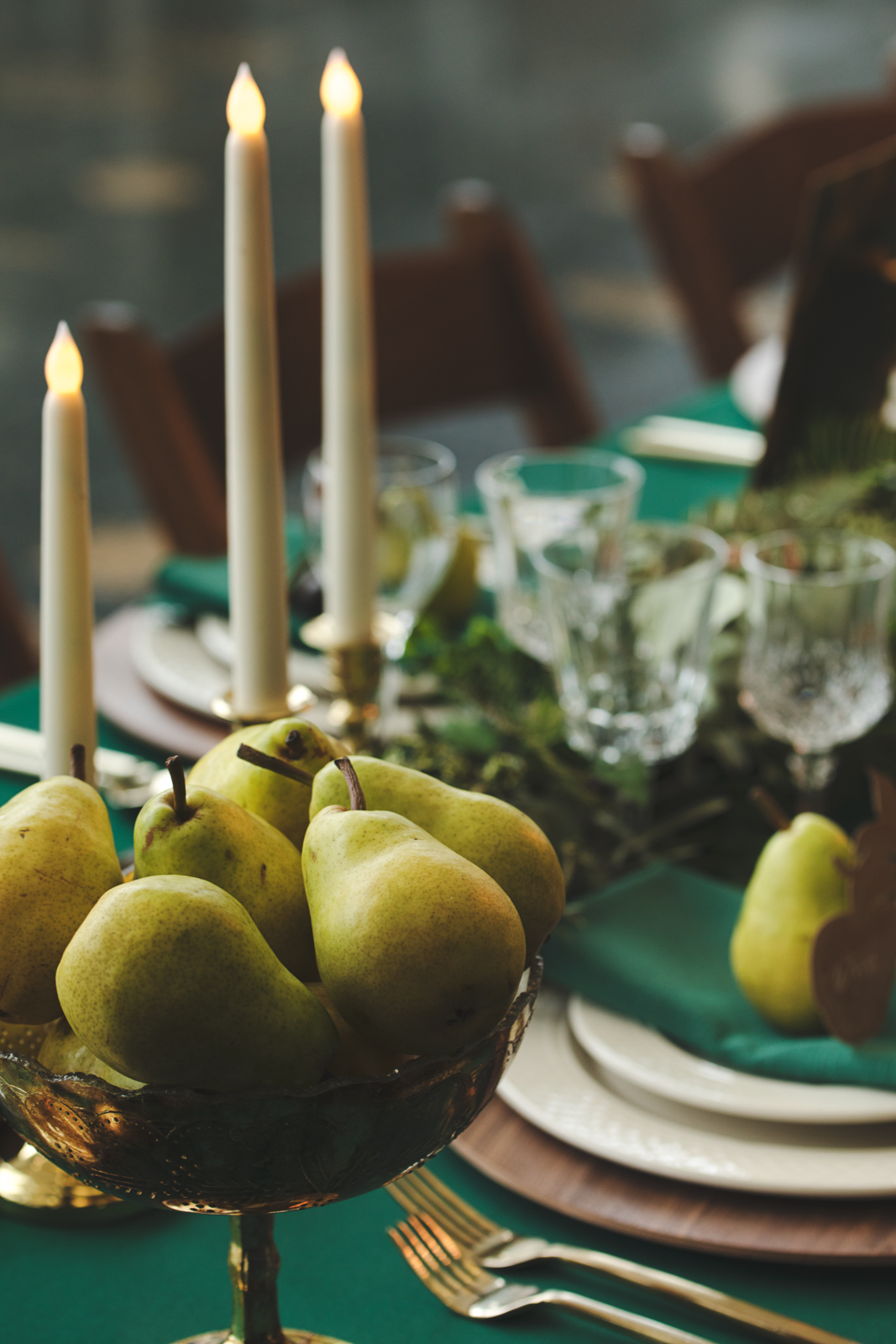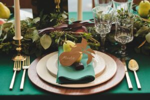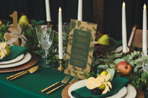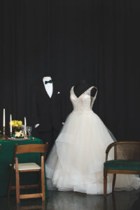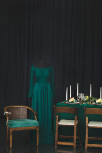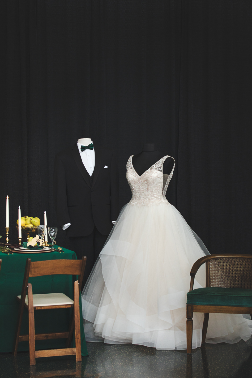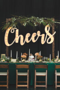 A textured backdrop, large king’s table, deep tones with a touch of gold creates an immersive experience in this lavish pear and emerald inspired wedding scape designed by LK Bridal Studio at our Madison Winter Show. An intimate seating arrangement, from Event Essentials, sits in front of a dark walnut arch, from Rustic Accent Rentals, a playful ‘Cheers’ marquee, from EZPZ Marquee, adds a fun lighting element to the room. For this affair, the small details create a cohesive and breathtaking sight. Mercury vases, from Simply Glamorous Rentals at Oregon Floral, hold delicious pastries created by Hy-Vee Cakes, Catering & Floral. A bridal gown with a horsehair braid trim adds a truly extravagant touch, while bridesmaid’s don a full length, lace-bodied gown, both from Brides N’ Belles. The groom in a classic tux, from Men’s Wearhouse. From the pear inspired stationery to the lush floral, this wedding scape accents a dark, decadent, and romantic affair. Scroll to see more!