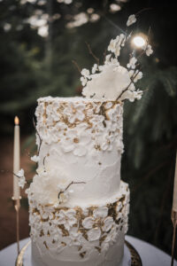 This fairytale-inspired design by Cowboy David’s Bakery had two tall tiers of textured white frosting and sculpted florals with shimmering gold pearl accents. Artful gold leafing crowned each tier, while fresh flowers and twig decor completed the woodland aesthetic.