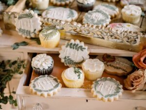 Coordinating cupcakes and custom cookies featured a mix of piping techniques and hand-lettered designs. Their varying shapes and sizes made a great option for couples seeking easy-to-serve treats.