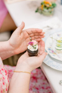 Mini cupcakes, colorful macarons, and dainty charcuterie bites completed the elegant table, offering a lovely balance of sweet and savory, perfect for an afternoon celebration.