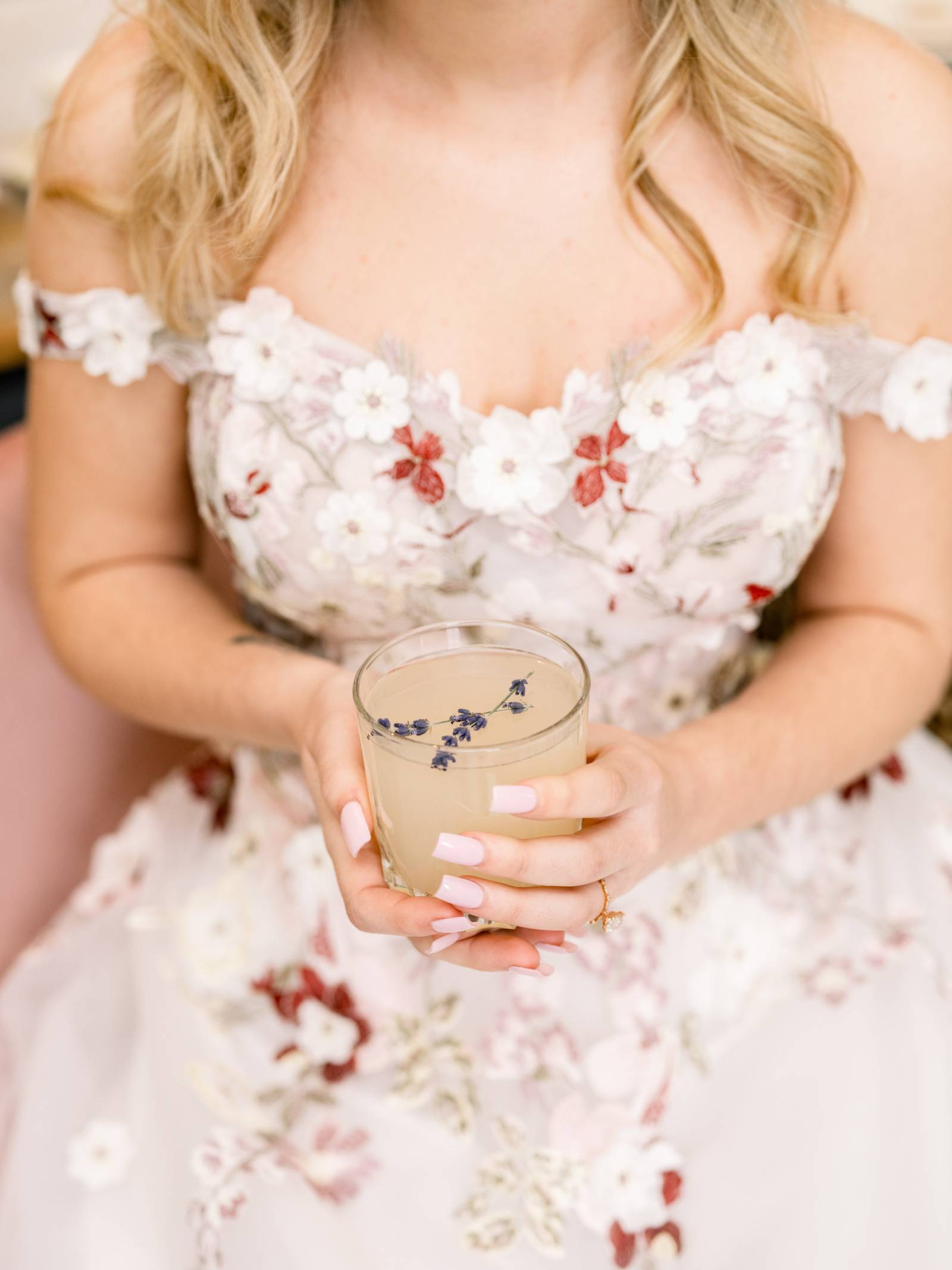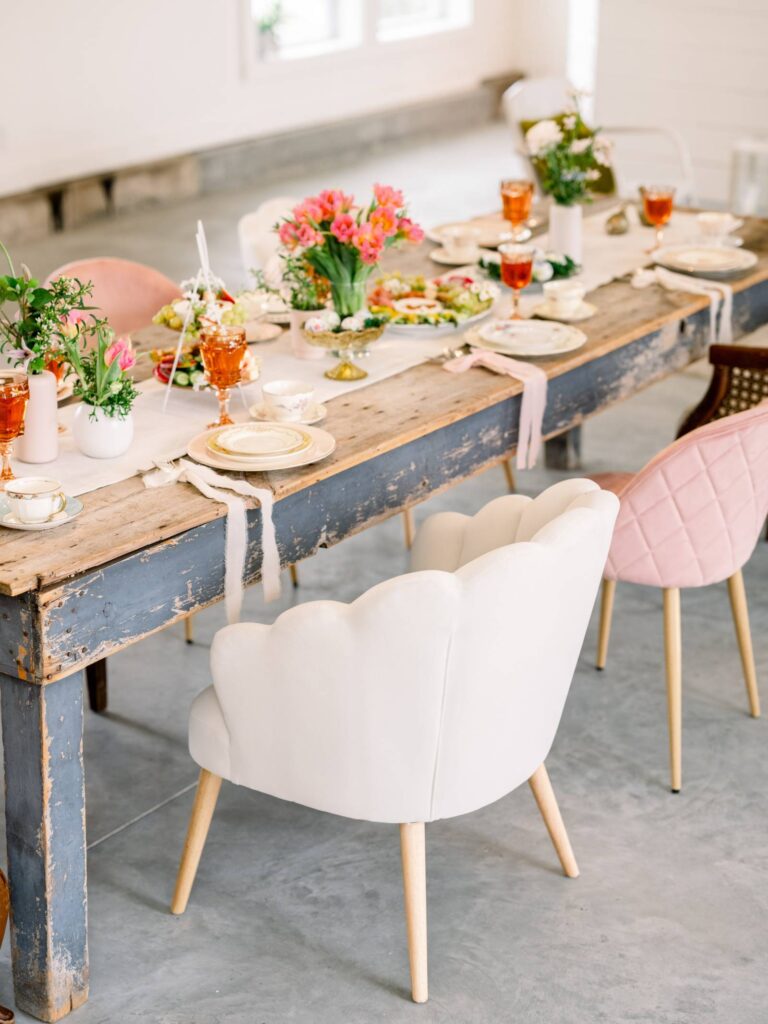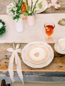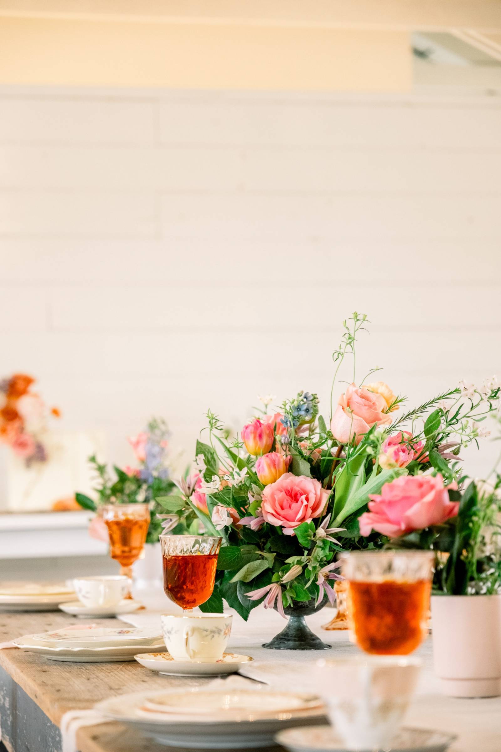 Delicate assorted dishware from Velvet Rentals lays the foundation for a floral-inspired tablescape ready for guests to sit and sip on a refreshing lavender lemonade.