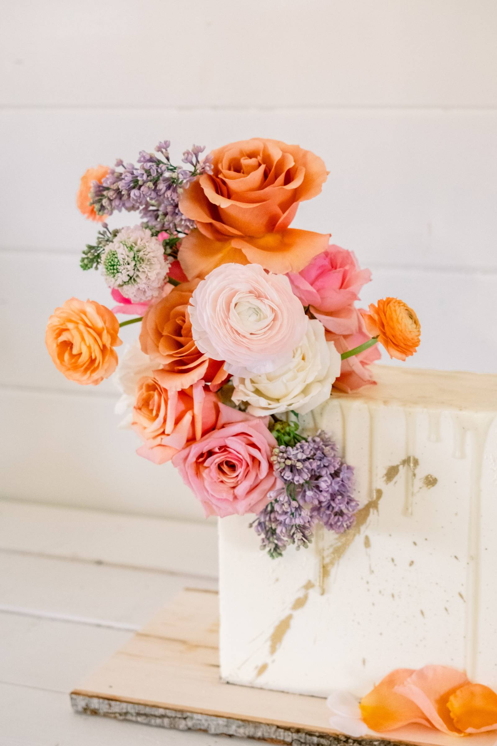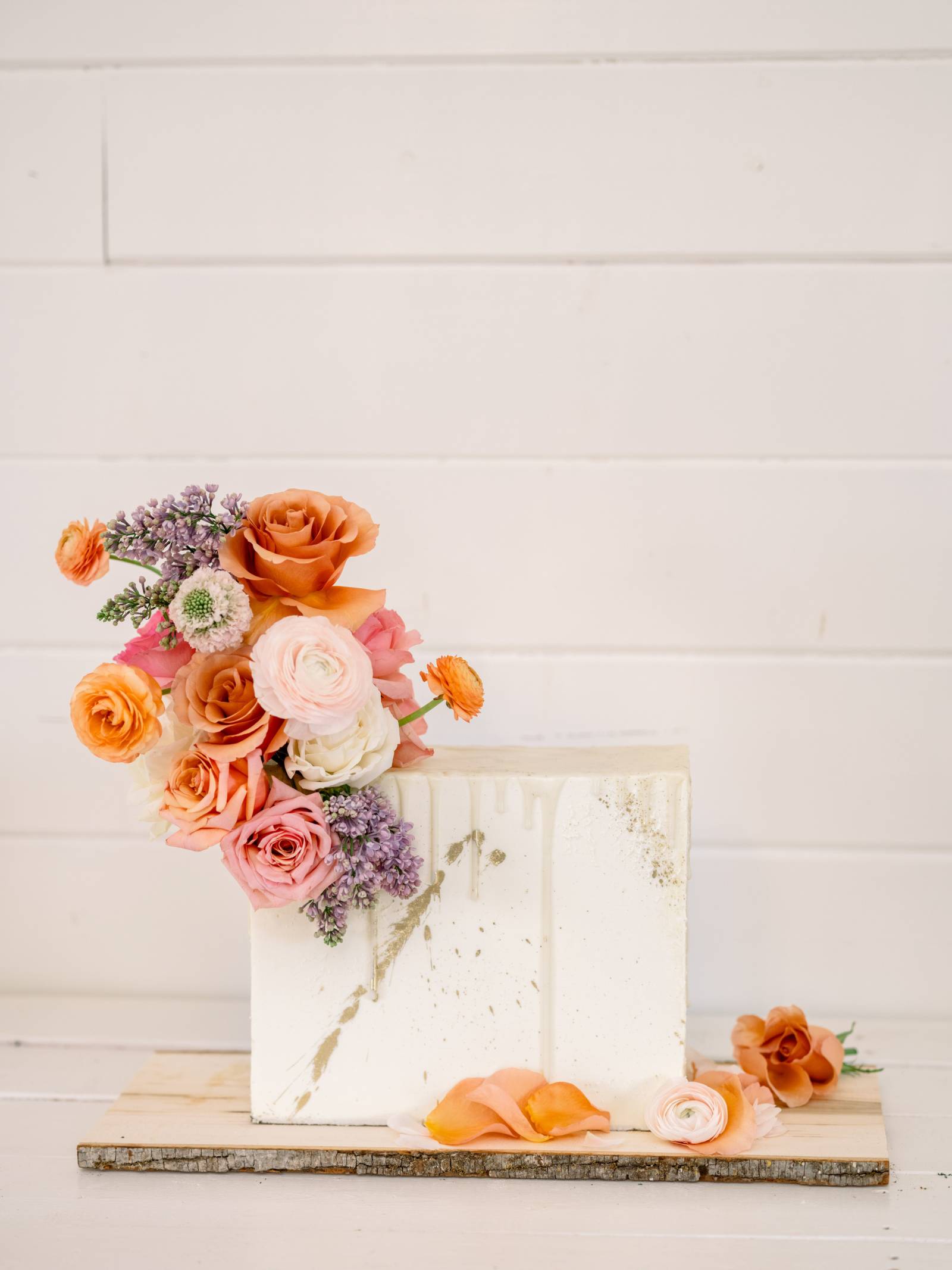 A rectangular cake from The Baked Lab takes a stunning and contemporary twist on a classic single-tier wedding cake, bringing a modern elevation to the overall design of the day.