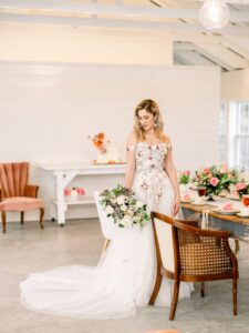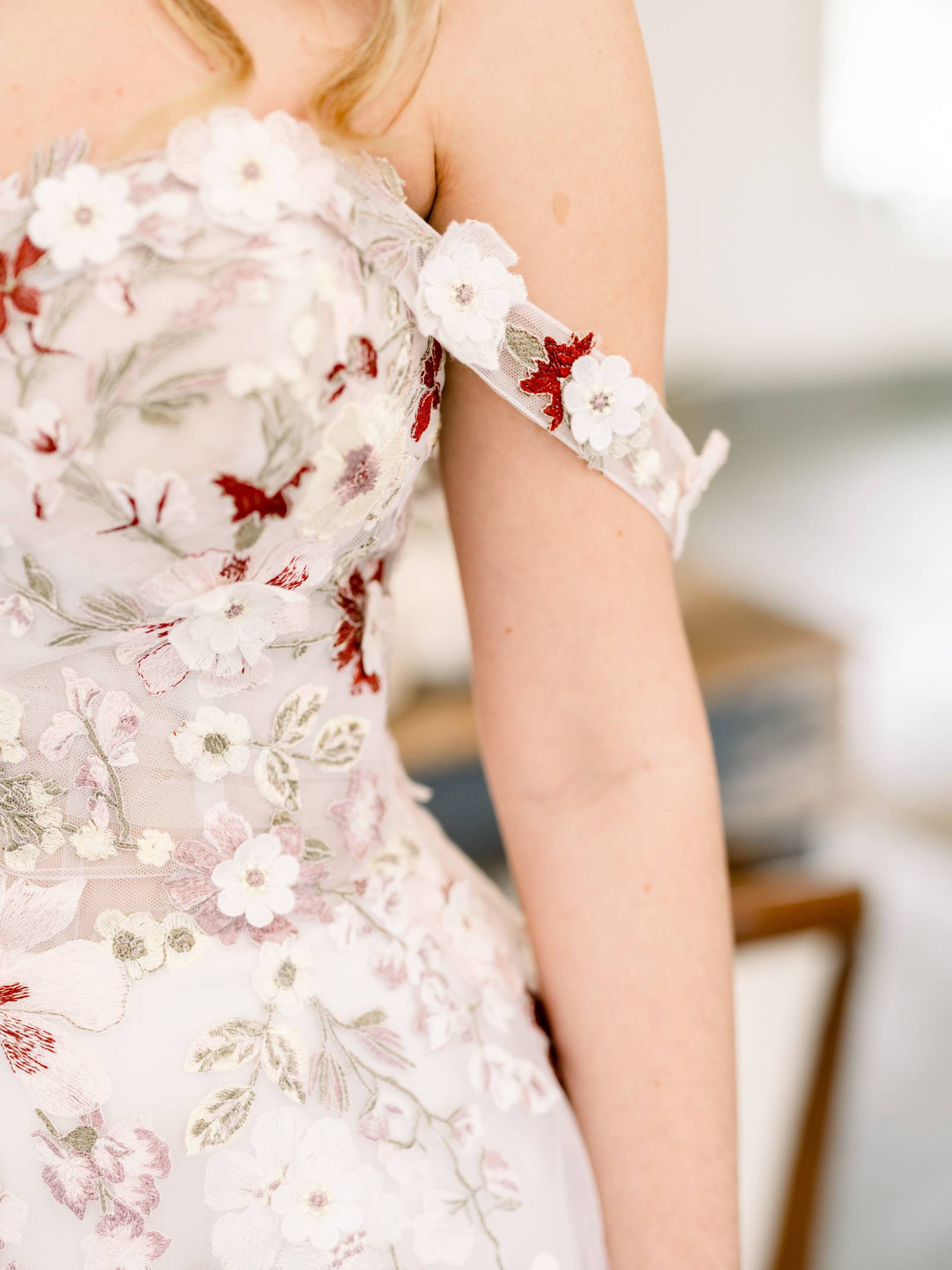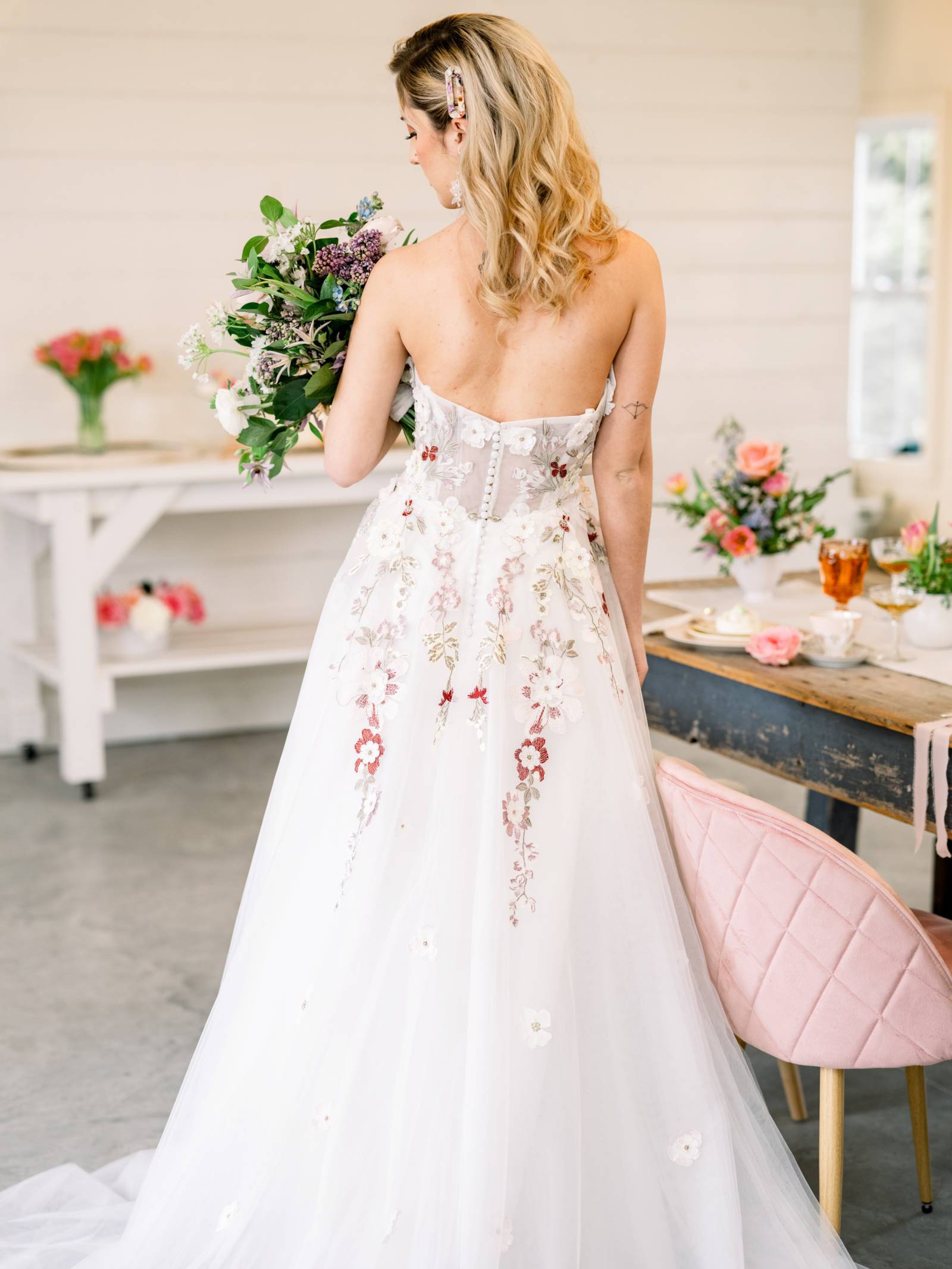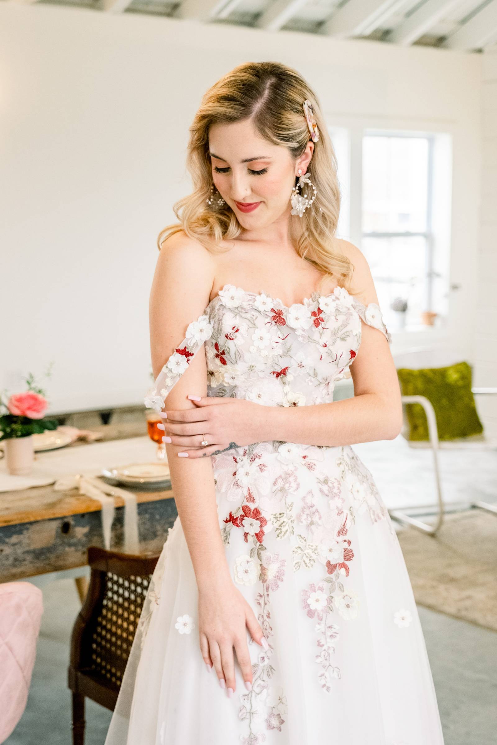 Don’t be afraid to incorporate color and pattern into your wedding day fashion. A romantic gown embellished with colorful flower detailing is a perfect fit for this spring bride.