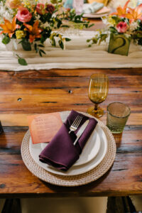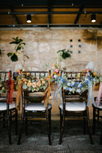 Garver Events’ iconic turn-of-the-century building provides unique character and a beautiful backdrop for this romantic boho scape. Colorful table settings and vibrant florals are balanced with a mix of rustic and organic details like wooden harvest tables, woven chargers, and wicker peacock chairs. We love the look of these floral-draped chairs, adding whimsy and color to everyone joining in on the celebration!