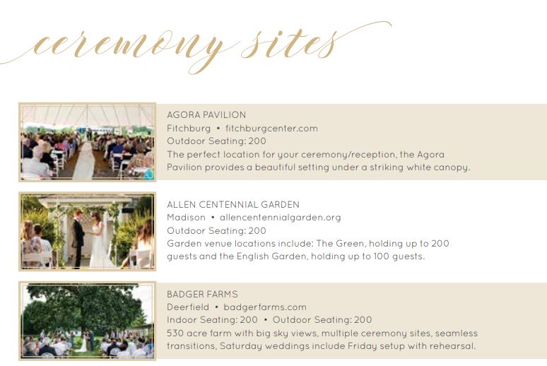 Check out our online Madison and surrounding area ceremony site guide here showcasing indoor/outdoor seating capacity and more details of each venue.