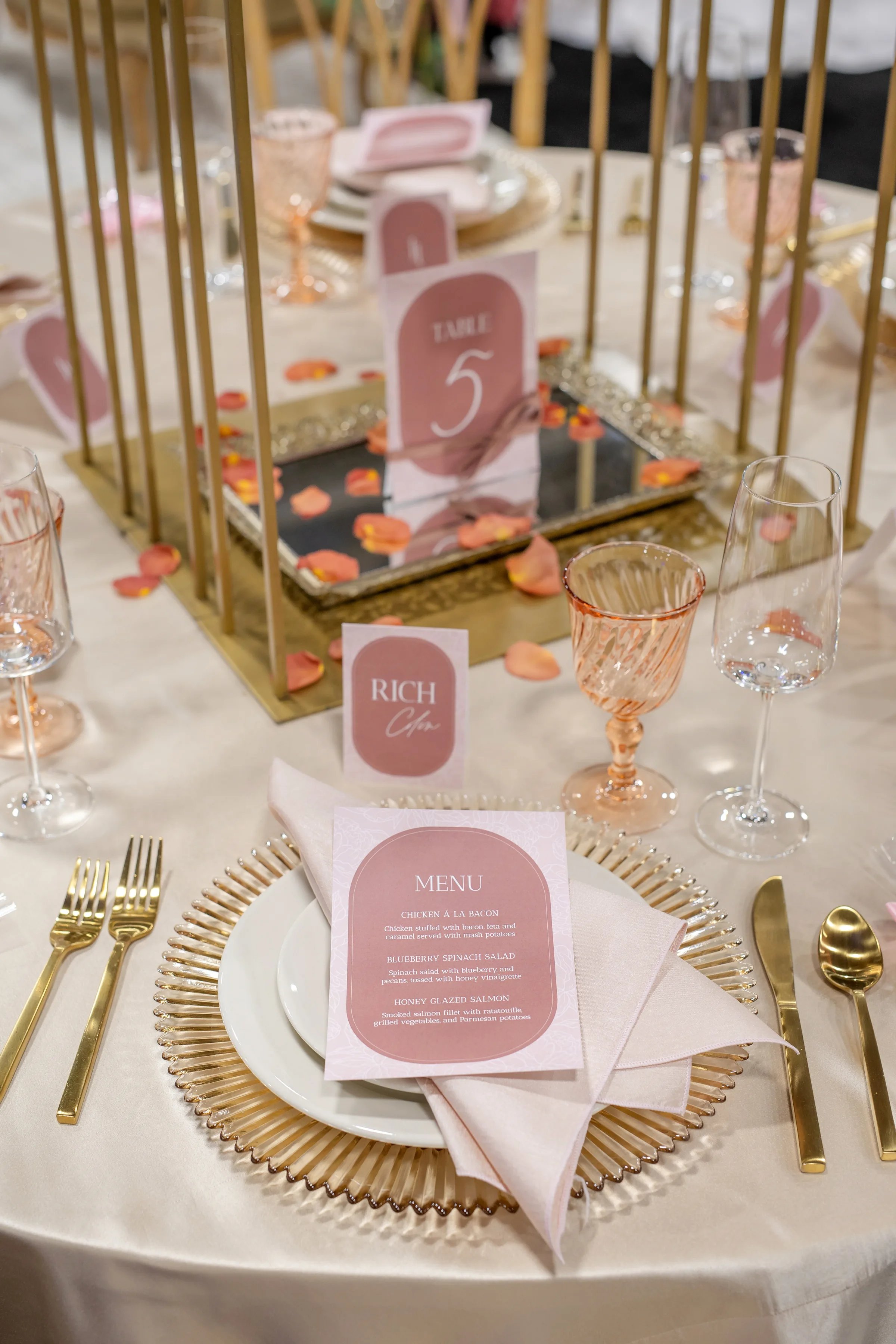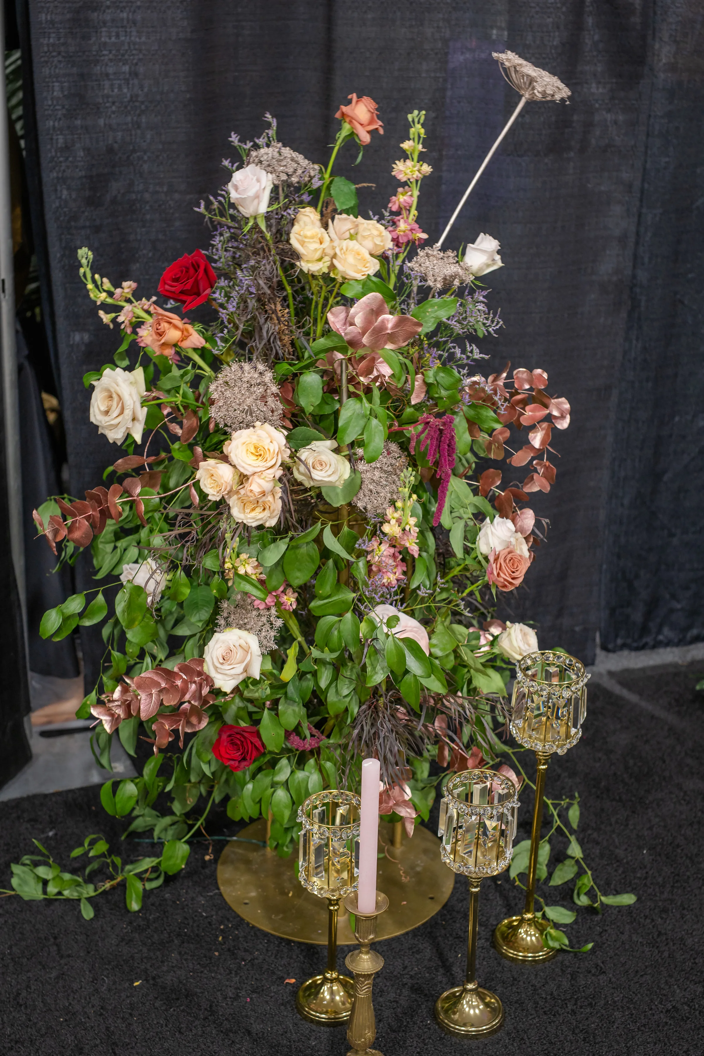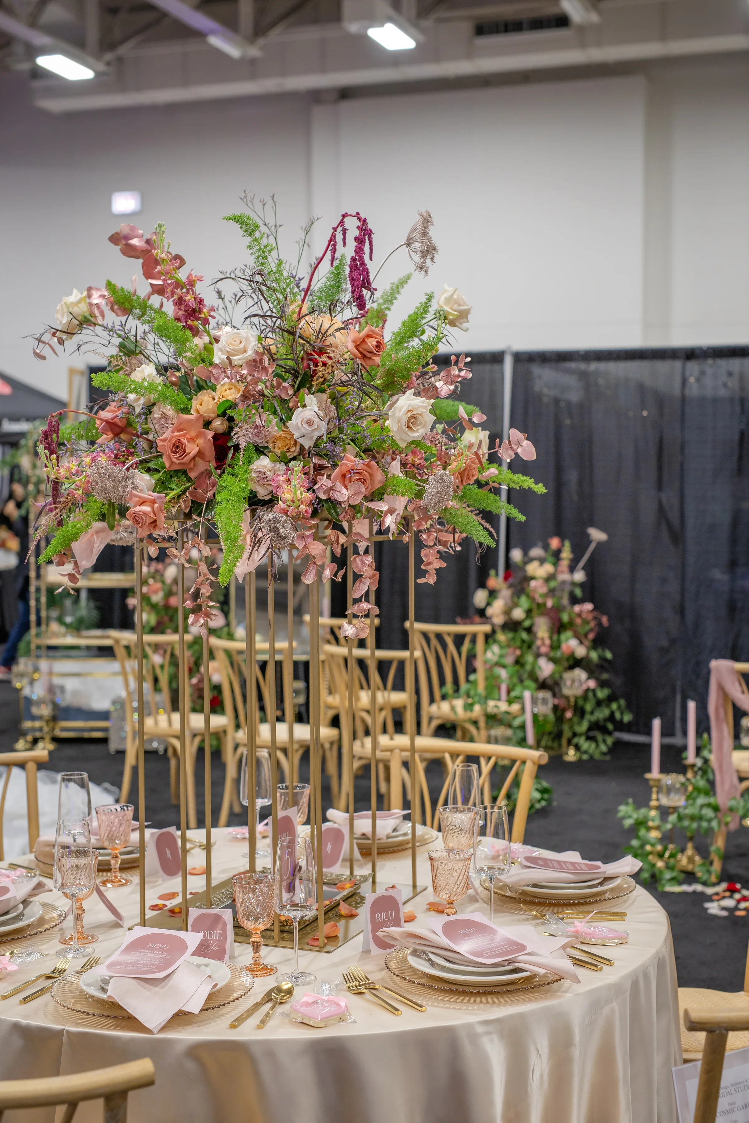 A towering tablescape was a must. Cosmic Gardens provided the florals for the scape, beginning with a grand centerpiece. Blooms and greenery included roses, amaranthus, anthurium, snapdragons, crawling greenery, and painted eucalyptus. The centerpiece was surrounded by clear and tinted crystal glassware, crimped-edge chargers, white plating, gold silverware, and champagne and blush satin linens. Event Essentials and Velvet Rentals provided rental pieces throughout the design.