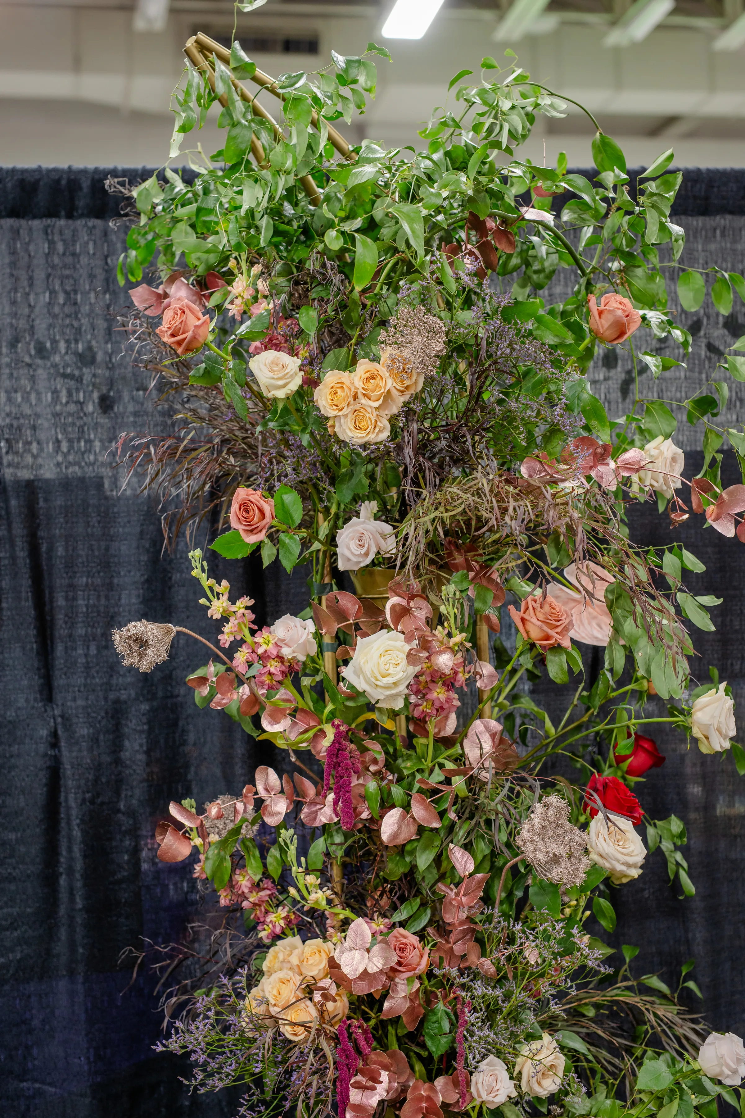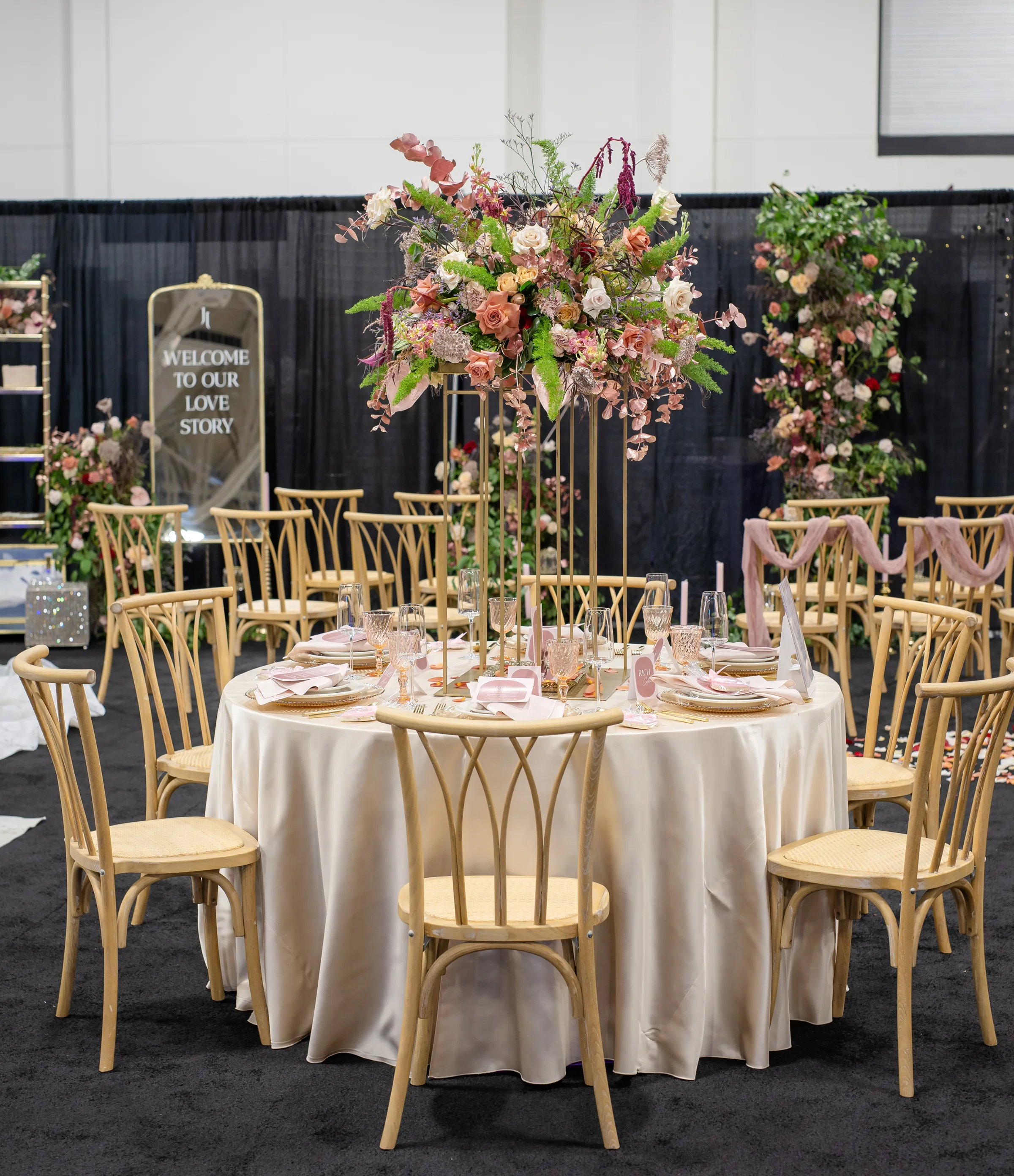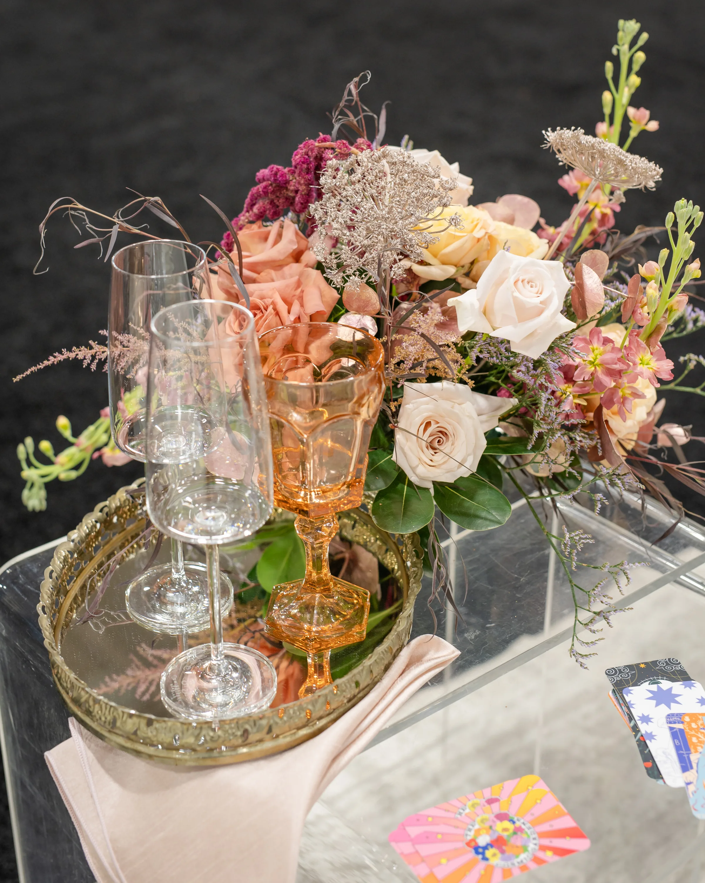 A towering tablescape was a must. Cosmic Gardens provided the florals for the scape, beginning with a grand centerpiece. Blooms and greenery included roses, amaranthus, anthurium, snapdragons, crawling greenery, and painted eucalyptus. The centerpiece was surrounded by clear and tinted crystal glassware, crimped-edge chargers, white plating, gold silverware, and champagne and blush satin linens. Event Essentials and Velvet Rentals provided rental pieces throughout the design.