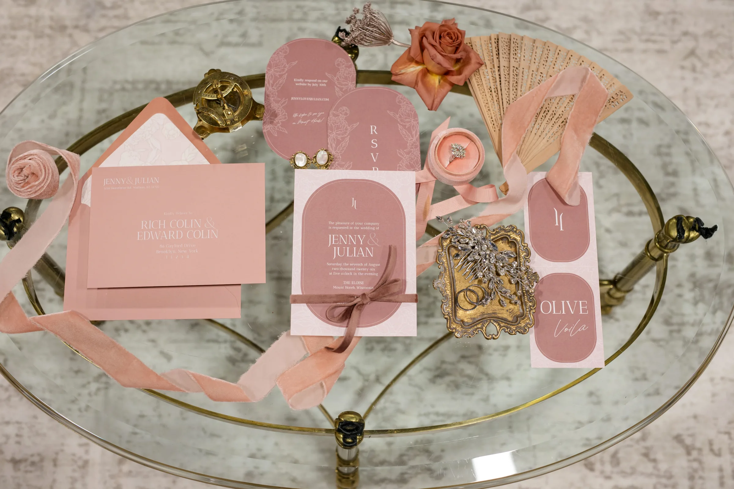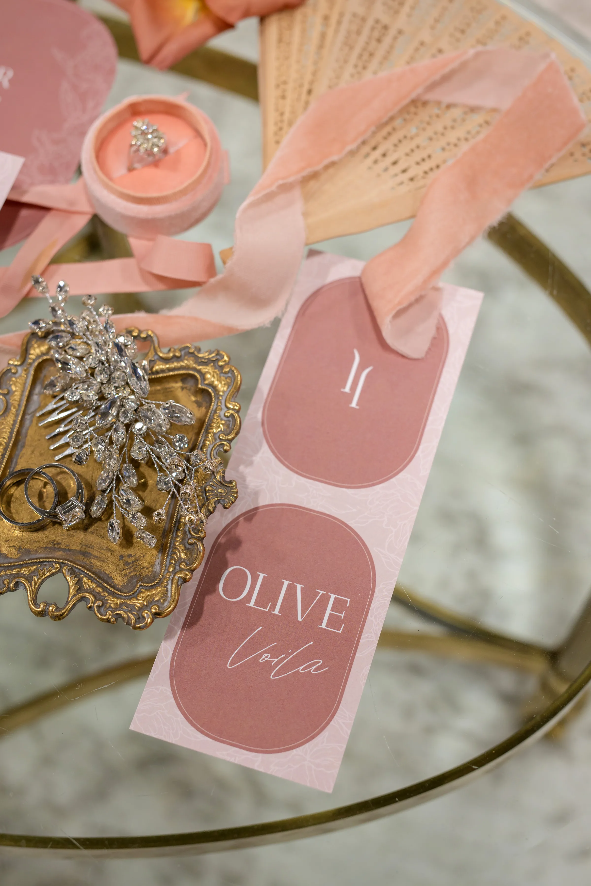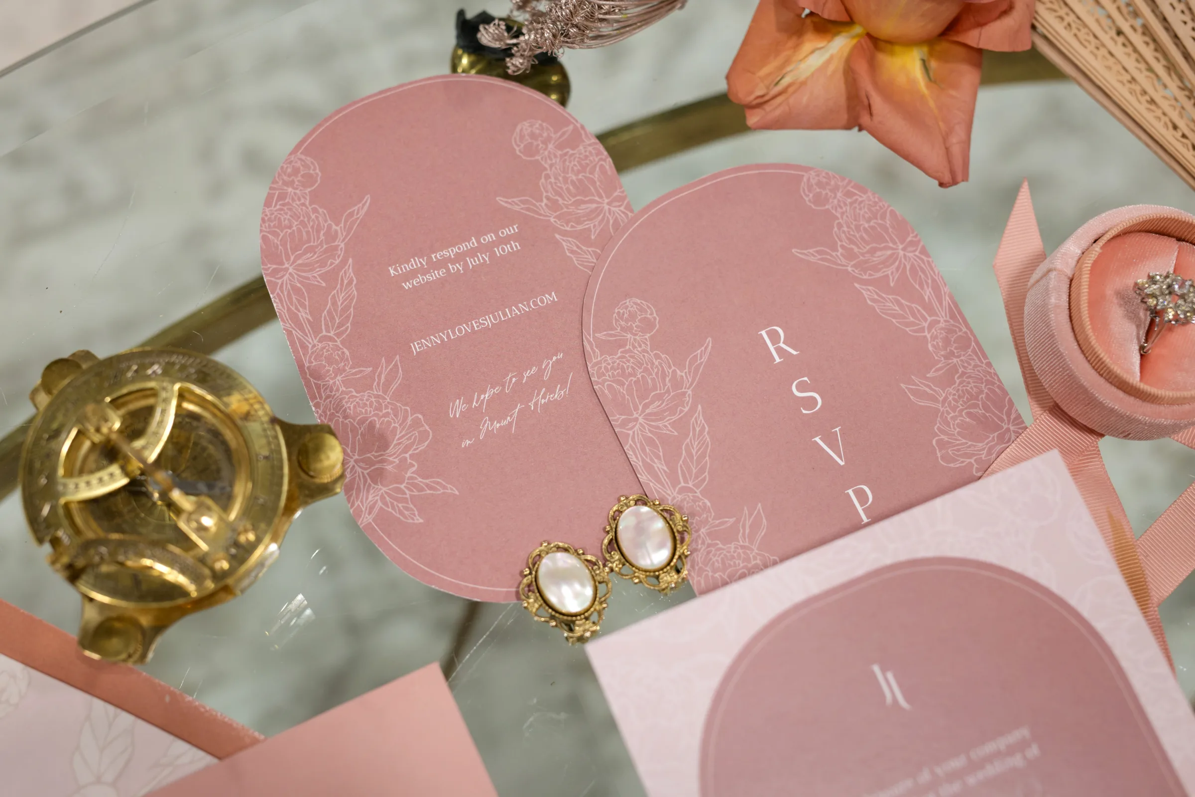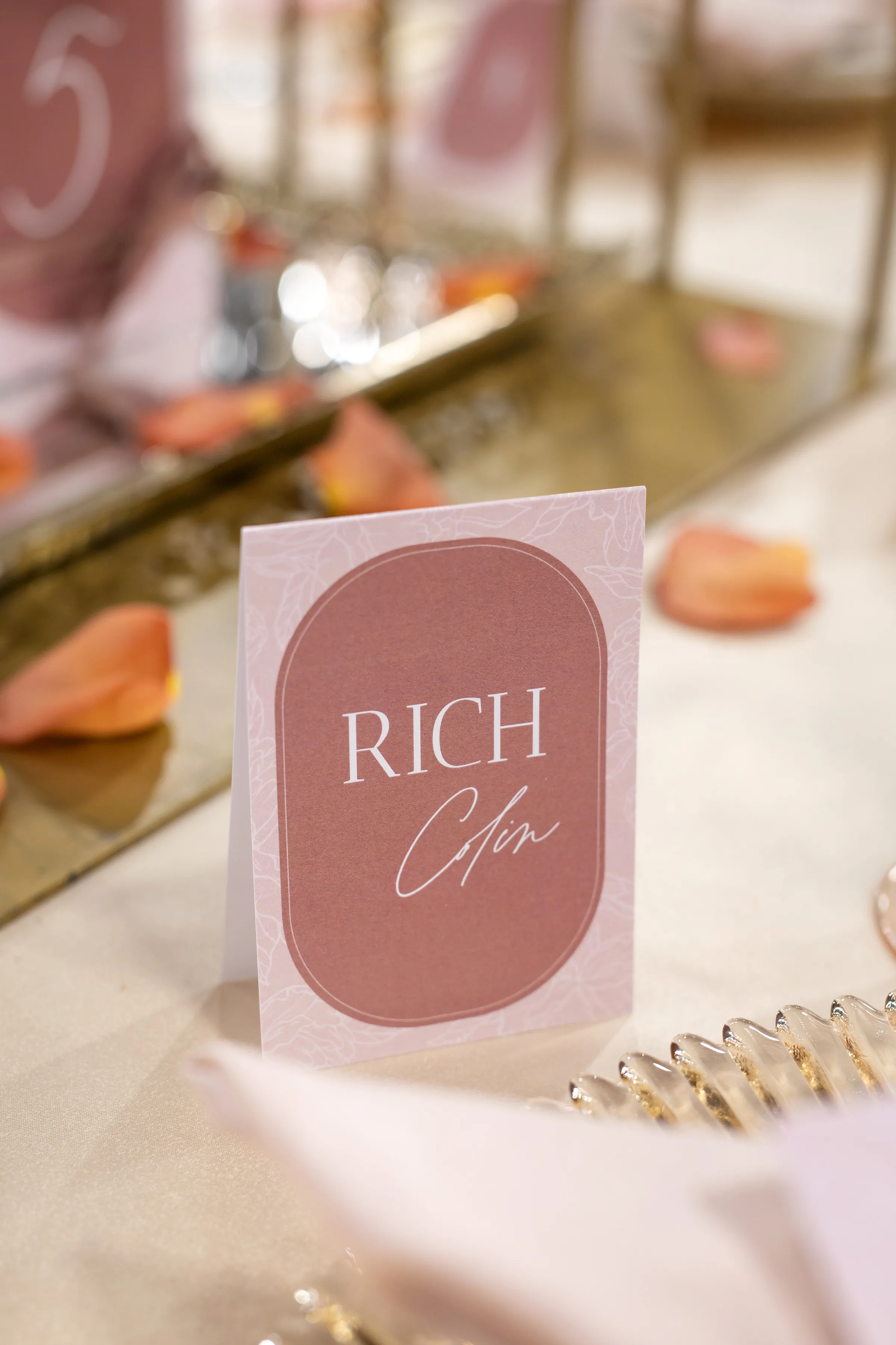 Coordinator LK Bridal drew inspiration from Regency Era romances, like those of Jane Austen and more recent cultural phenomena like Bridgerton, but also strove to incorporate modern elements into the styling. They began by creating a stationery suite that combined solid colors with contour cuts and detailed, monochromatic, flower motifs.