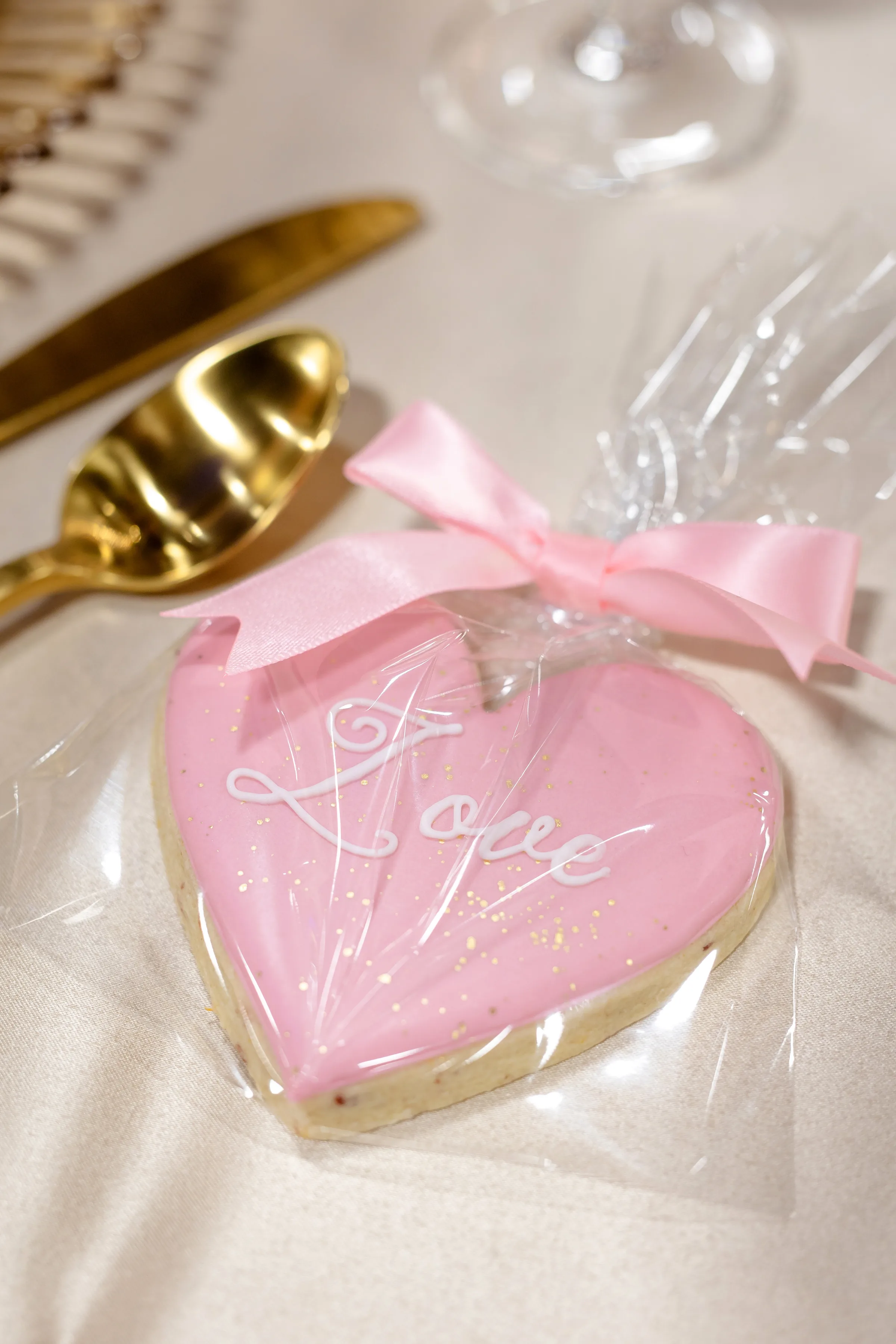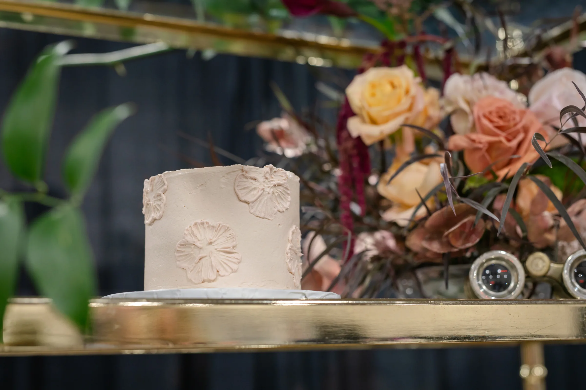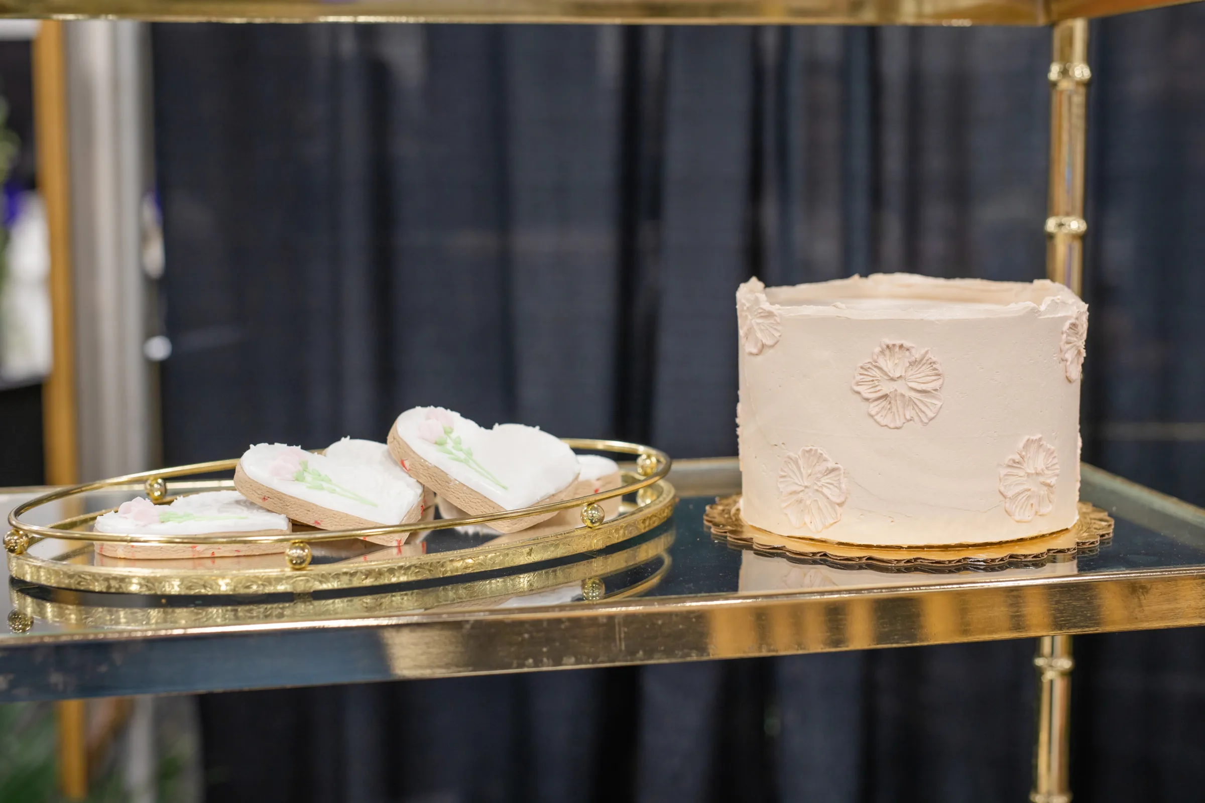 Sandy Cakes designed a three-tier cake, with separate layers artfully arranged across the levels of an antique shelf. Cookies from Princess J Cookie Creations also adorned the shelves and served as favors at the tablescape.