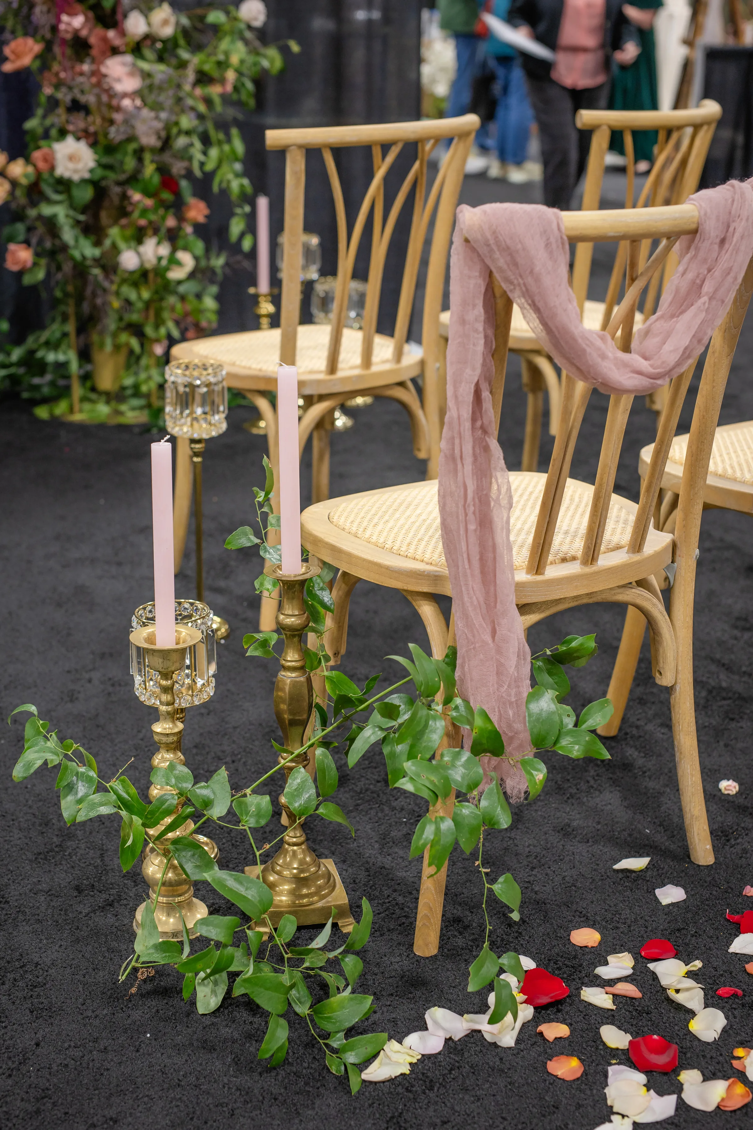 Florals continued at the ceremony scene, which featured a lush, asymmetrical arch backdrop. Other details included natural willow rattan seating, tulle draping, shimmering candle holders, and blush candles in brass candle holders of varying heights and designs.